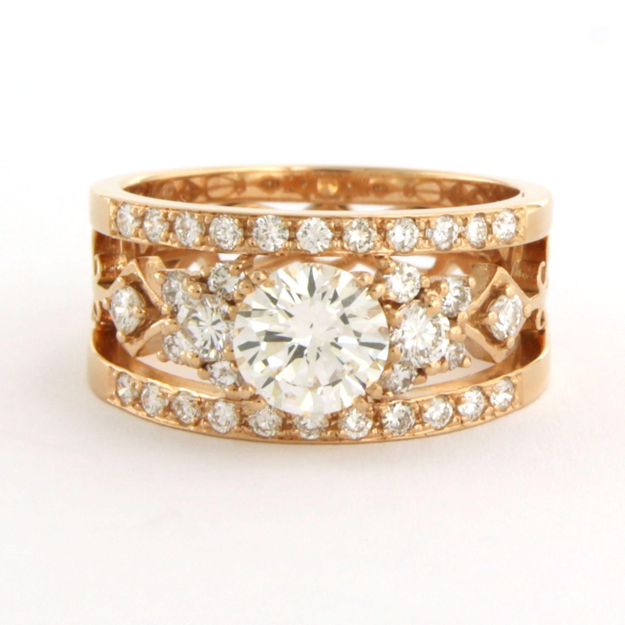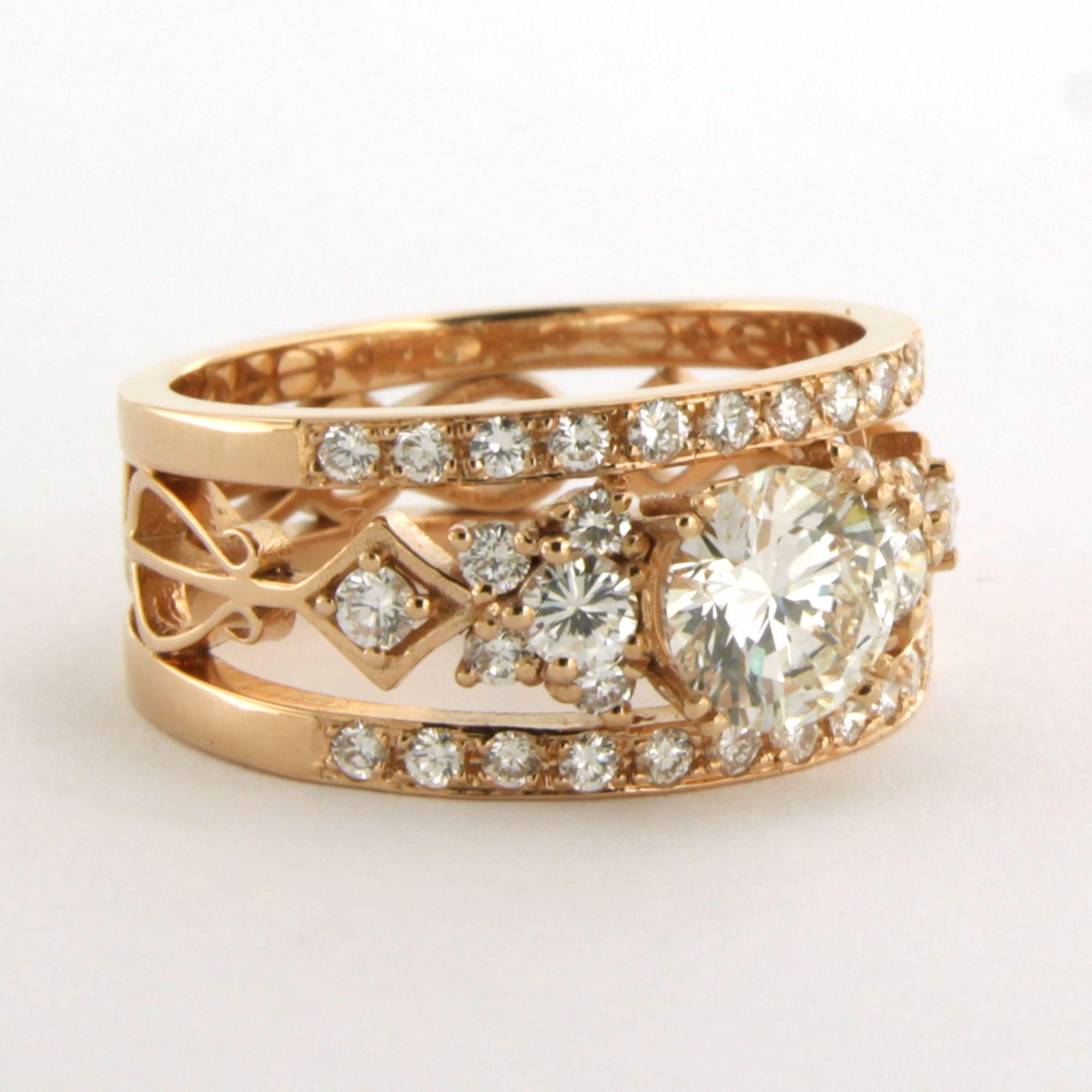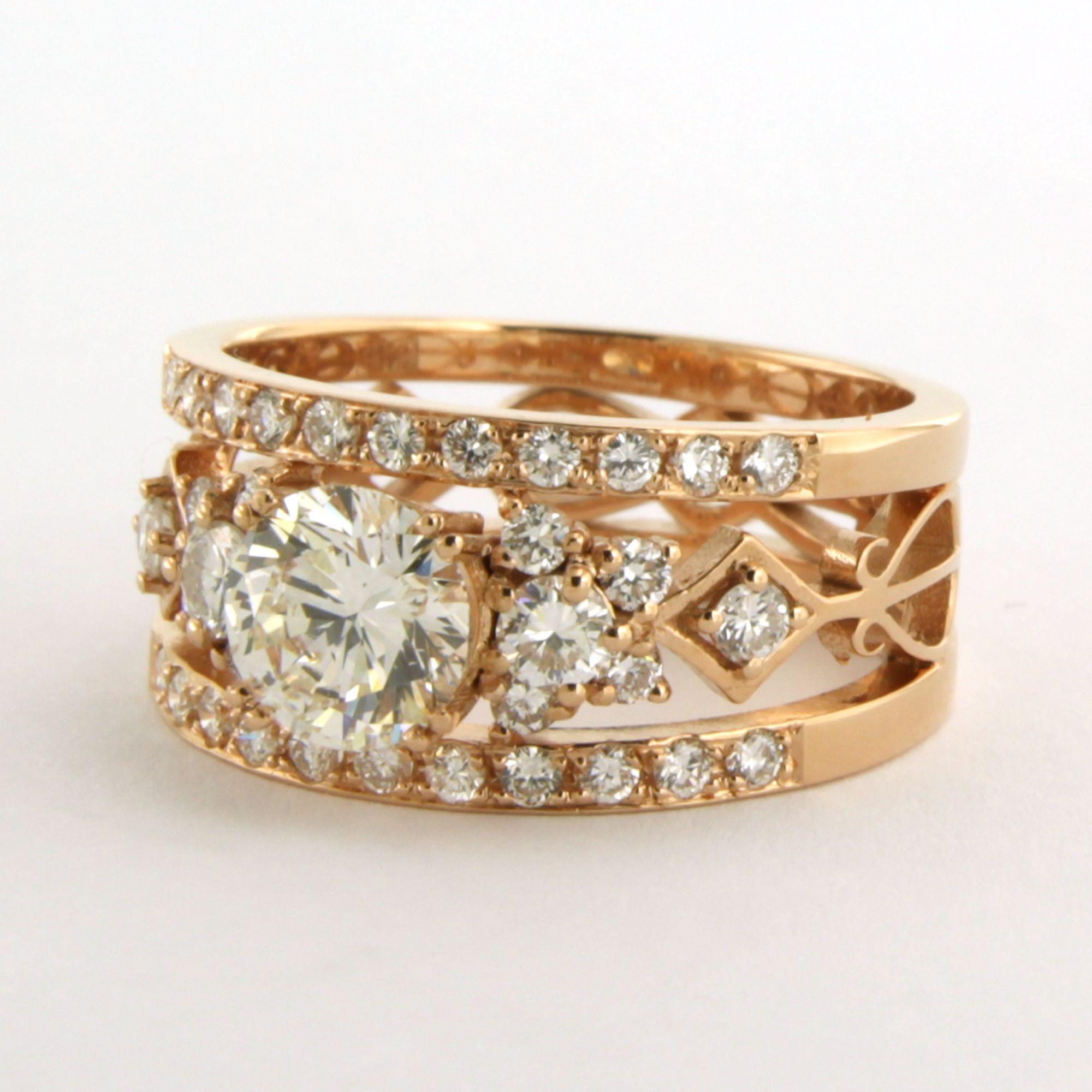 18 Kt. rosé gouden band ring bezet met centraal een briljant geslepen diamant tot. 1.09ct - I/J - SI1 - volgens HRD report - en erom heen briljant geslepen diamanten tot. 0.78ct - ringmaat 17.5 (55)