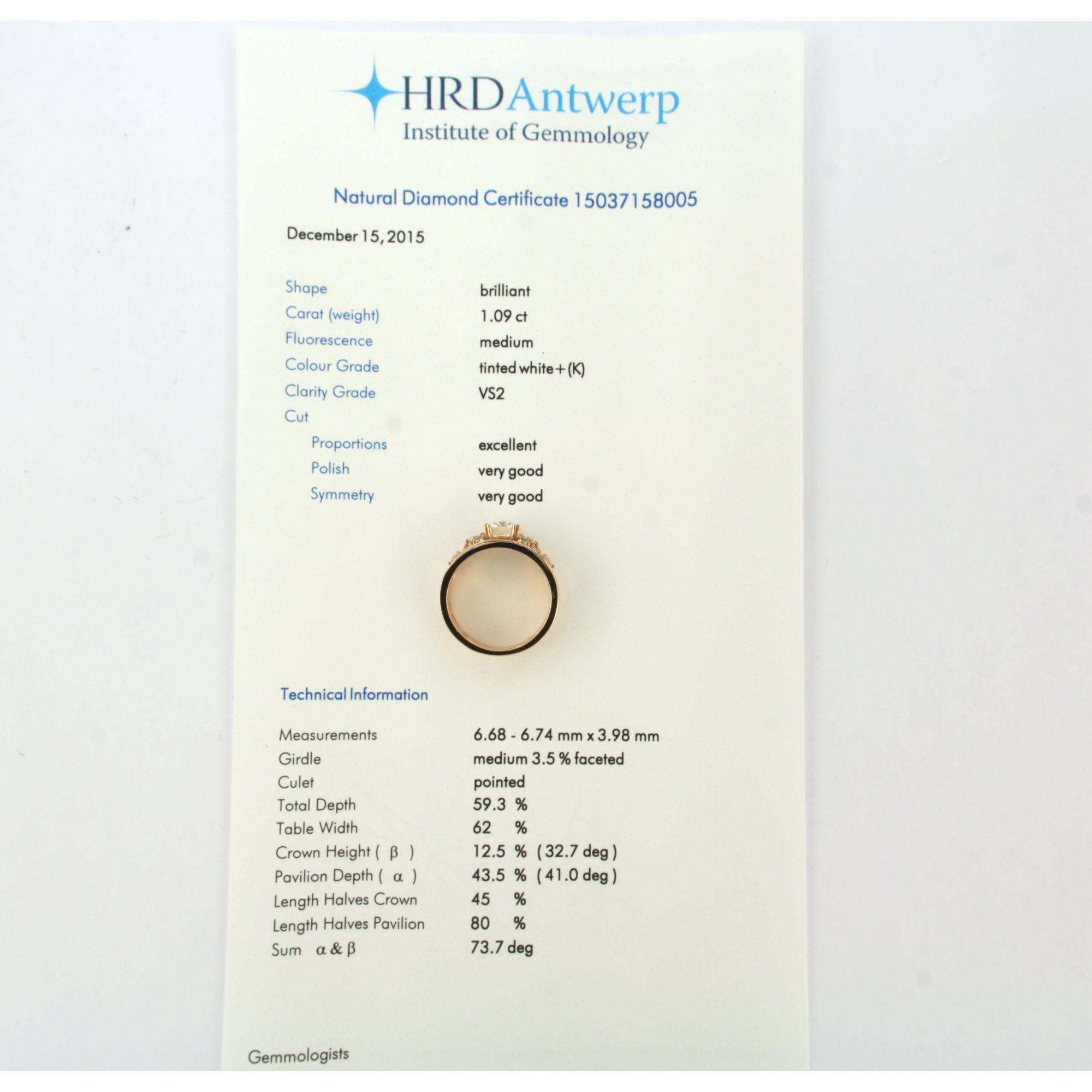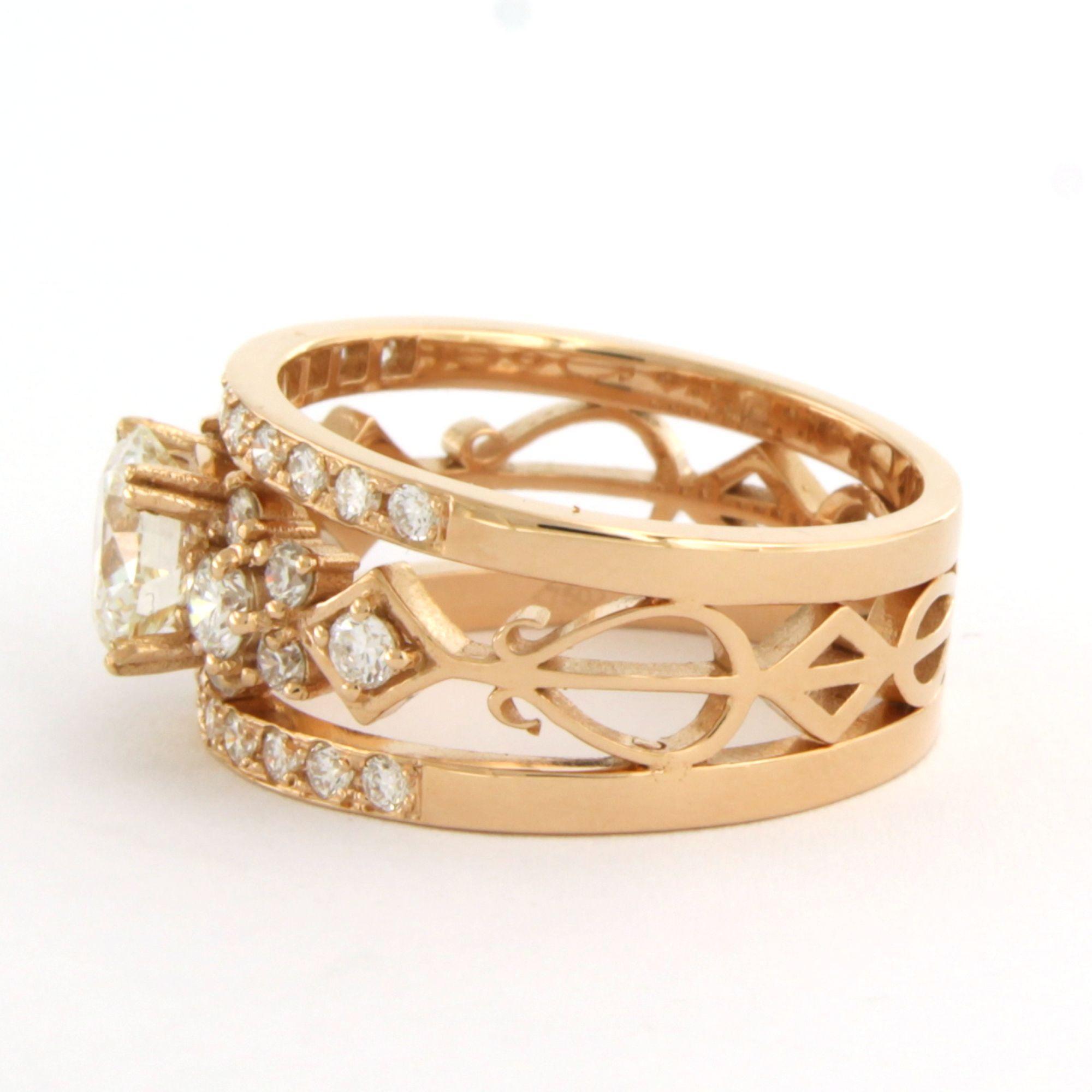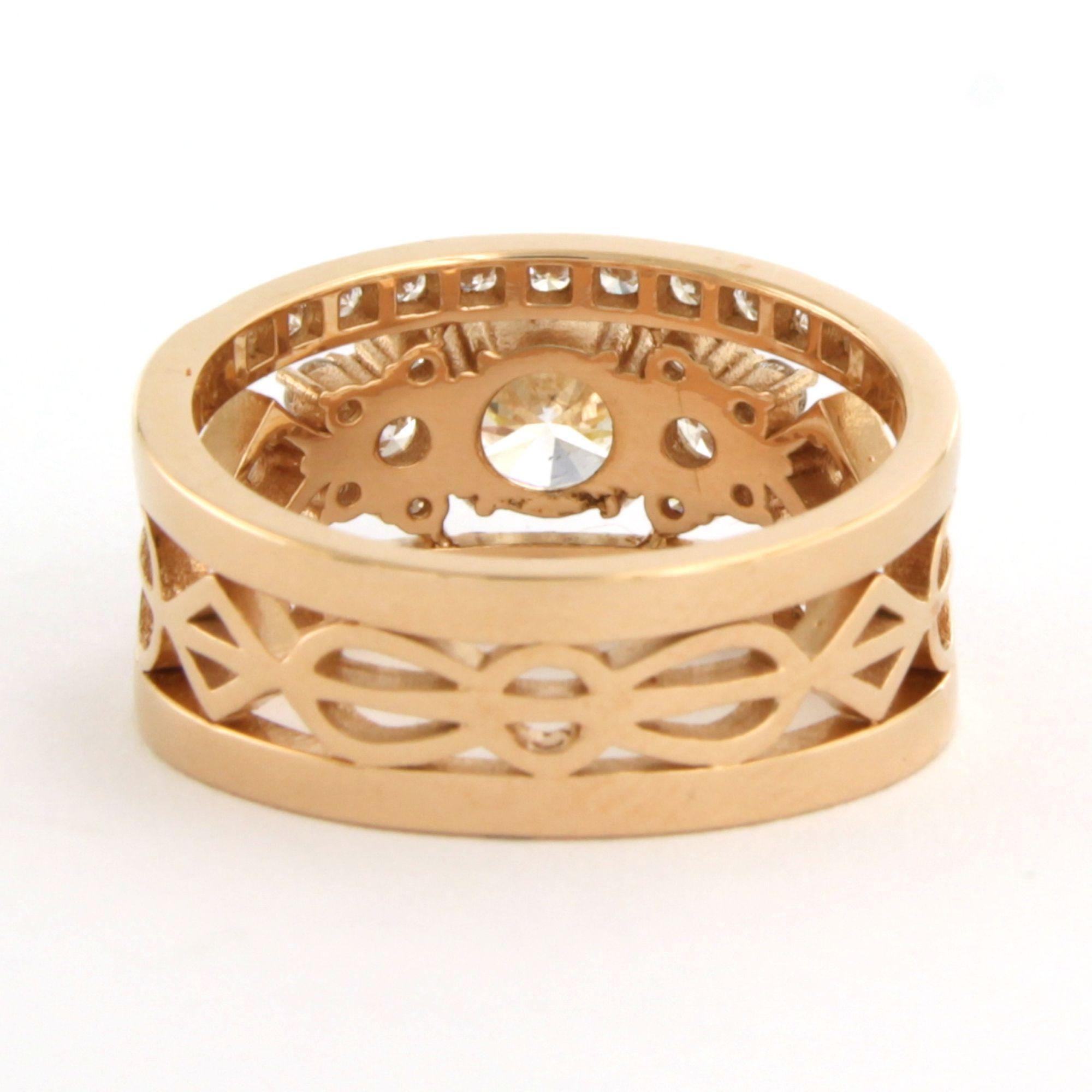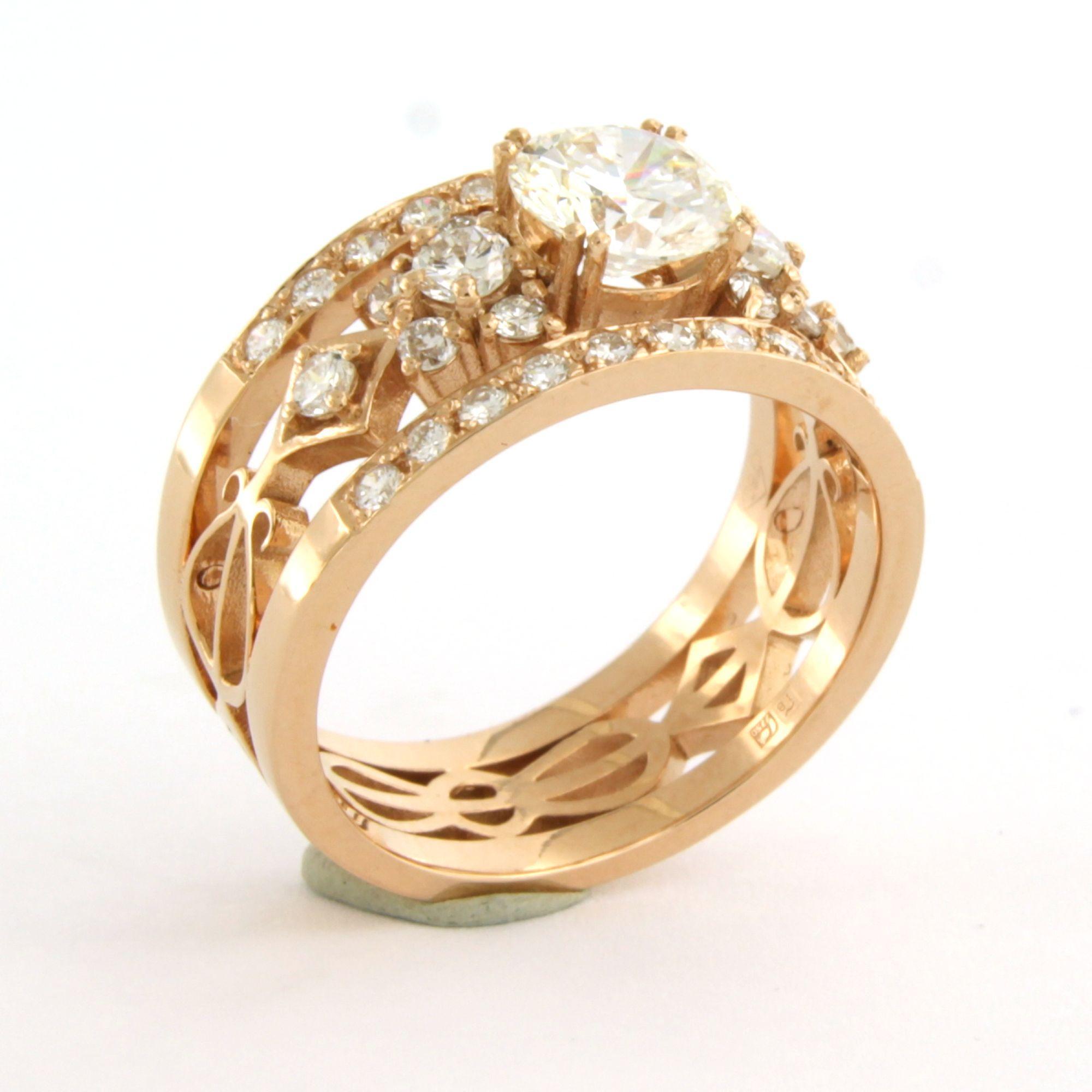 18 Kt. rosé gouden band ring bezet met centraal een briljant geslepen diamant tot. 1.09ct - I/J - SI1 - volgens HRD report - en erom heen briljant geslepen diamanten tot. 0.78ct - ringmaat 17.5 (55)
