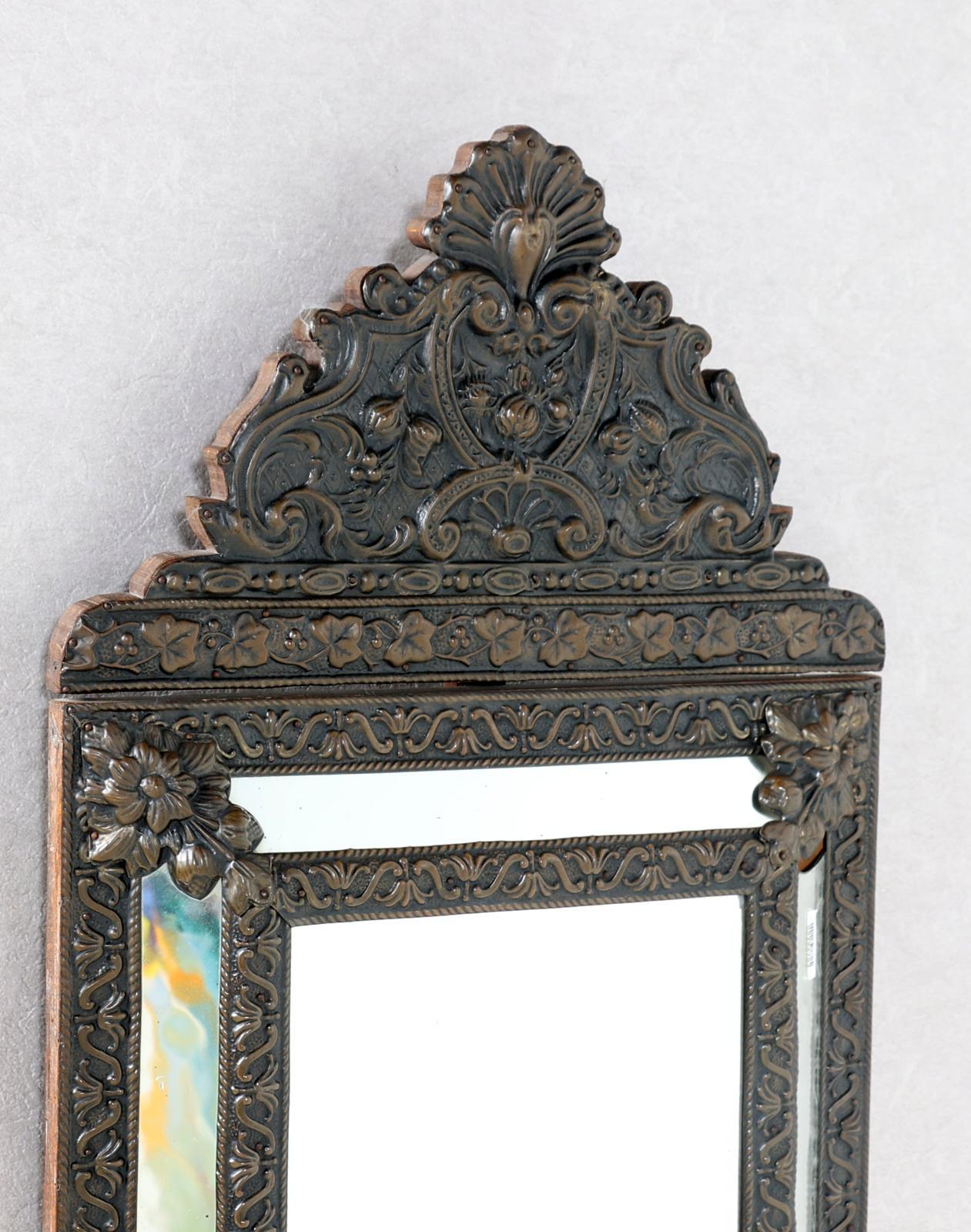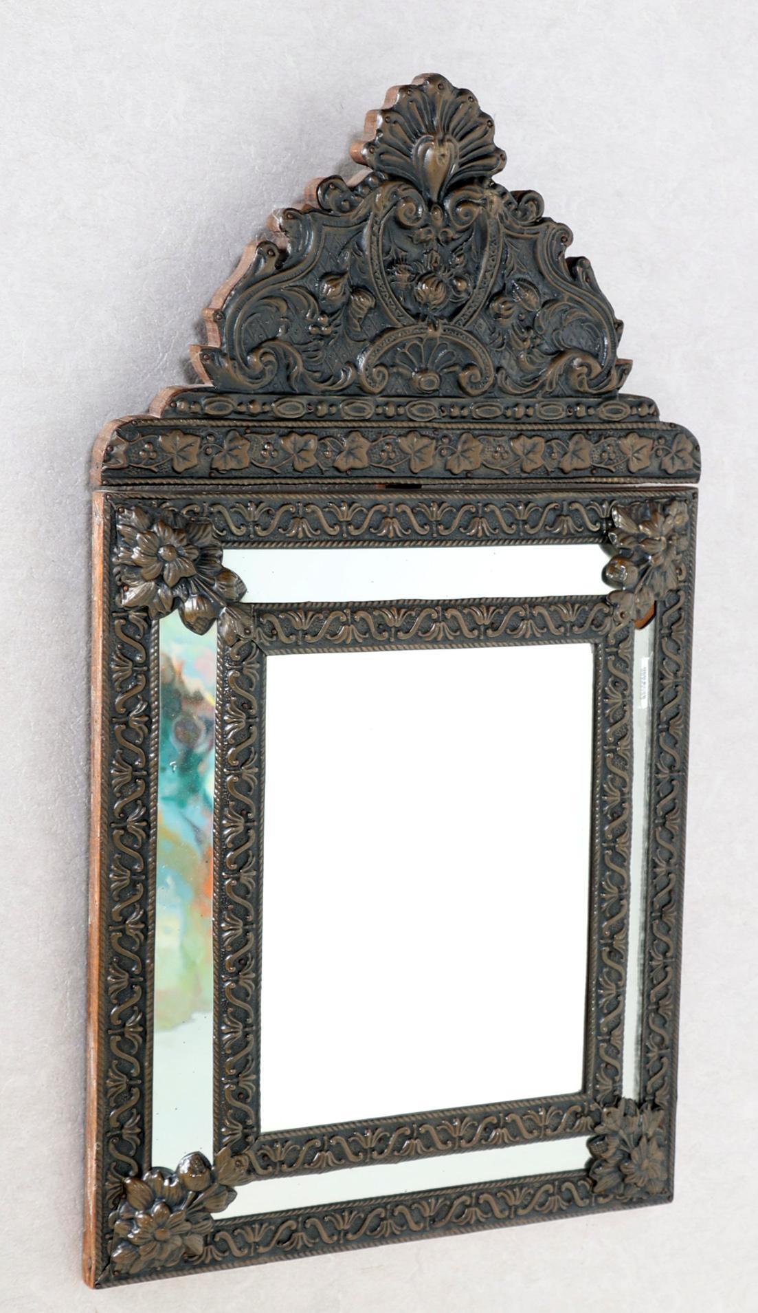 Oude koperen wandspiegel met kuif, 71 x 42 cm.
