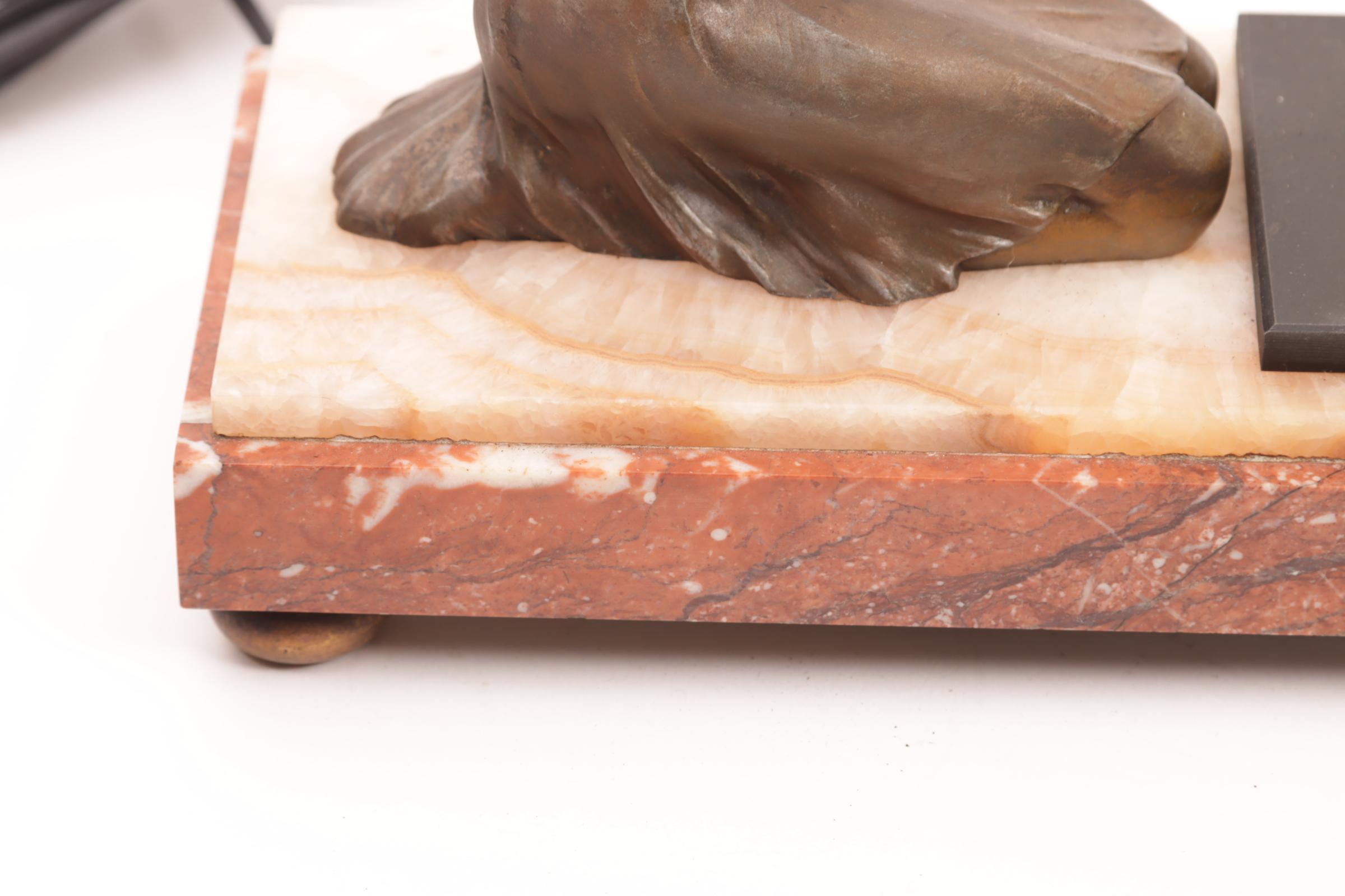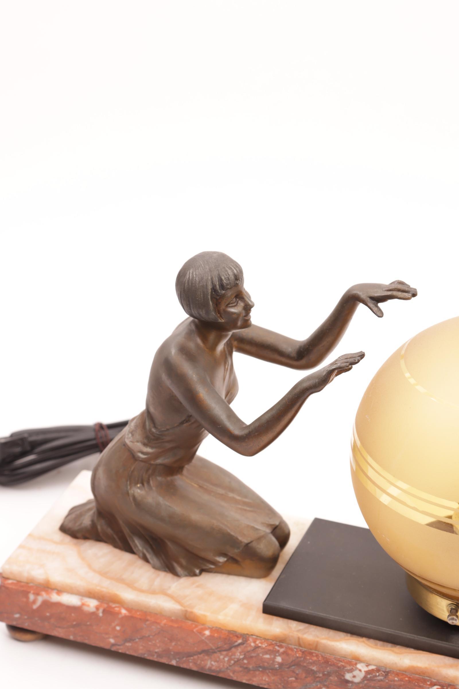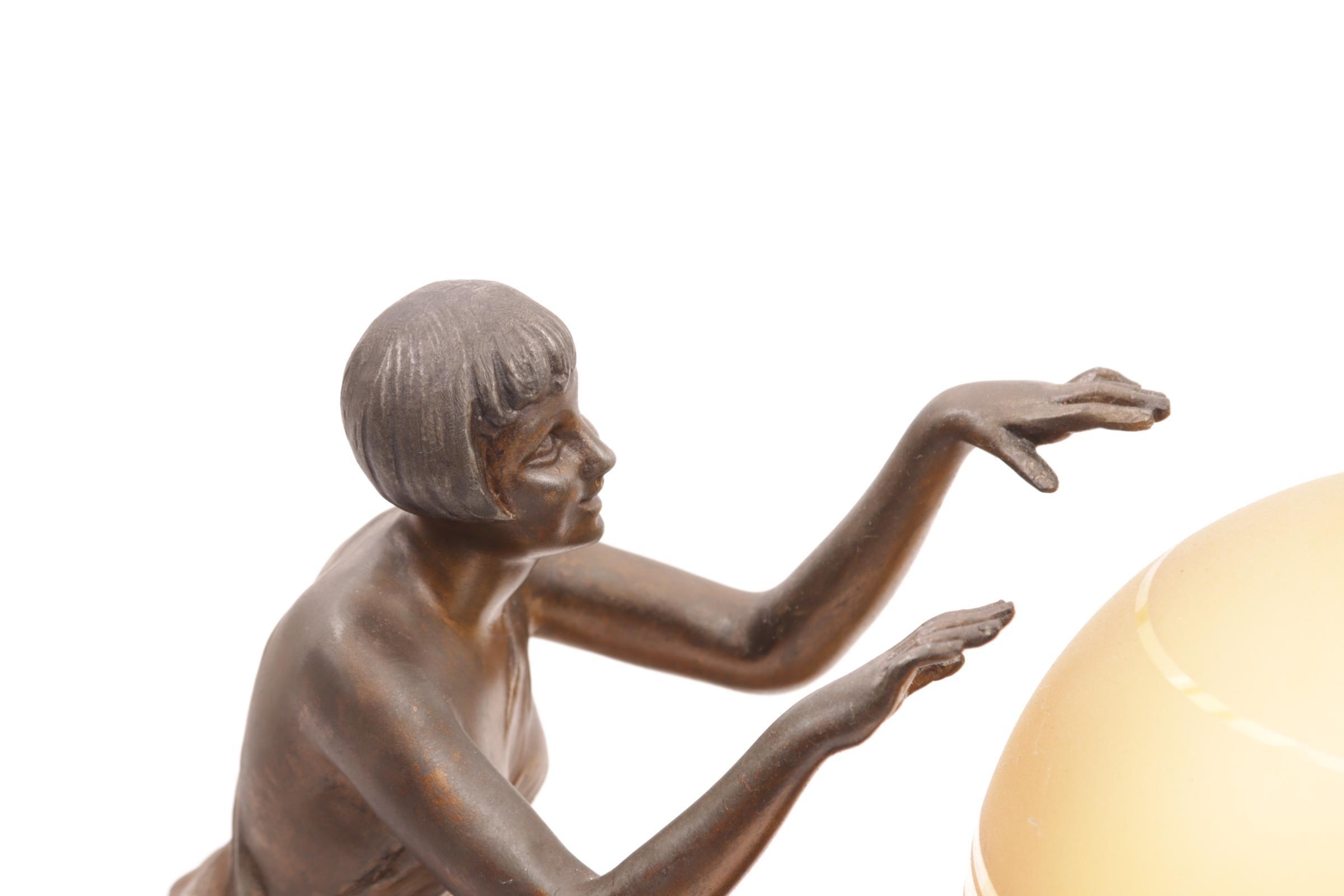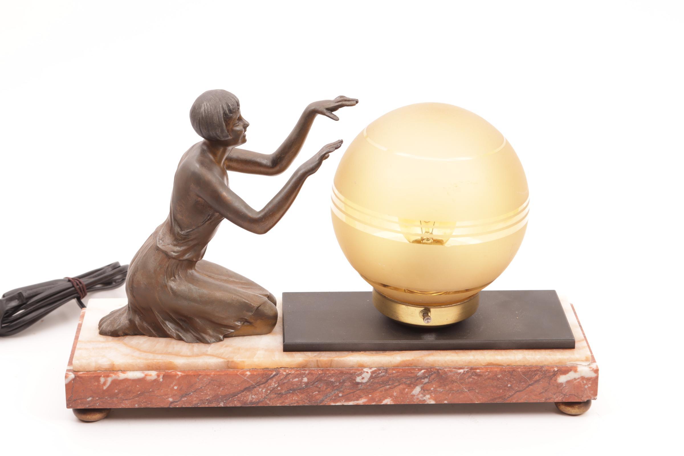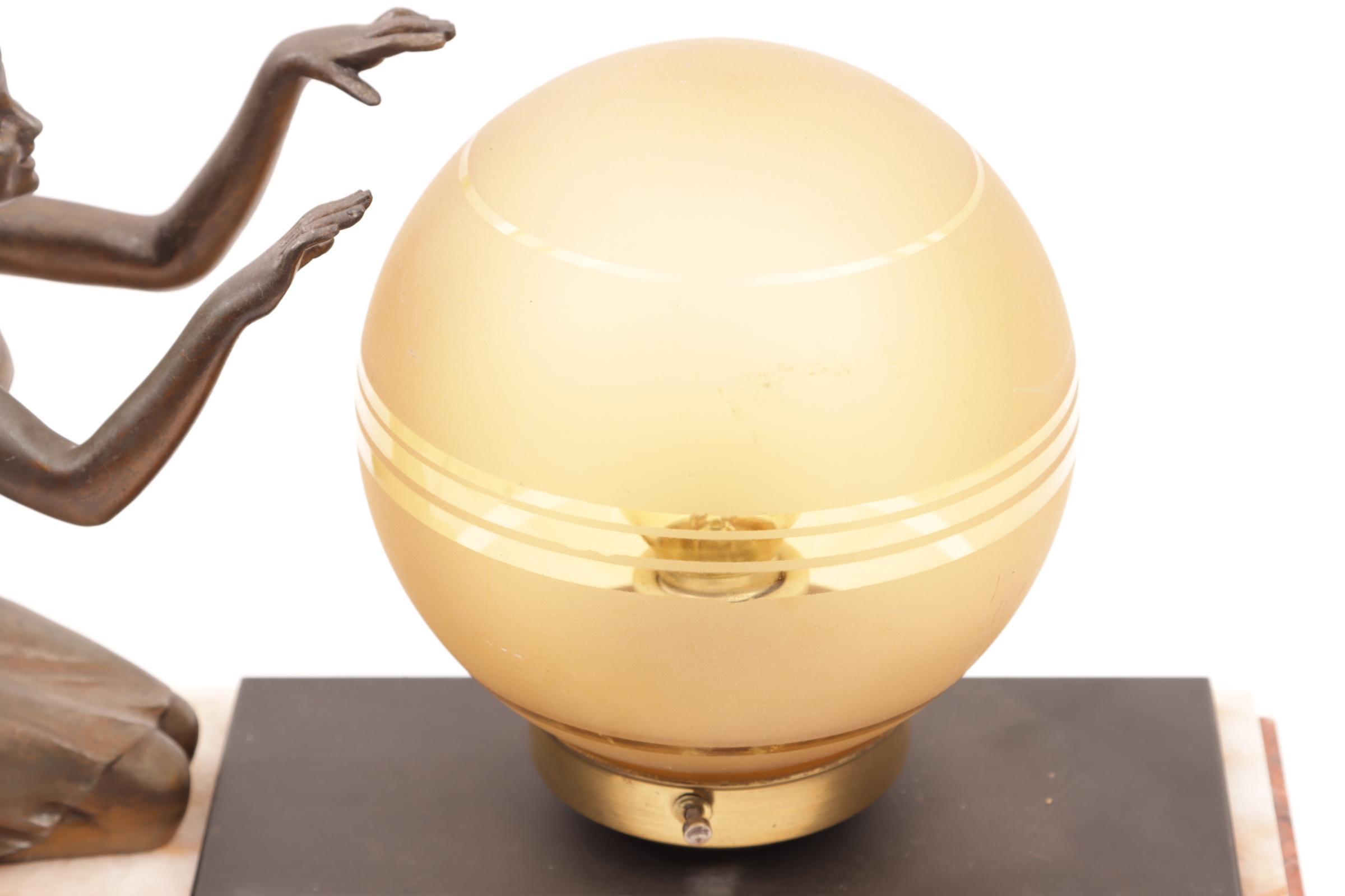 Art Deco tafellamp met voorstelling van een dame en amberkleurige glazen bol op marmeren voetstuk, h.25 cm.