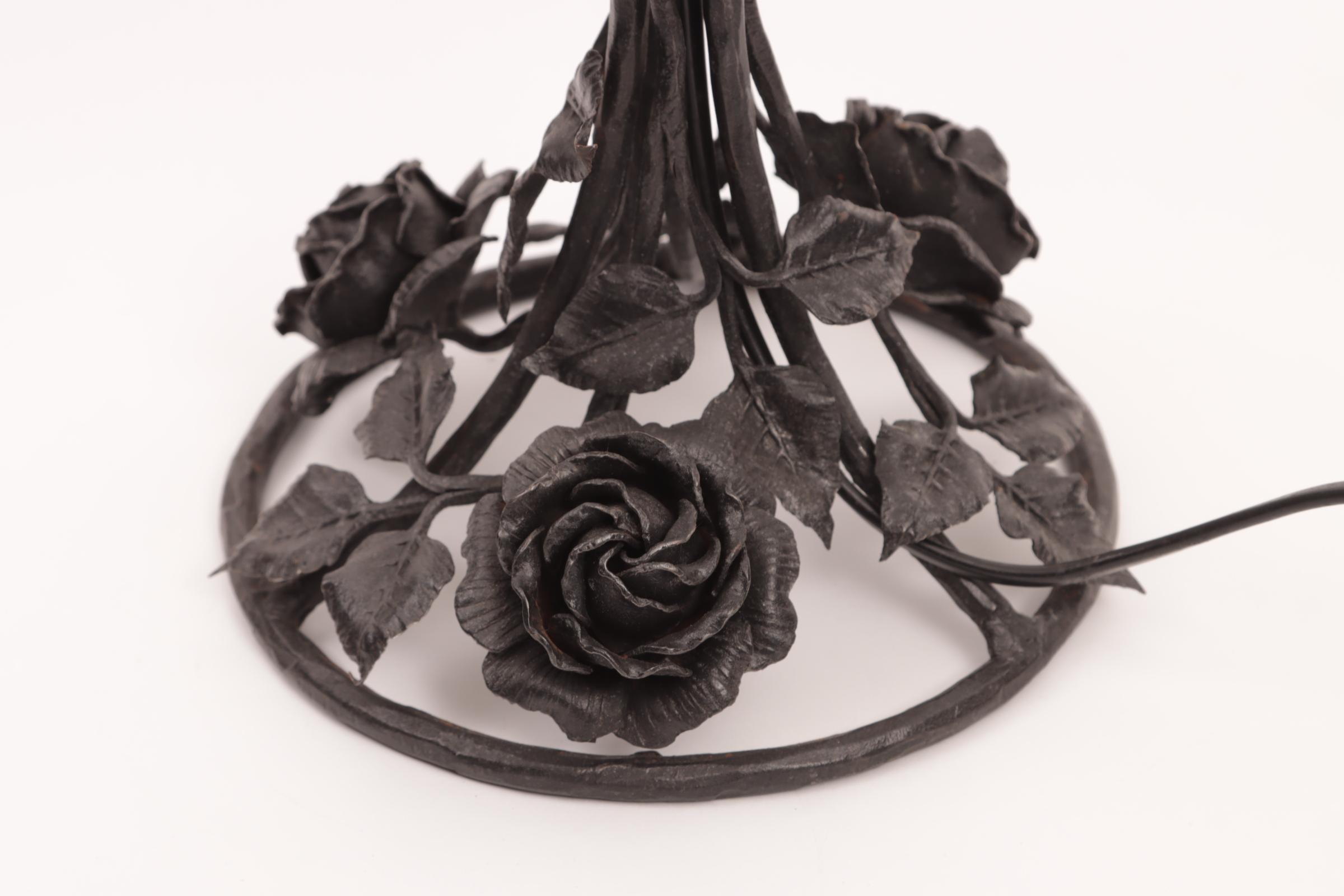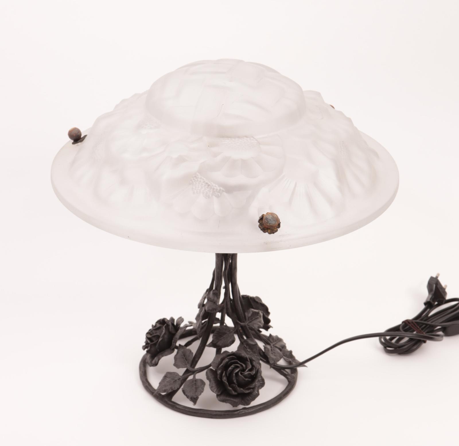 Art Deco tafellamp op smeedijzeren voet met rozendecor en gesatineerd glazen kap in hoogreliëf, h.34 cm.