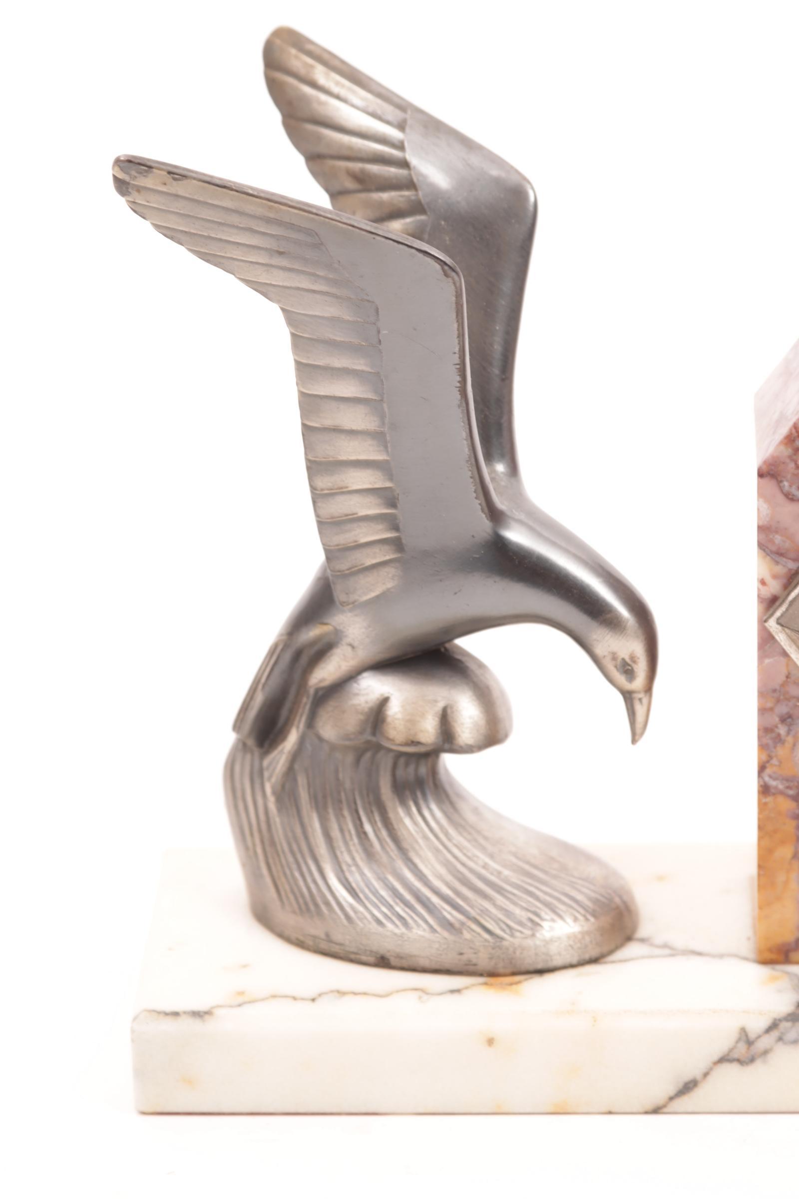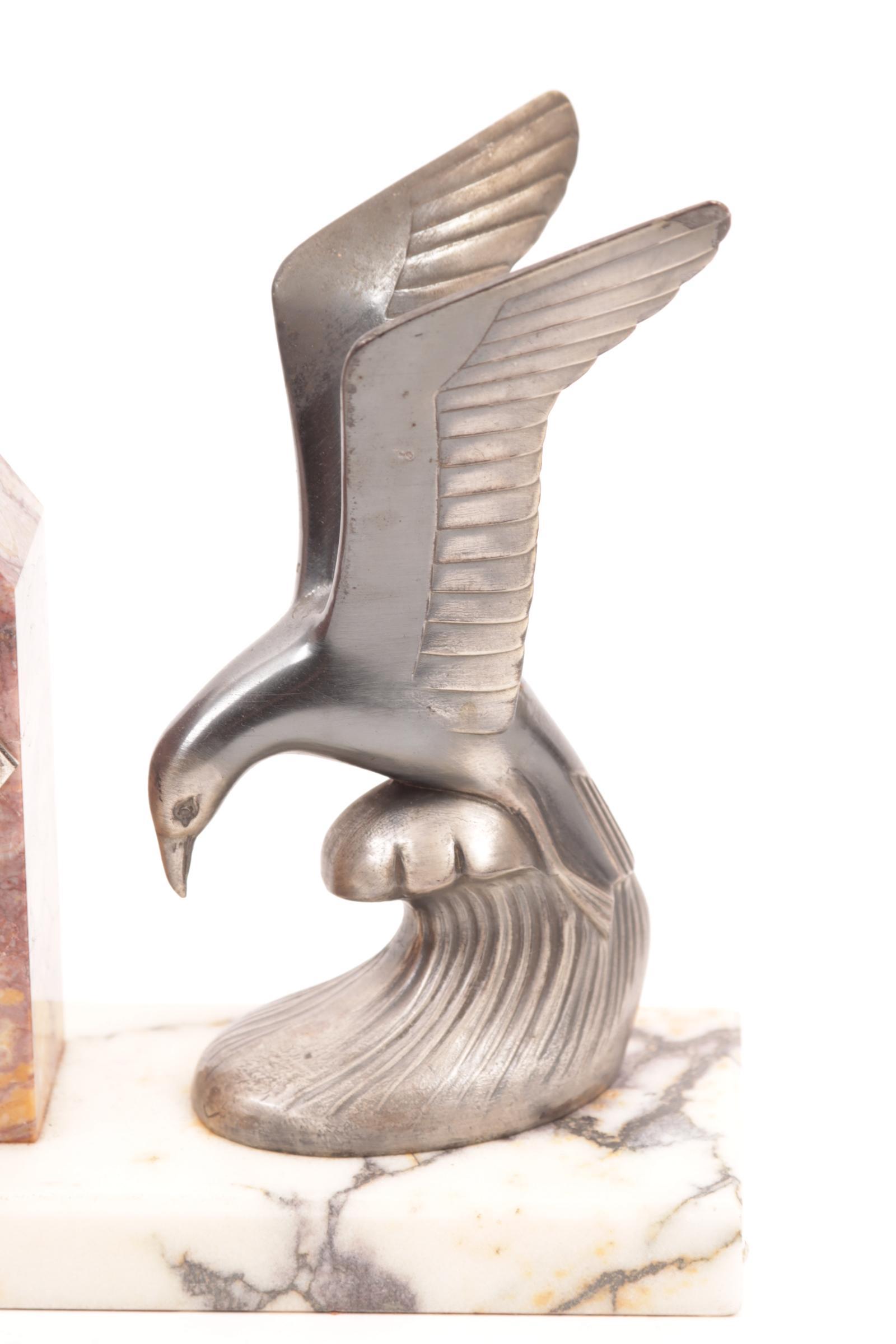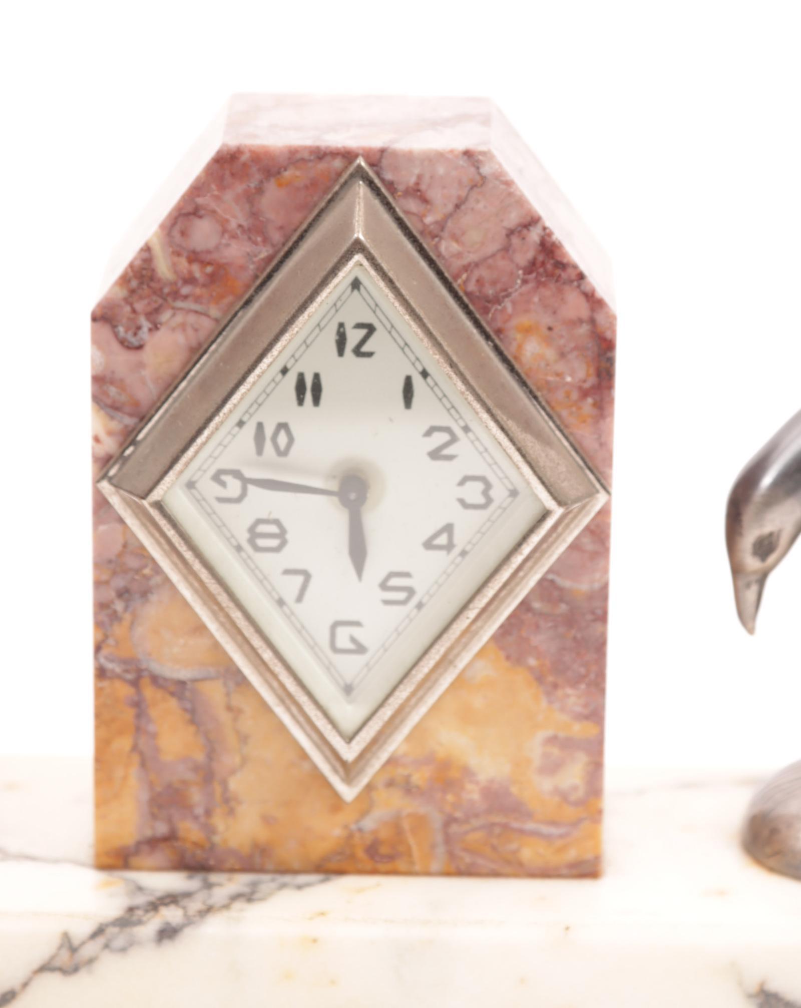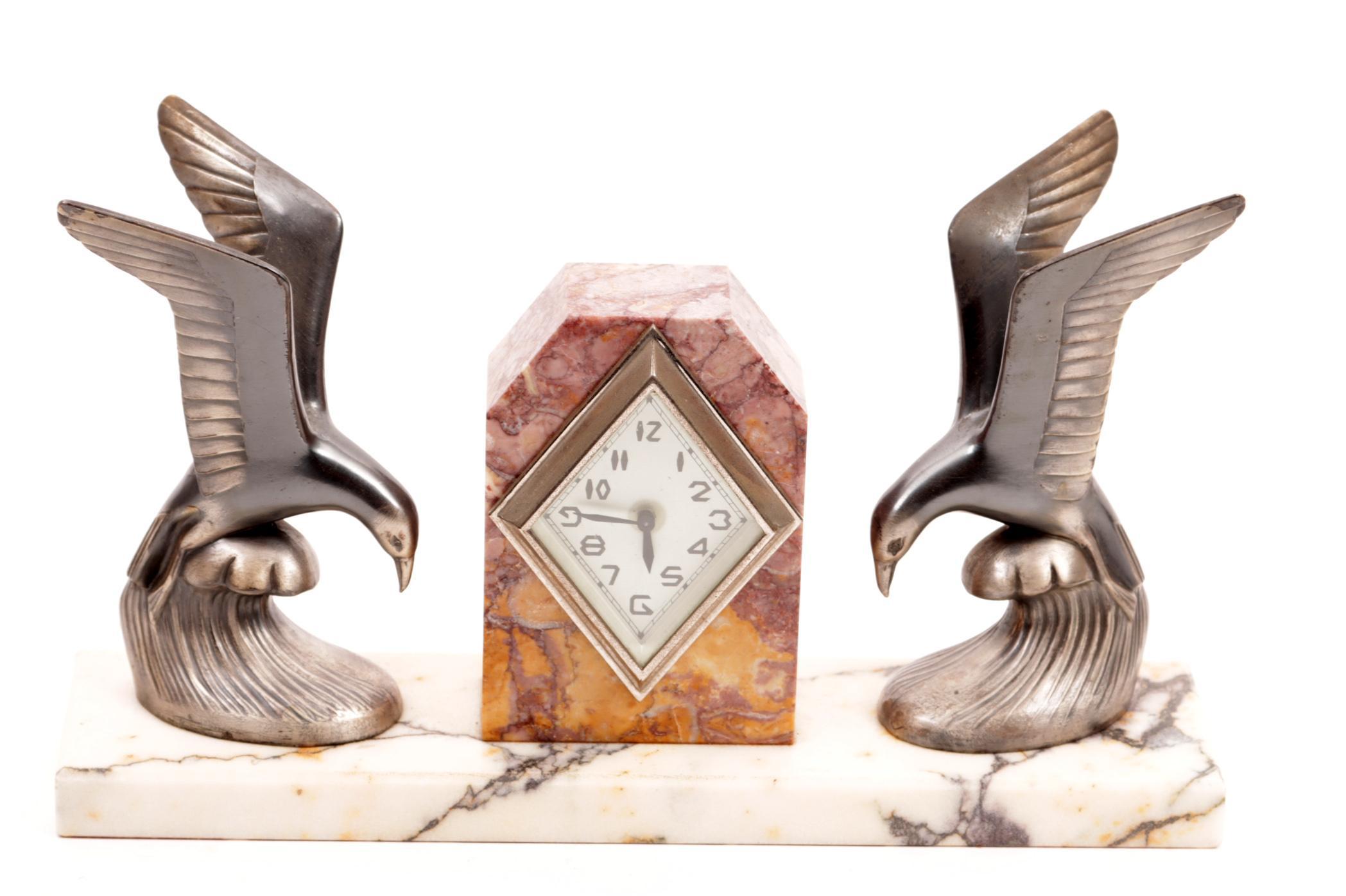 Marmeren Art Deco klokje met aan weerszijde een voorstelling van een meeuw,h.17 cm.