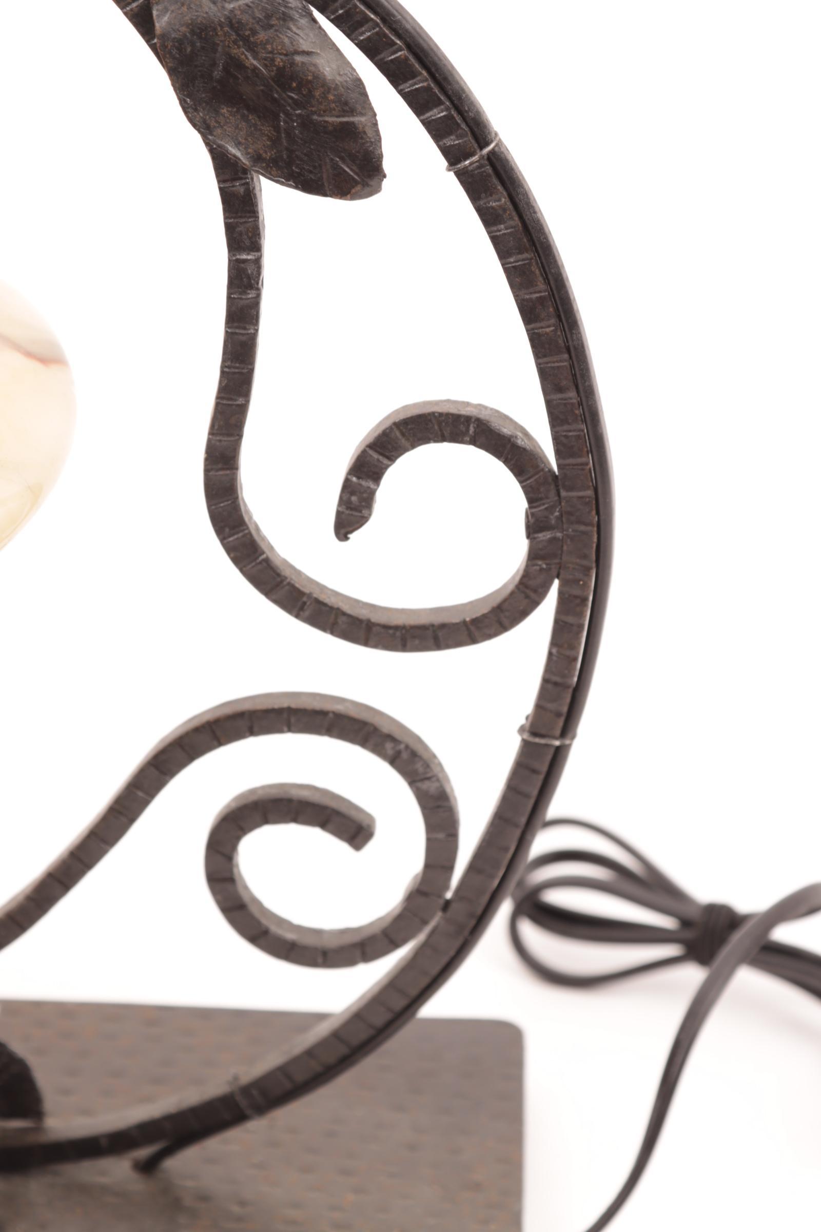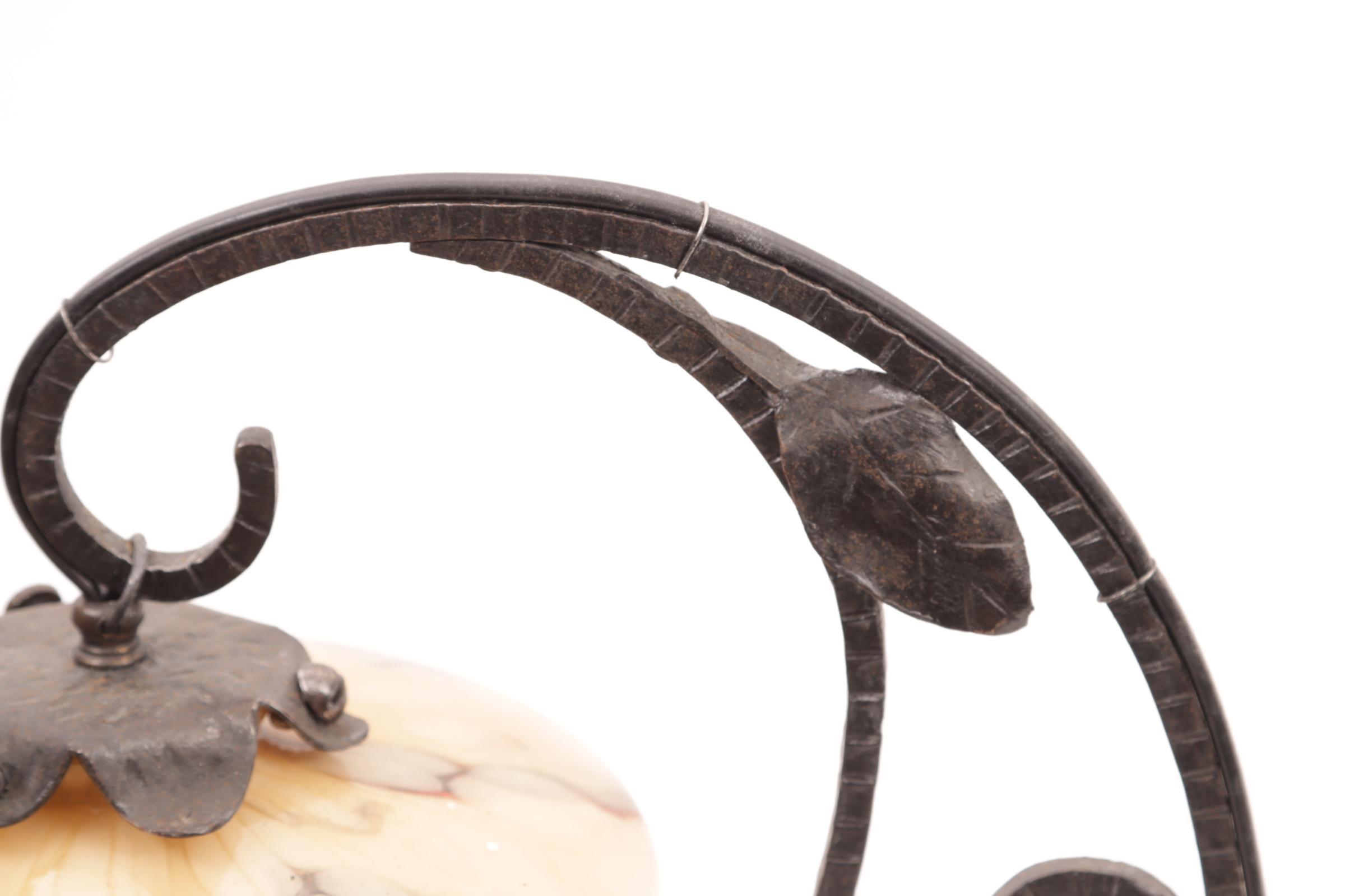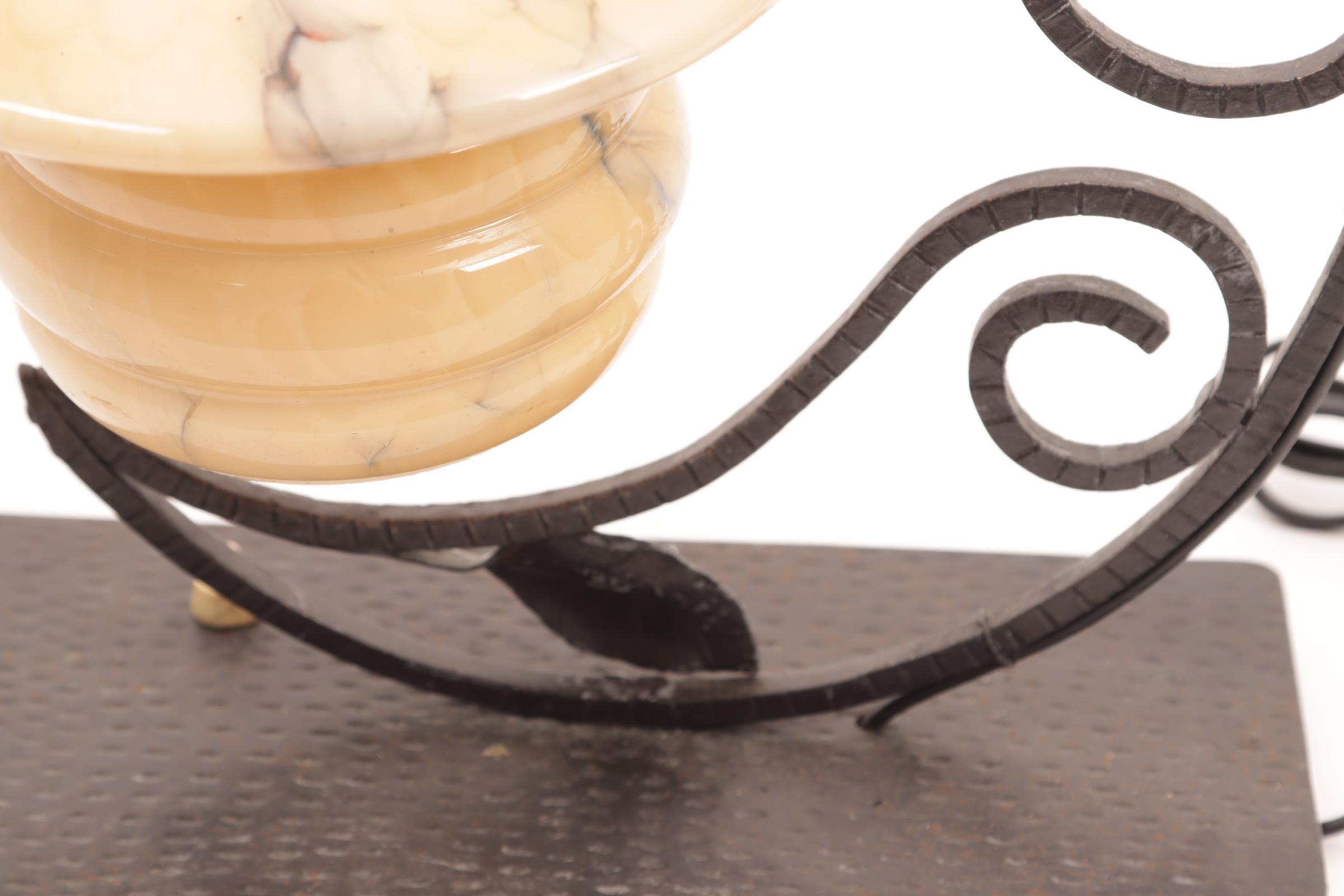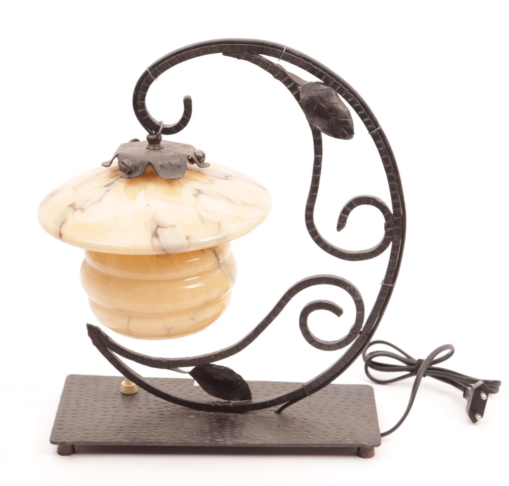 Smeedijzeren Art Deco tafellamp met geel gemarmerde glazen kap, h.34 cm.