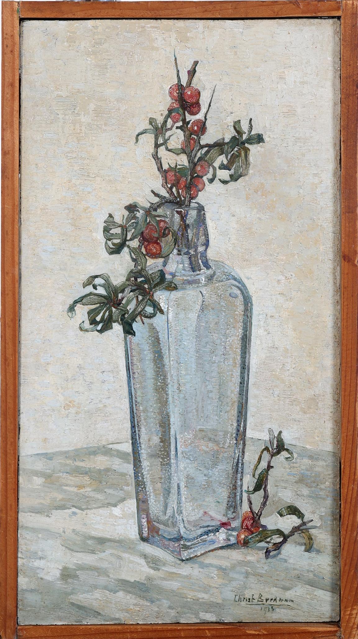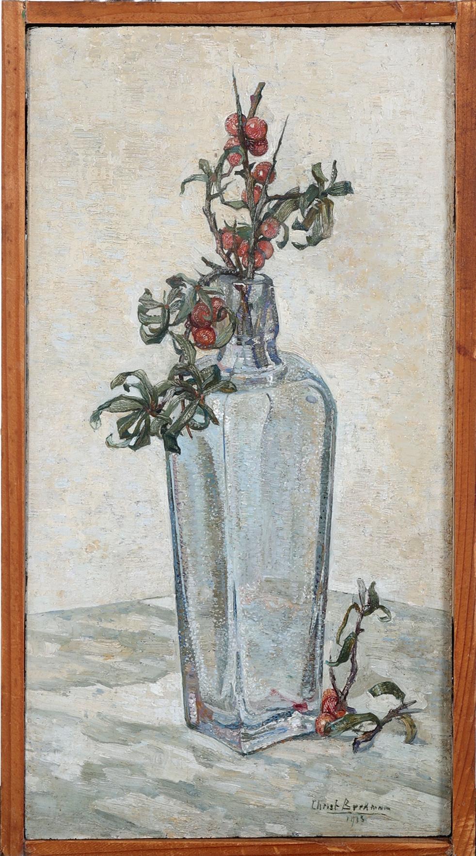 Christiaan Hendrik (Chris) Beekman (1887-1964), Bessentak in fles, olieverf op paneel, 31 x 16 cm., gesigneerd l.o. en gedateerd 1913