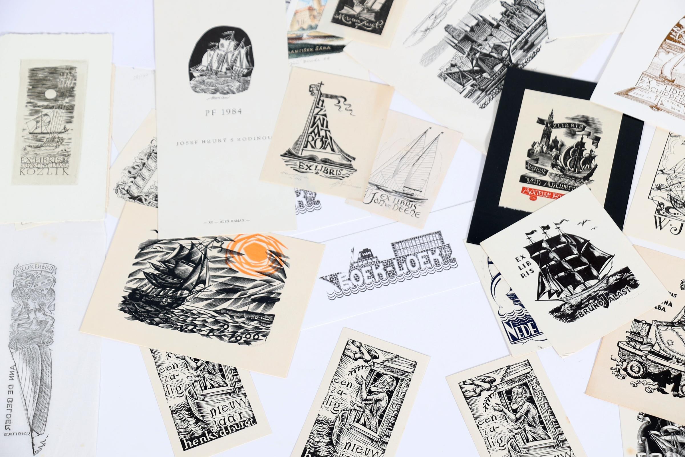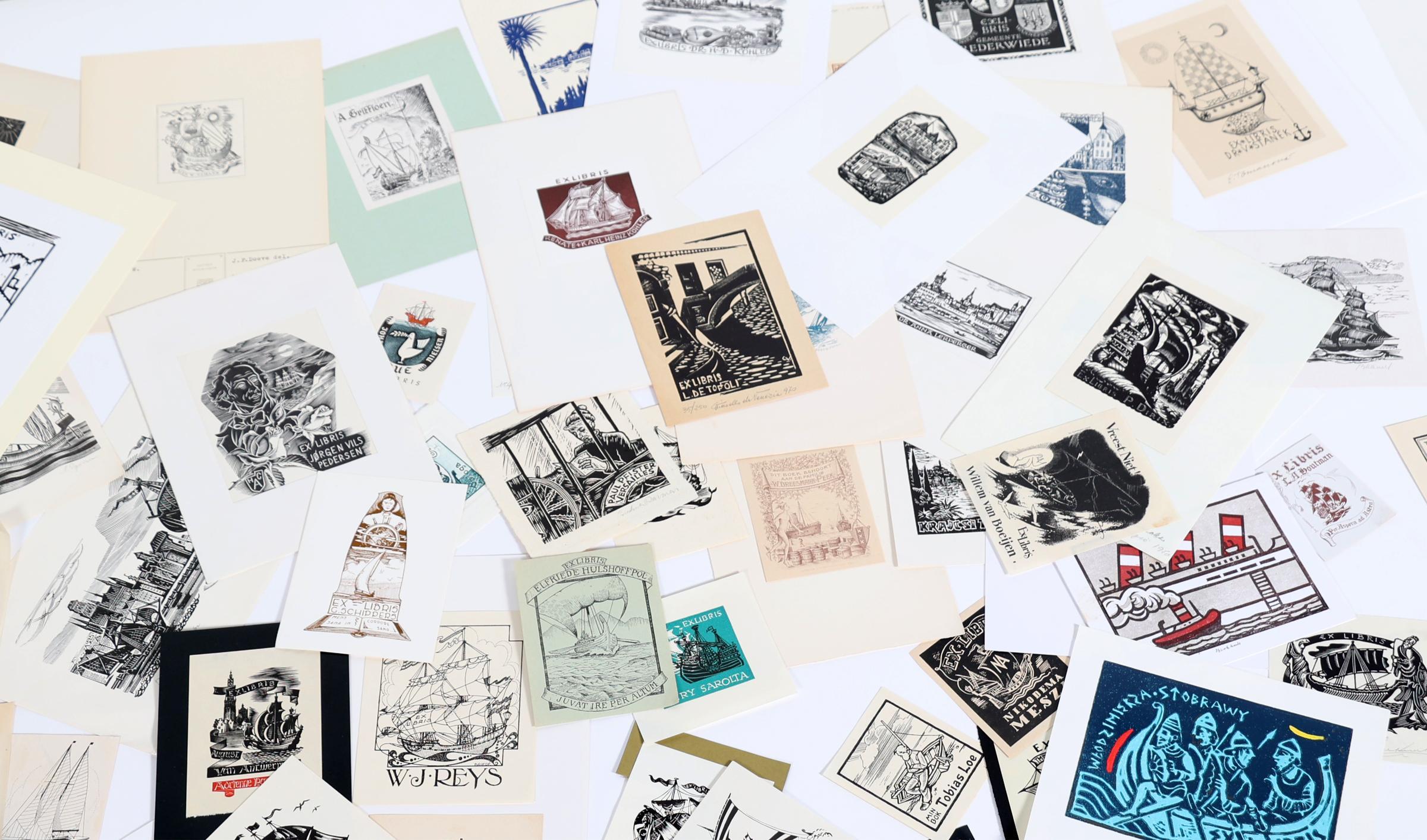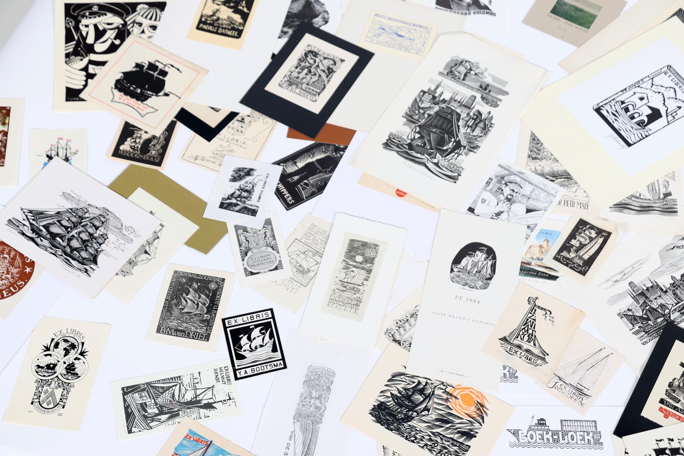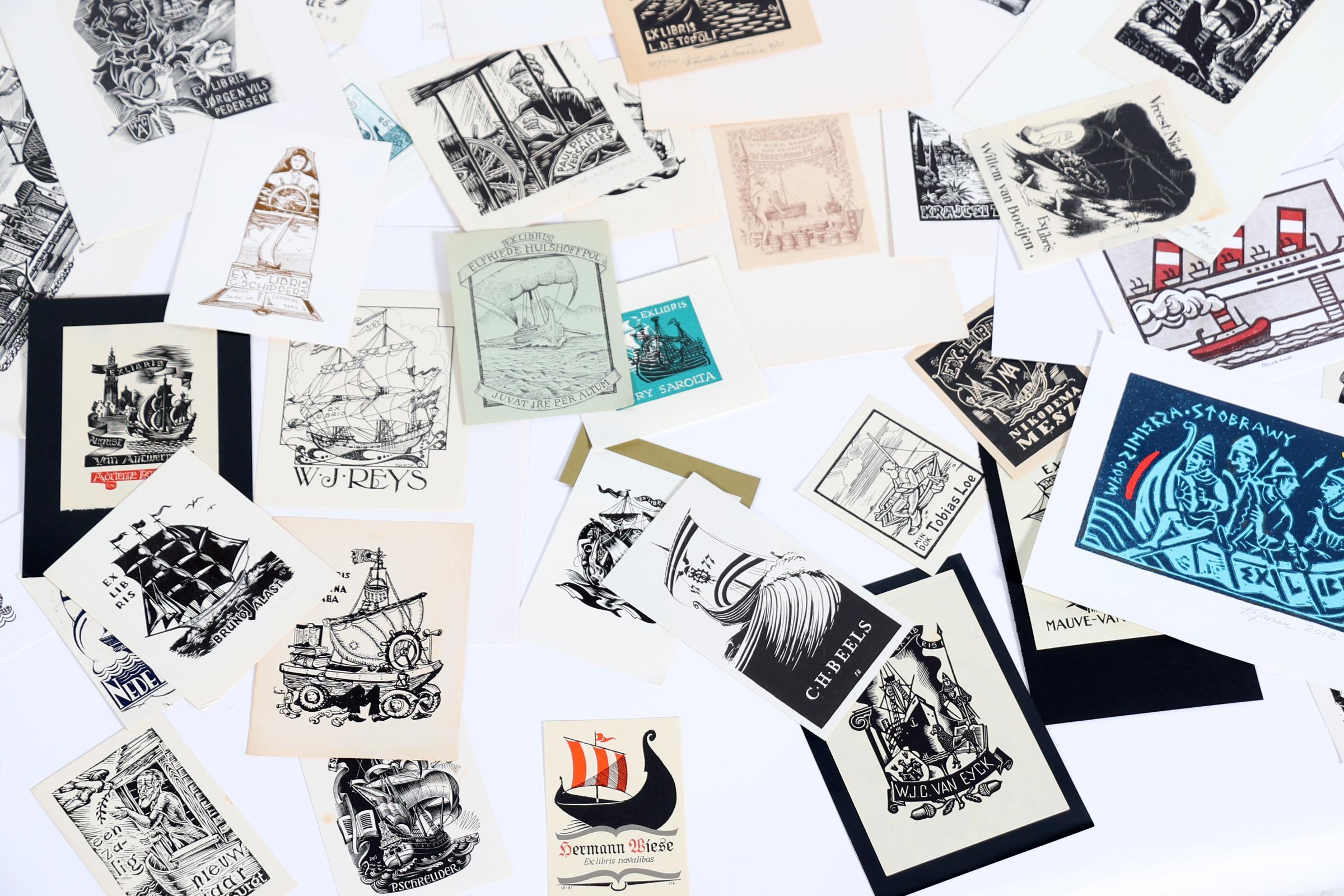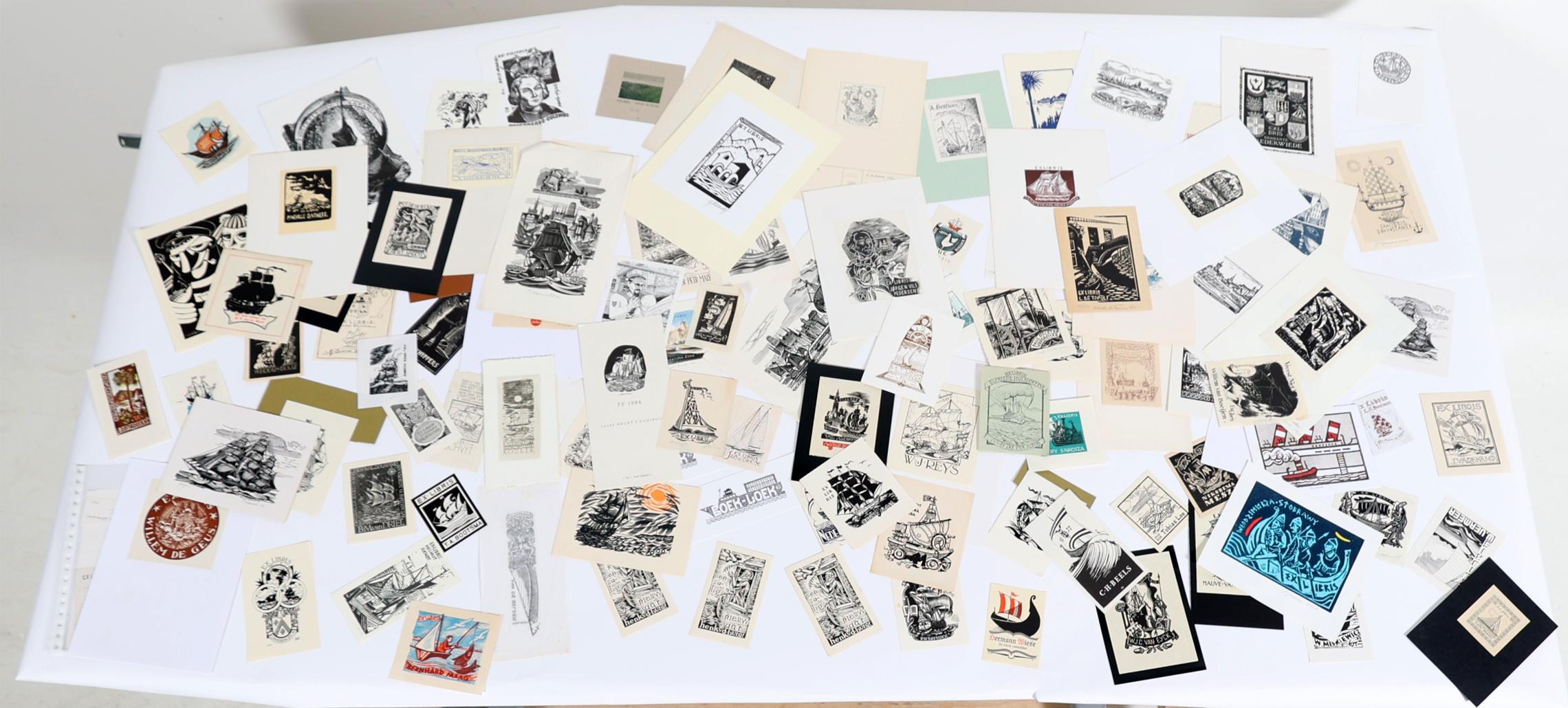 collectie van plm. 100 exlibris / kleingrafiek, thema: 'schepen', vooral hoogdruk, deels gesigneerd, deels opgeplakt. O.a. gemaakt door Mauve, Jirauch, L. May, Jaer, Herckenrath, Huffert