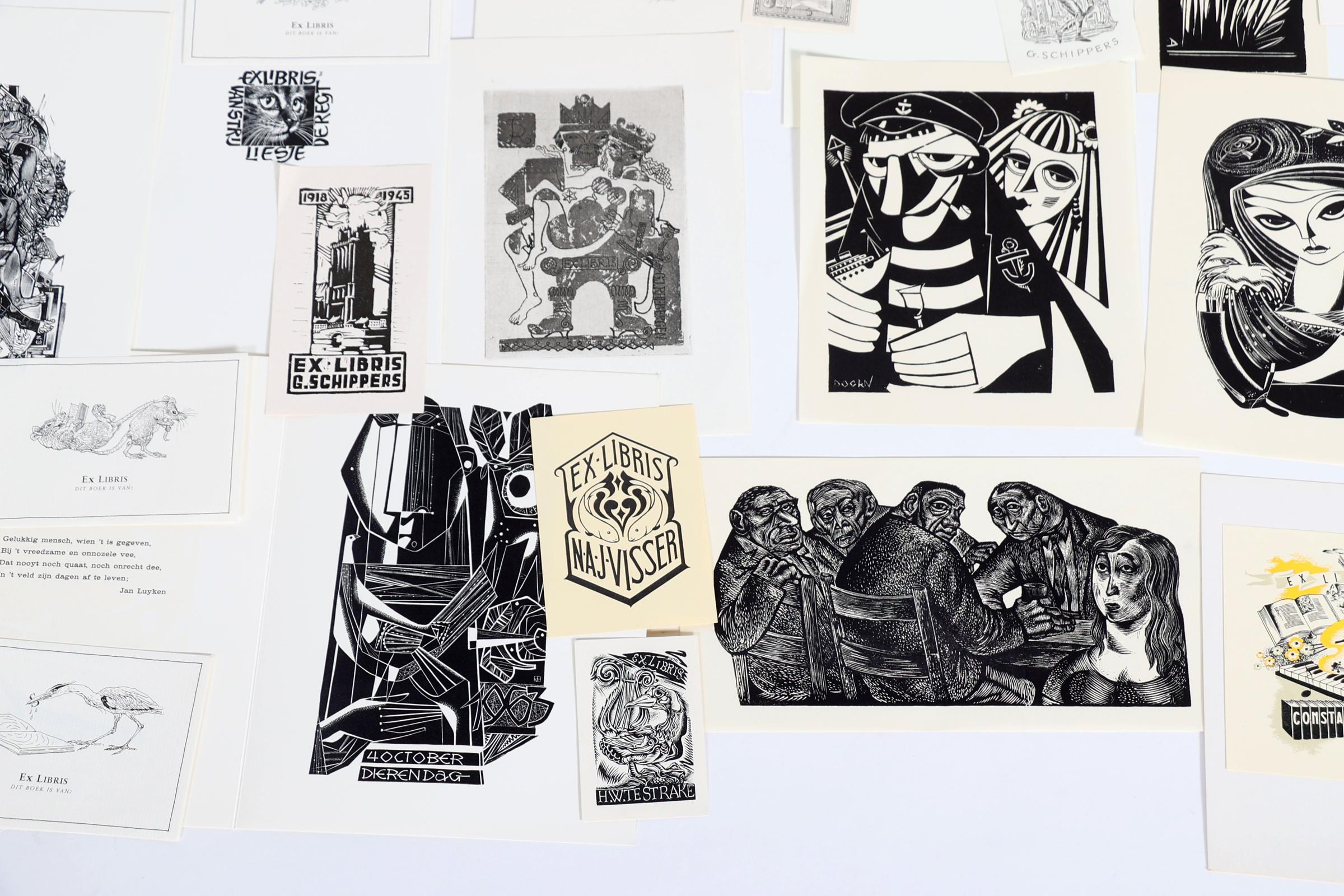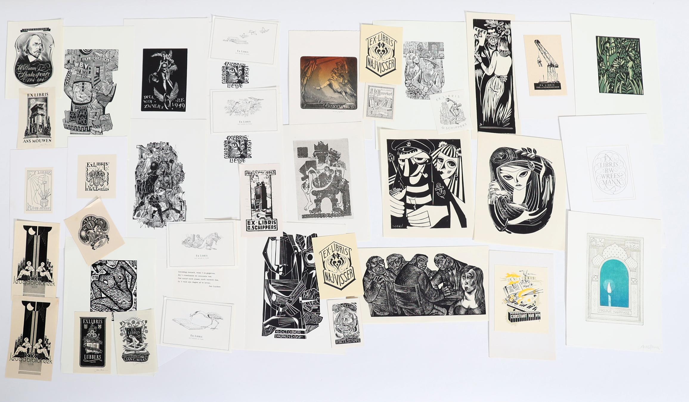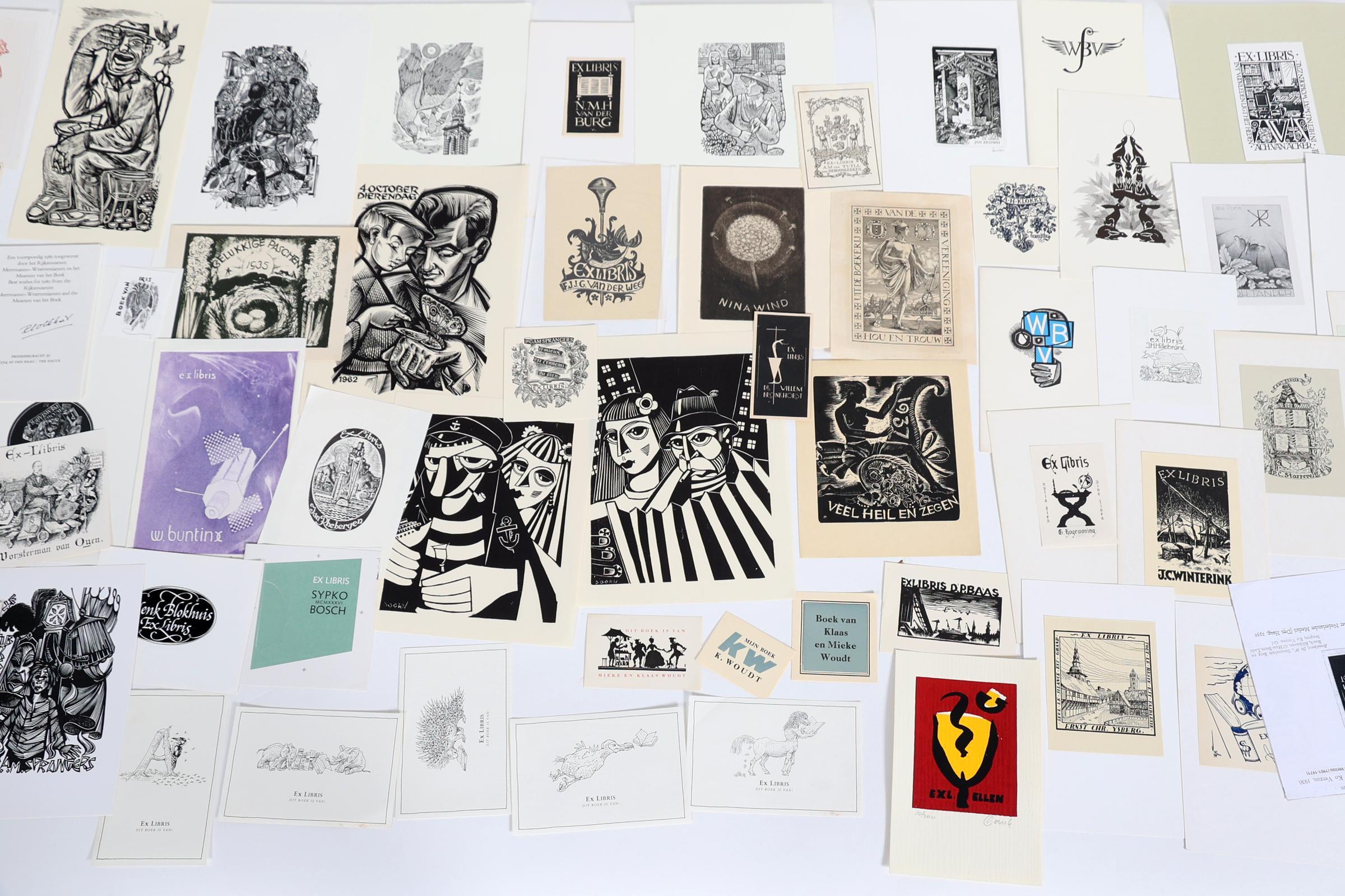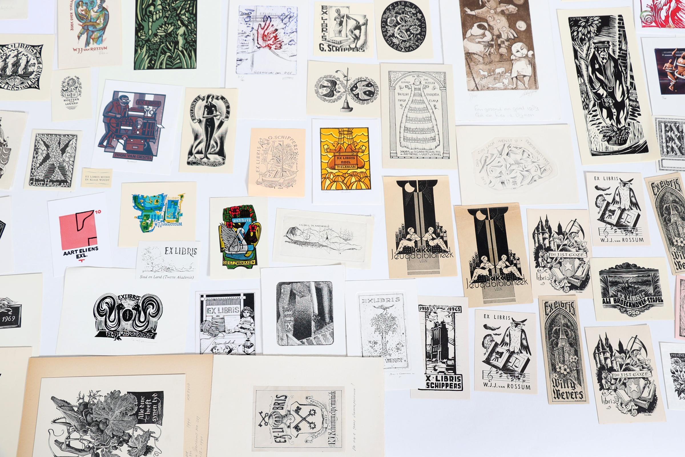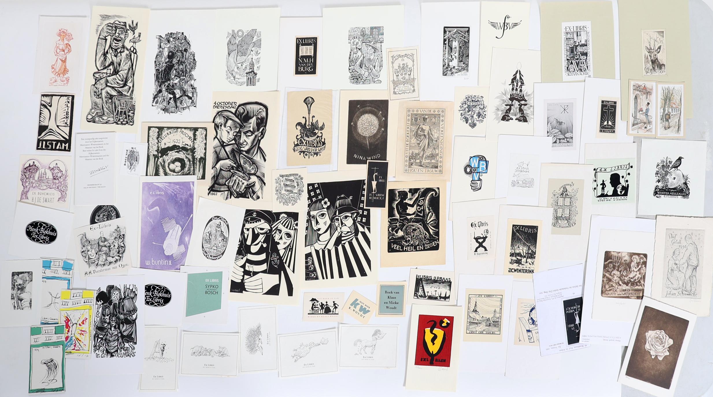 collectie van plm. 150 Nederlandse exlibris / kleingrafiek, voornamelijk hoogdruk, deels gesigneerd, deels opgeplakt. Gemaakt door o.a. Van Vlijmen, Bieruma Oosting, Blokhuis, Battermann, De Ruyter, Van Doorn, Bulder, Spronk.