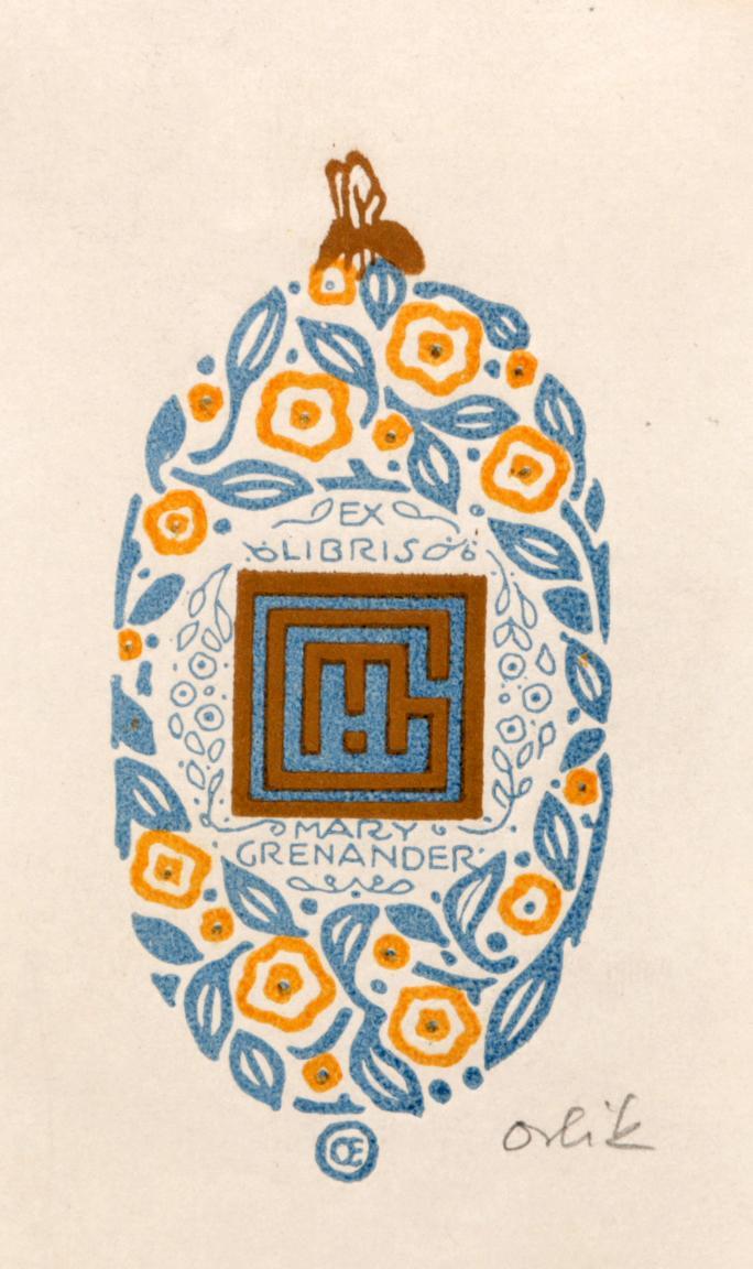 Orlik, E., exlibris voor Mary Grenander, gesigneerd, opgeplakt.