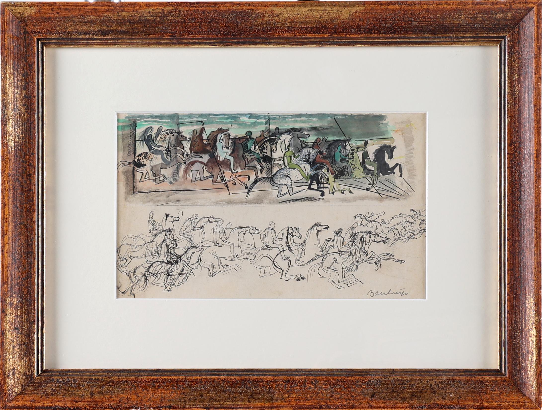 Jacob 'Jaap' Bouhuys (1902-1983), Personen te paard, pentekening/gouache 26 x 146 cm.