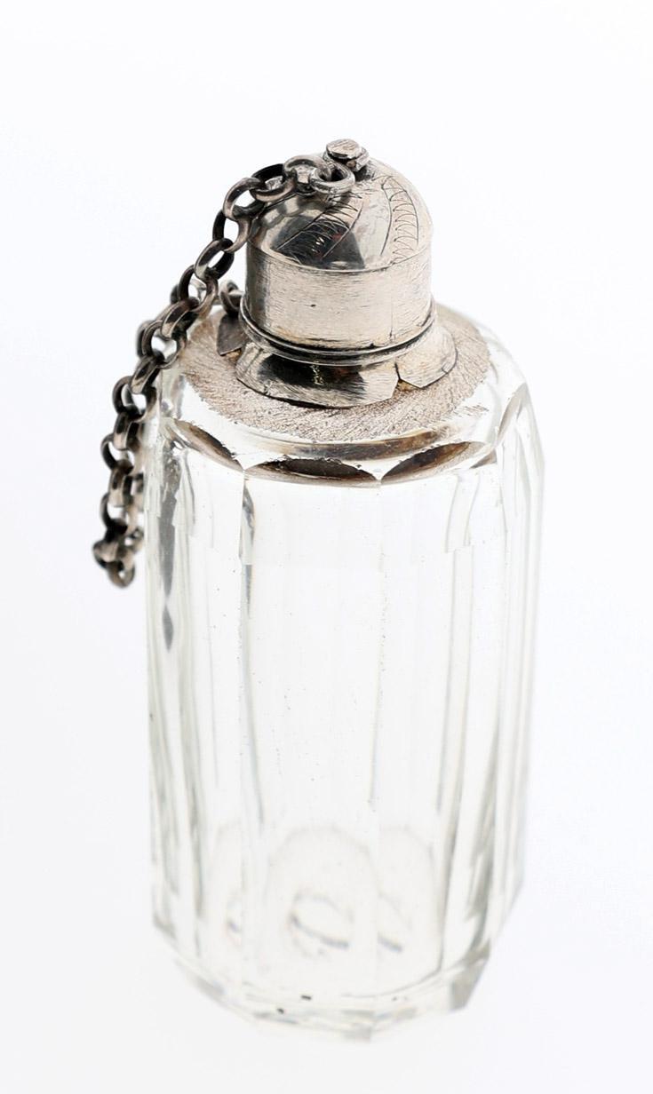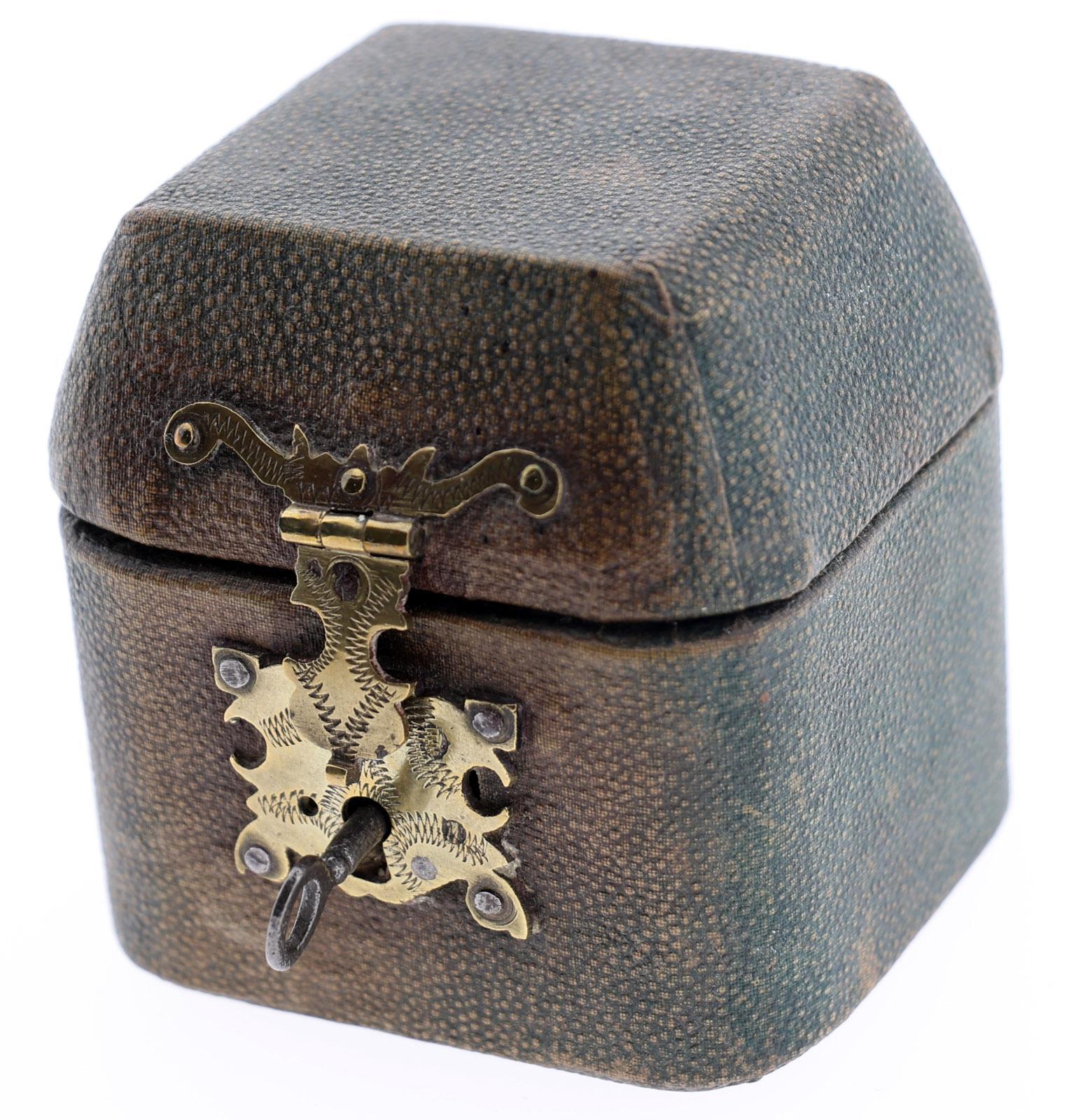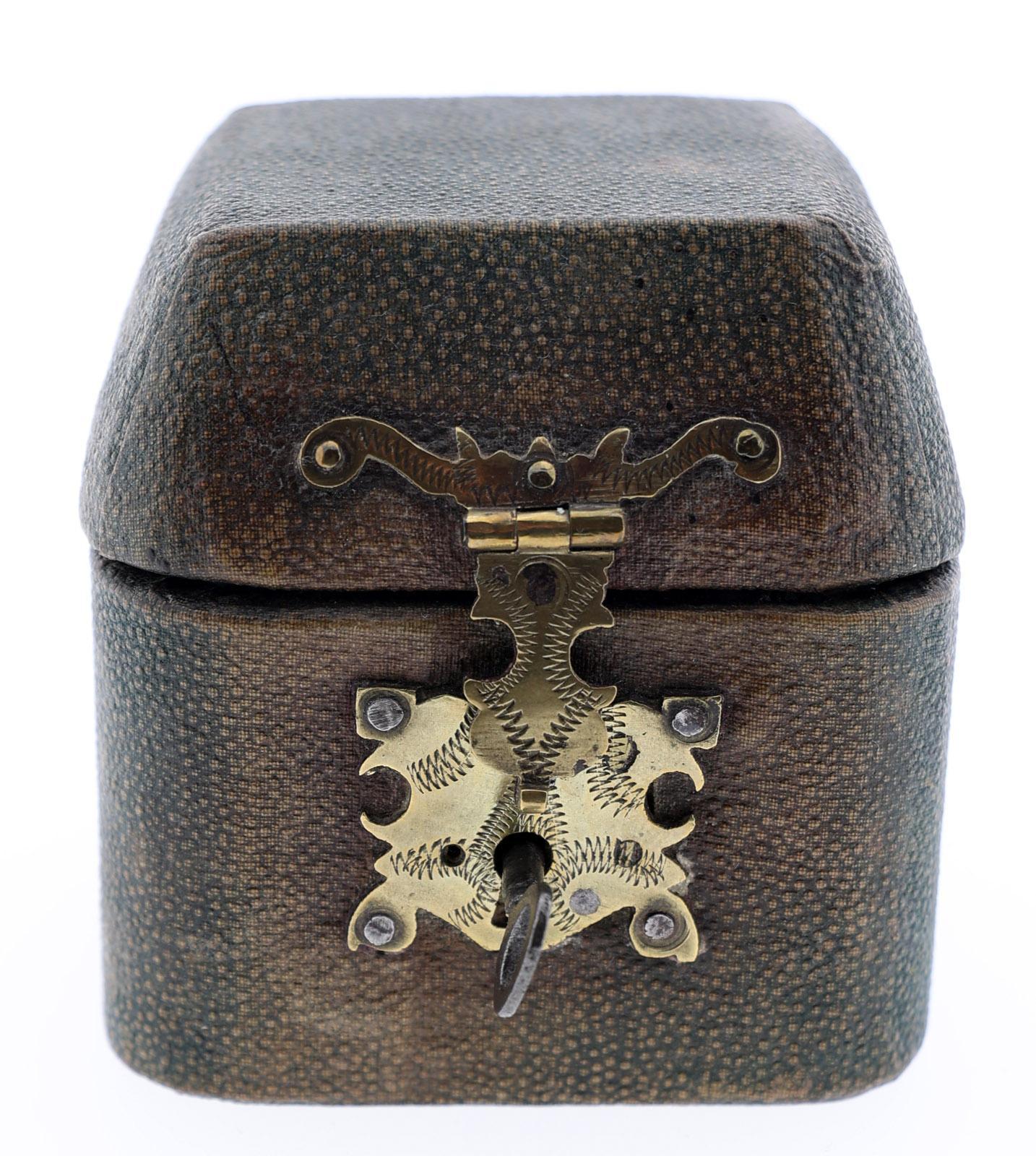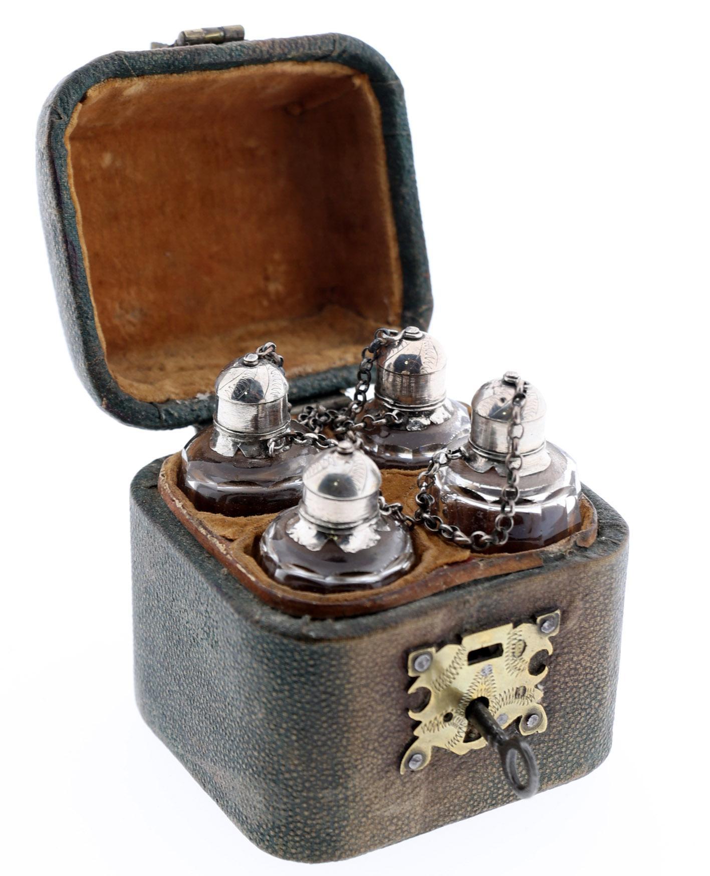 Met roggehuid beklede afsluitbare reiskistje met inhoud van 4 kristallen odeurflacons met zilveren doppen en sleutel, 18e eeuw
