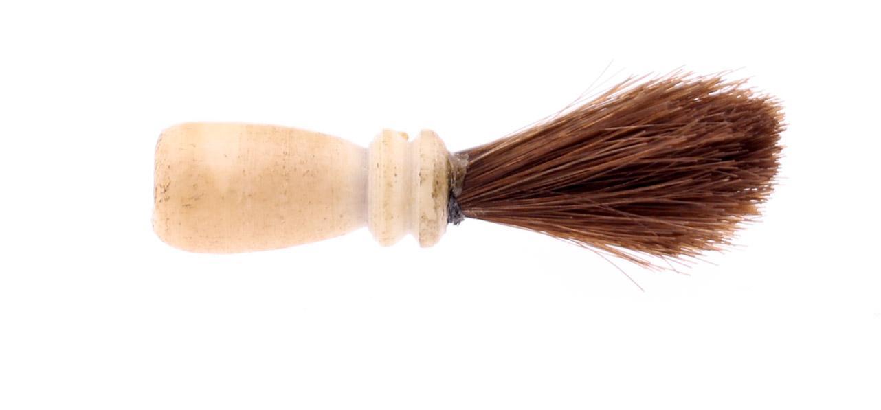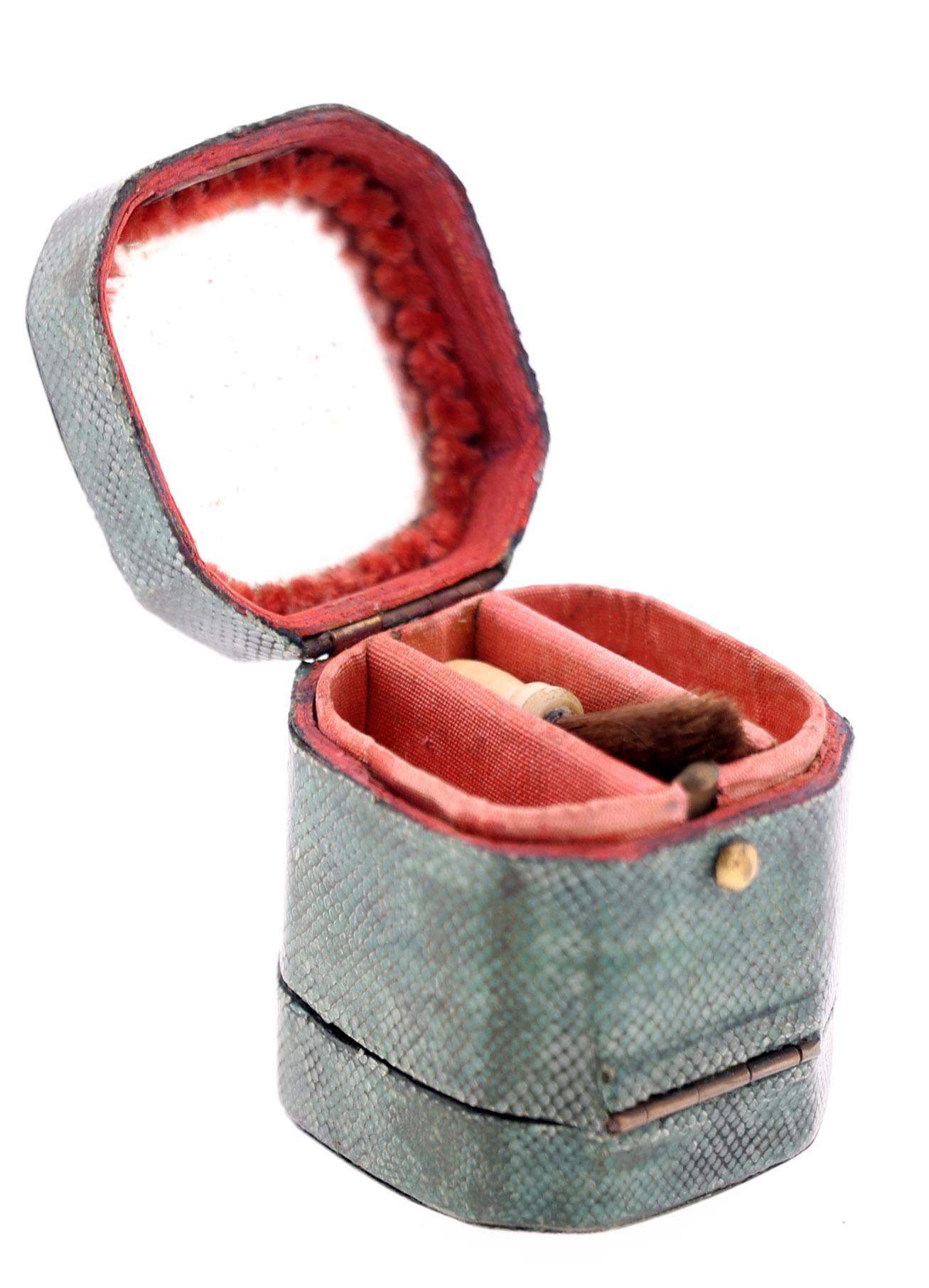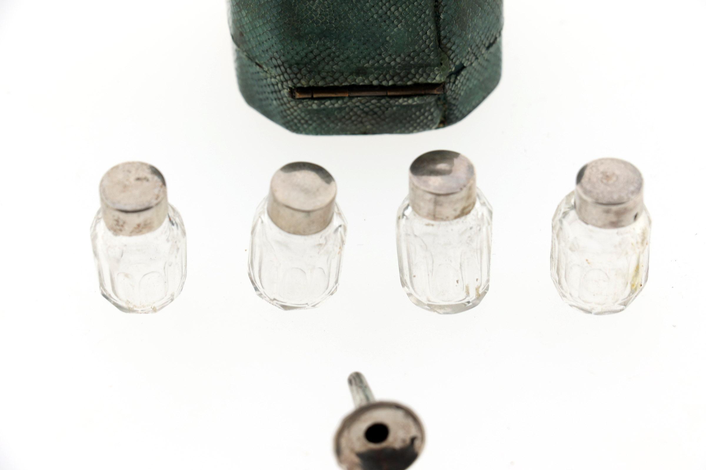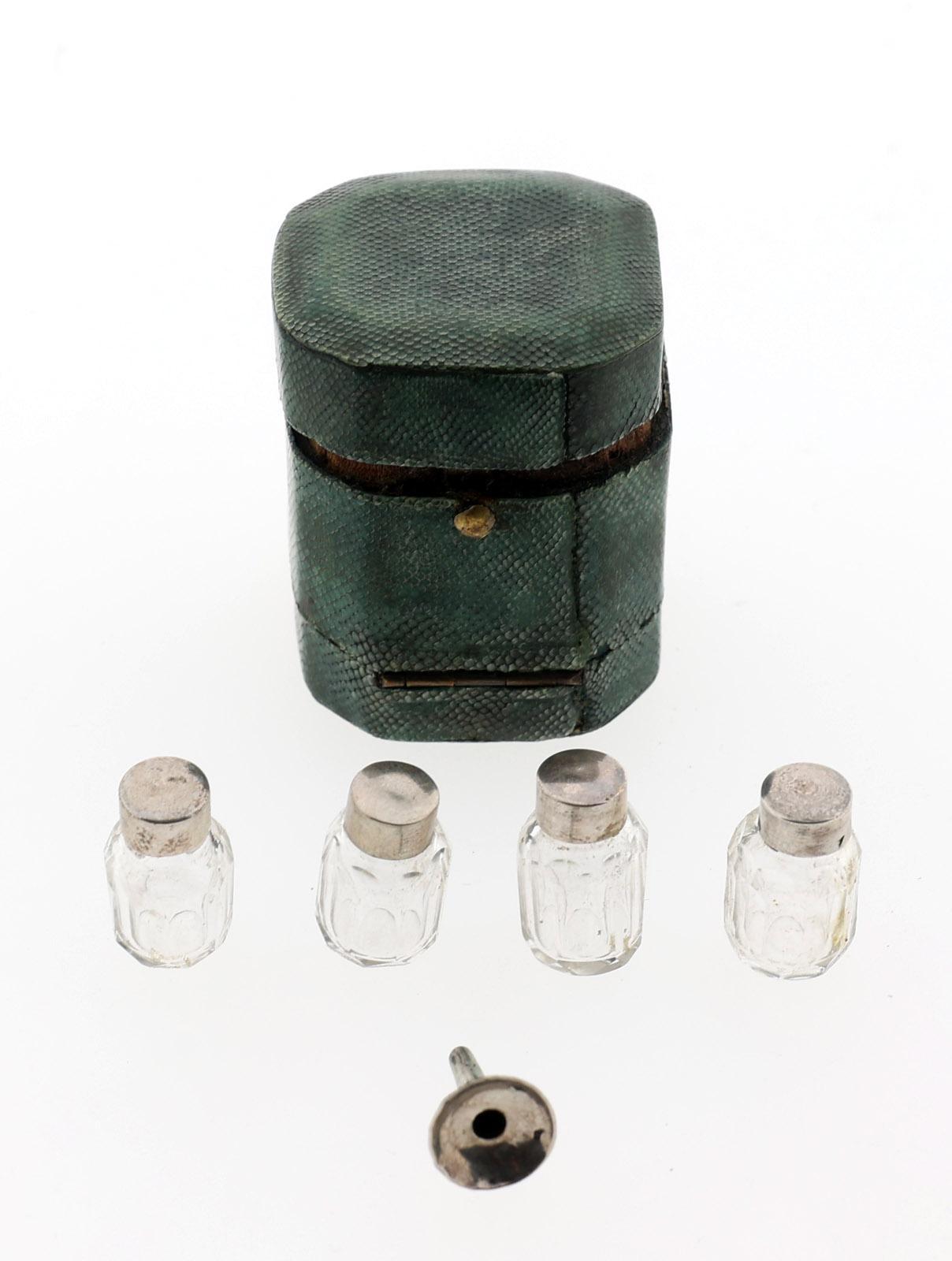 Antieke nécessaire bekleed met roggehuid met inhoud van 4 parfumflesjes, trechter en kwastje