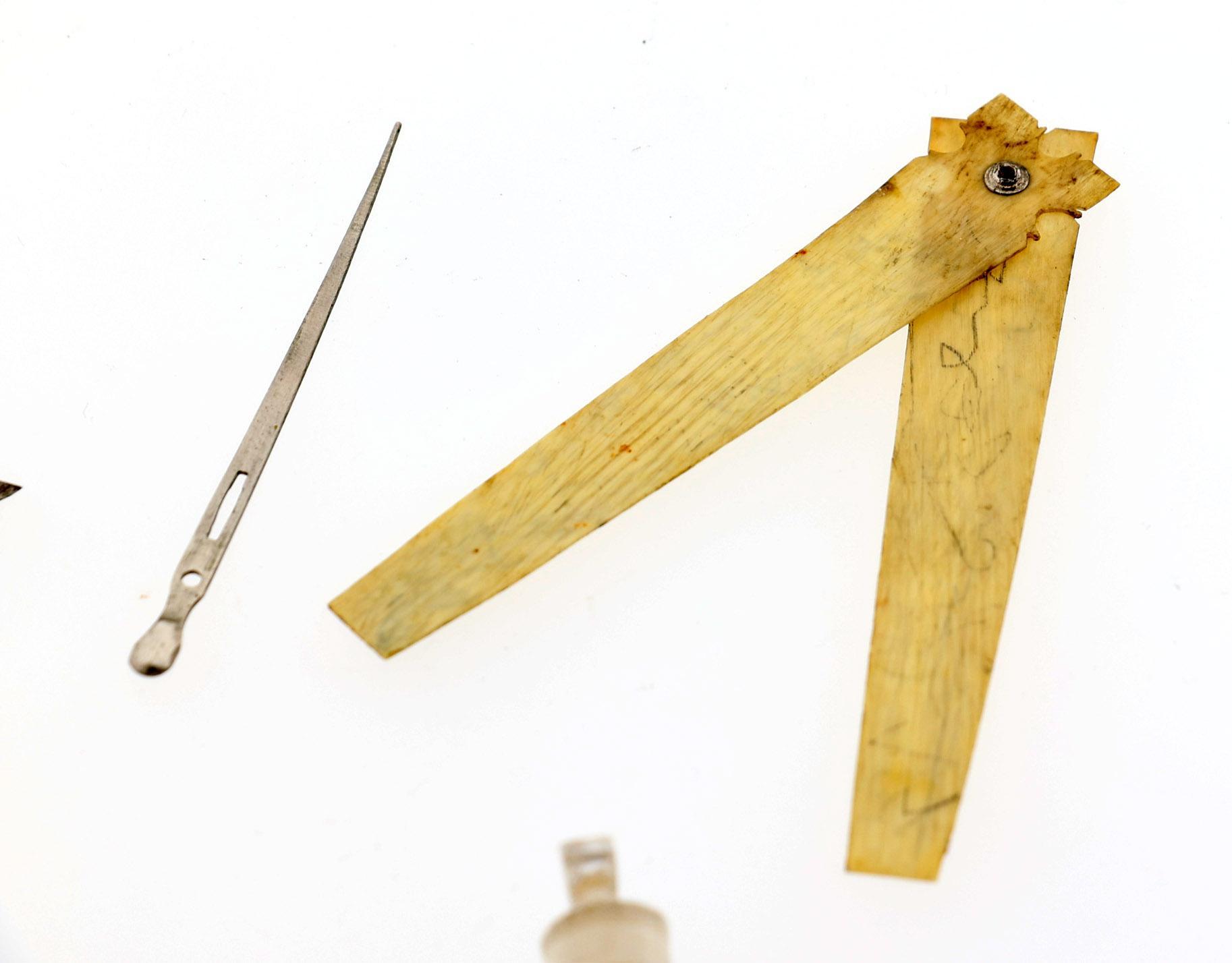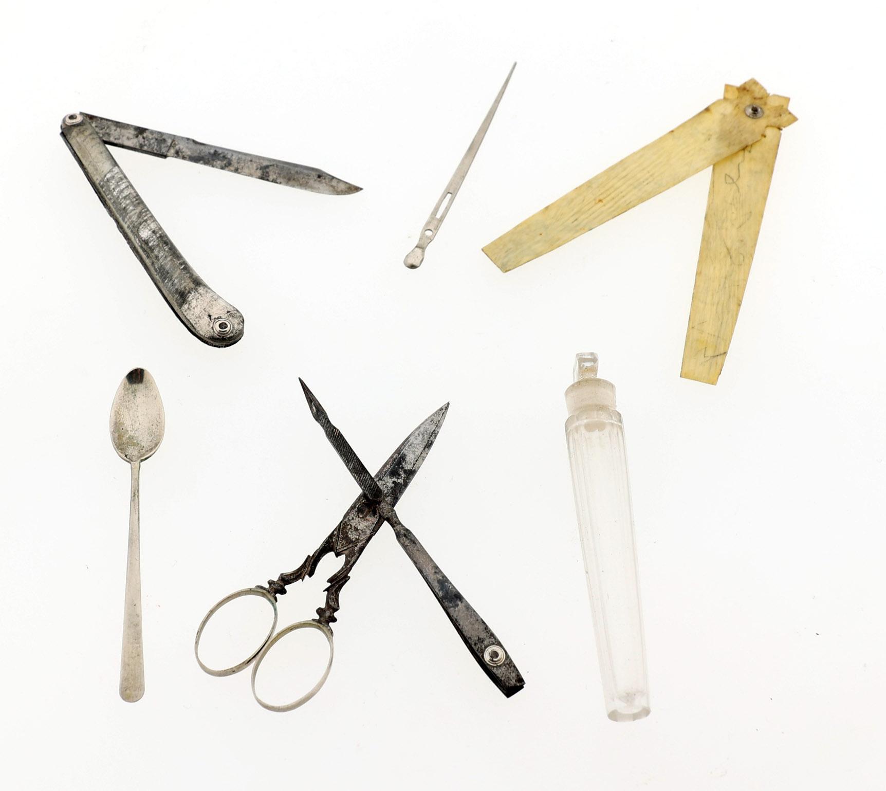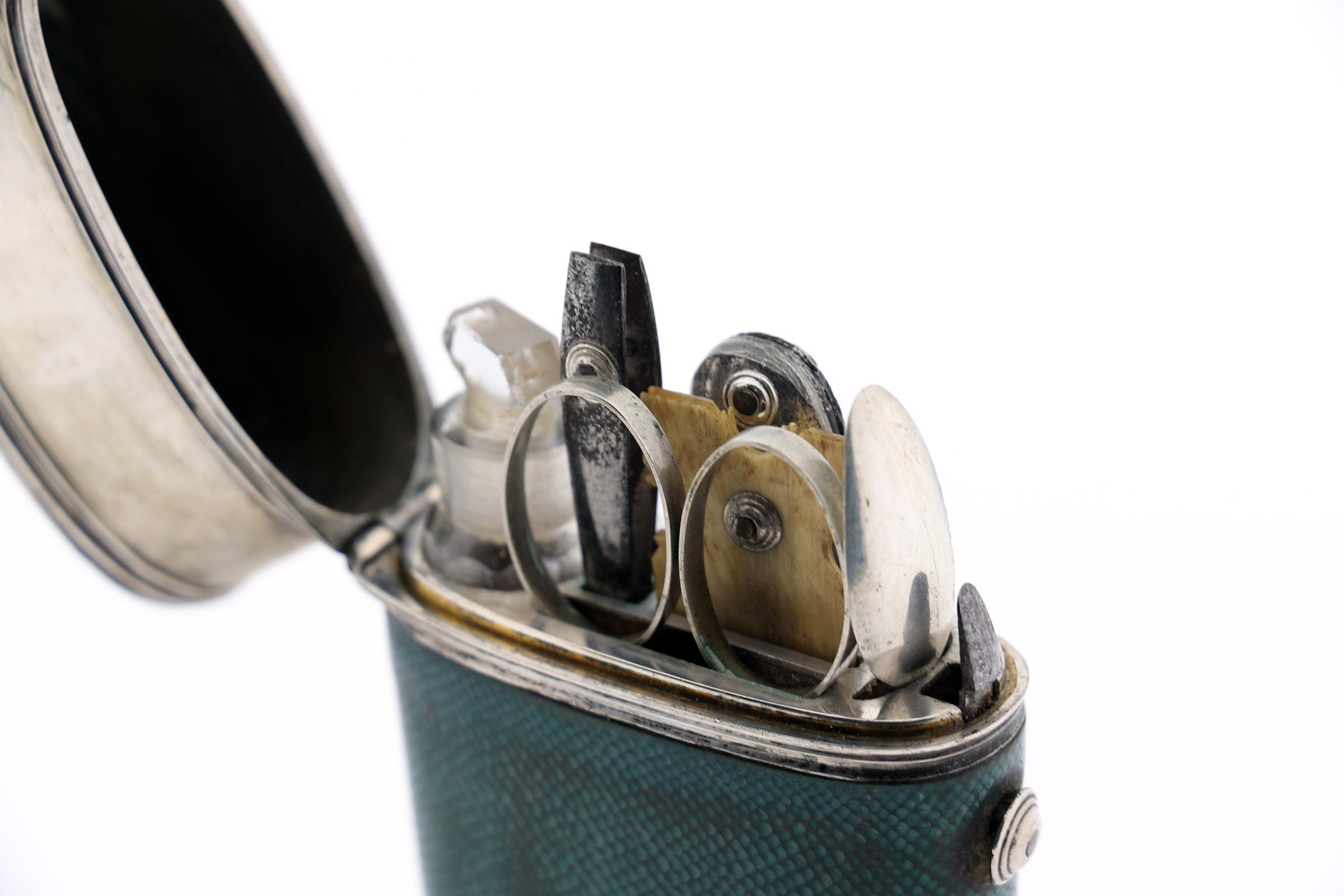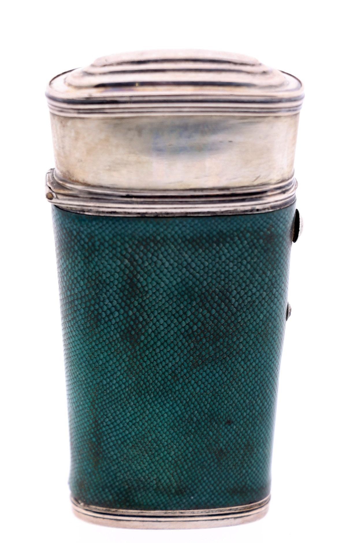 Antieke nécessaire met inhoud van naaigarnituur en kristallen parfumflesje met zilveren dop en met roggehuid bekleed, 18e eeuw