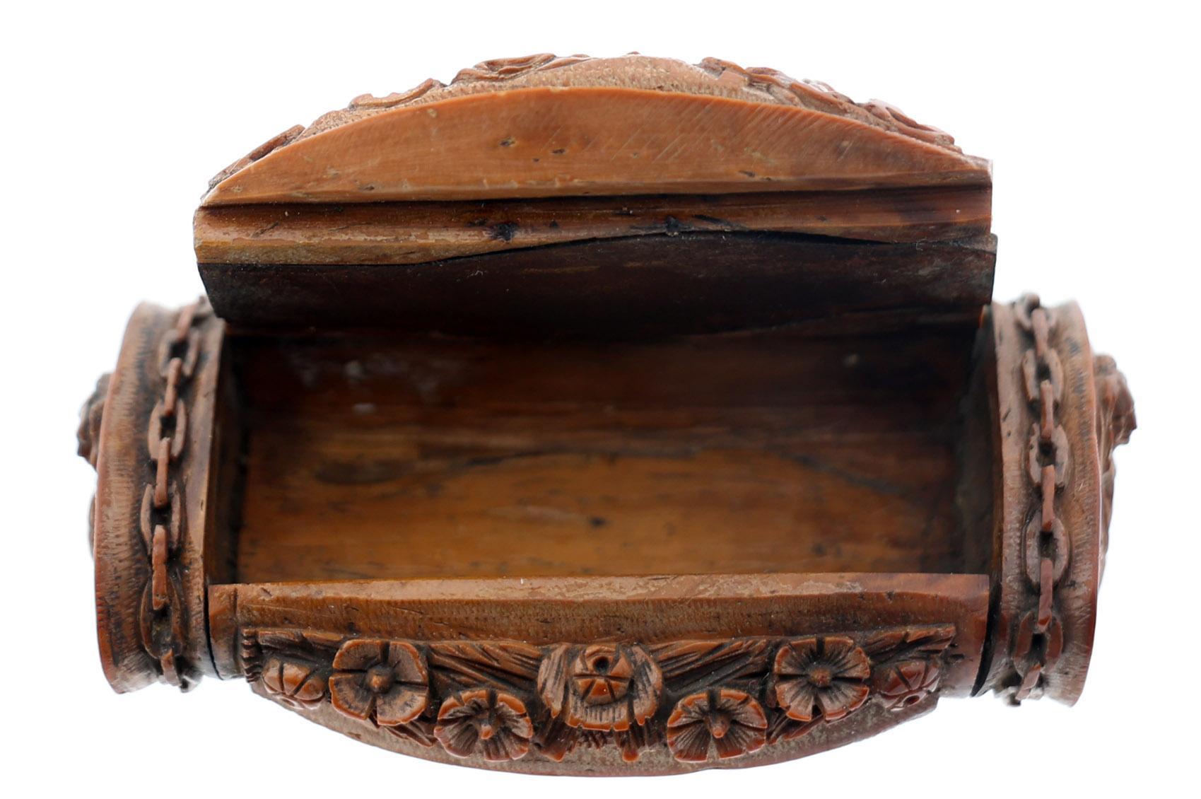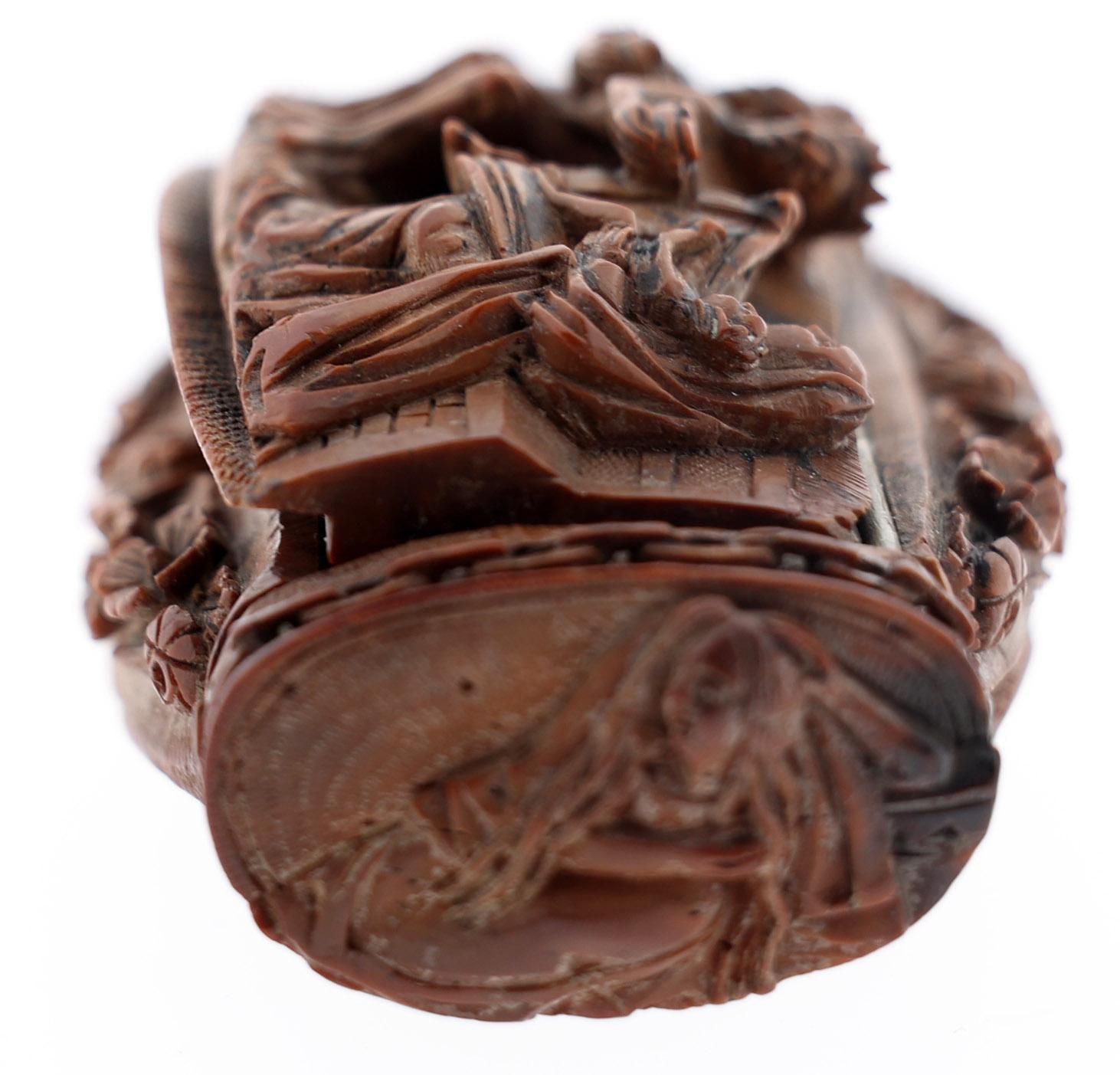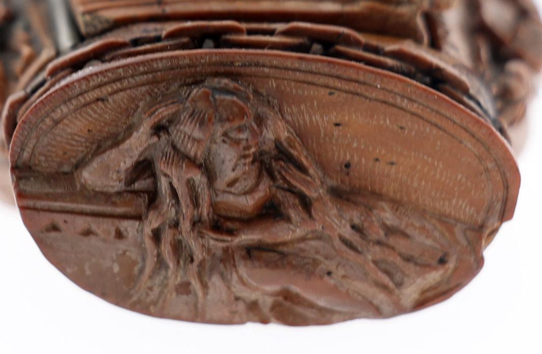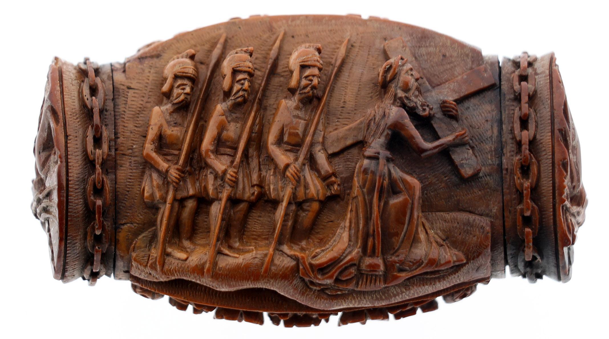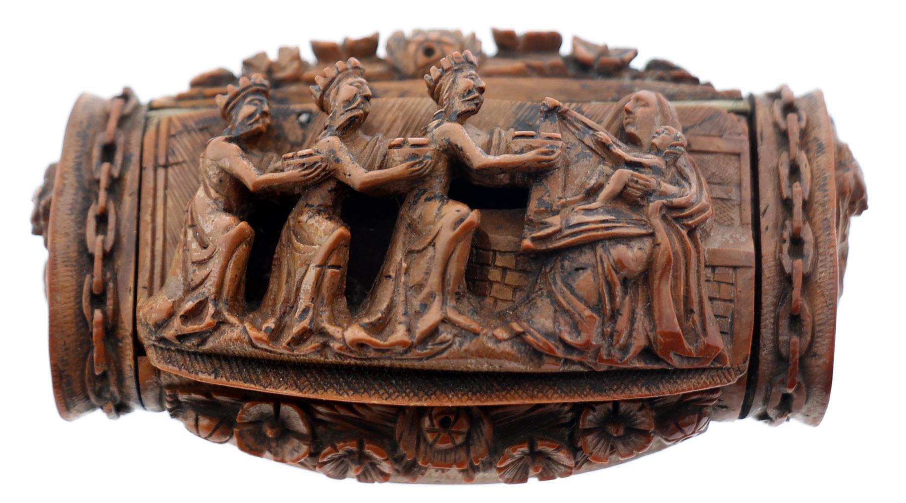 Rijkbewerkt coquille snuifdoos met op de voorzijde afbeelding van De Drie koningen, Maria en kind, achterkant kruisdragende Jezus en 3 soldaten en aan de zijkant treurende vrouwen, Frankrijk, 18e eeuw