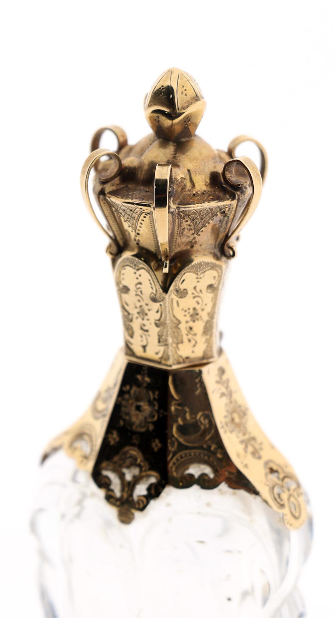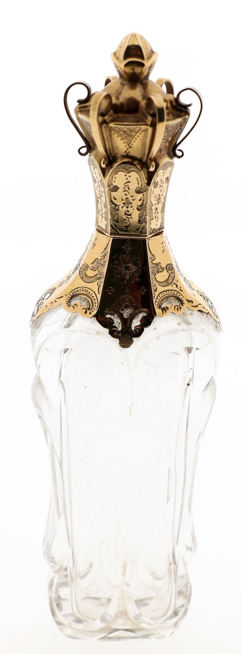 Antieke kristallen platte odeurflacon met gouden kraag en kroonvormige dop, 2e helft 19e eeuw, h.13 cm.