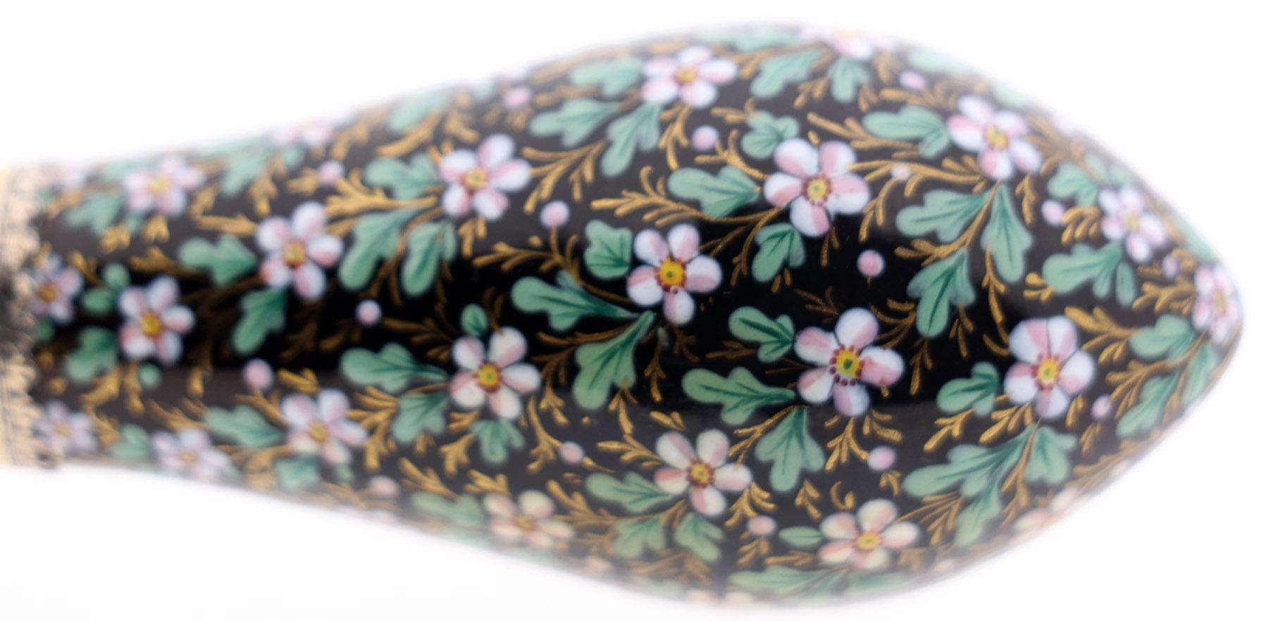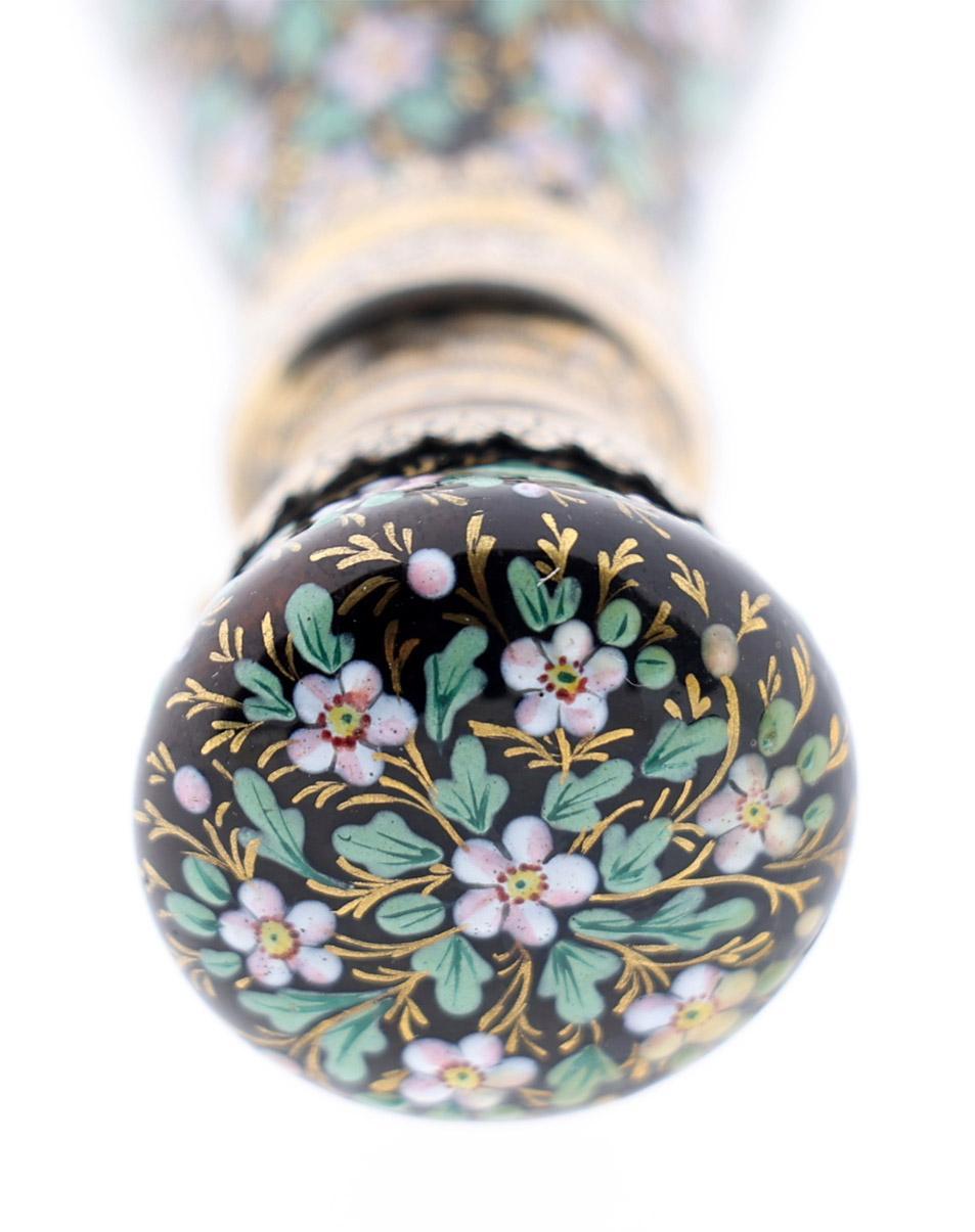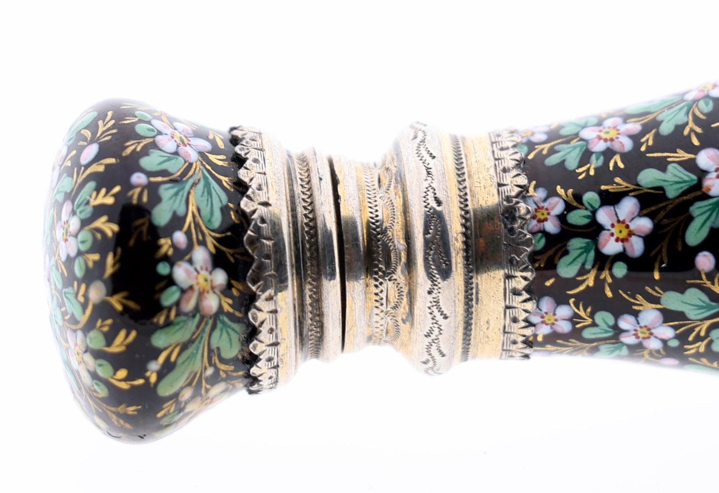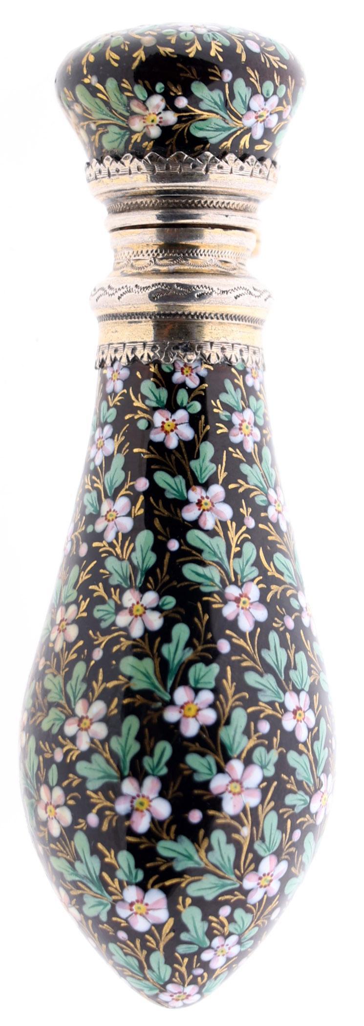 Antieke met bloemen bewerkte emaille odeurflacon met verguld zilveren rand, Frankrijk, 2e helft 19e eeuw, h.9 cm.