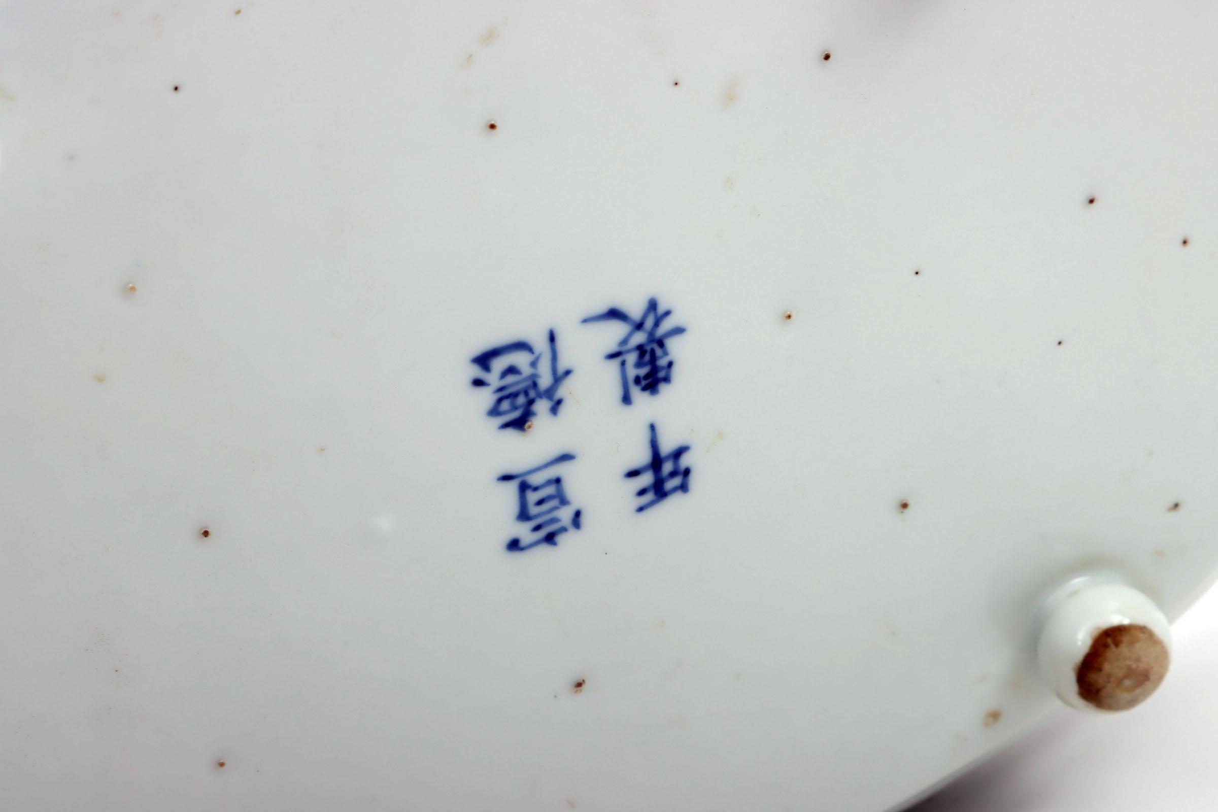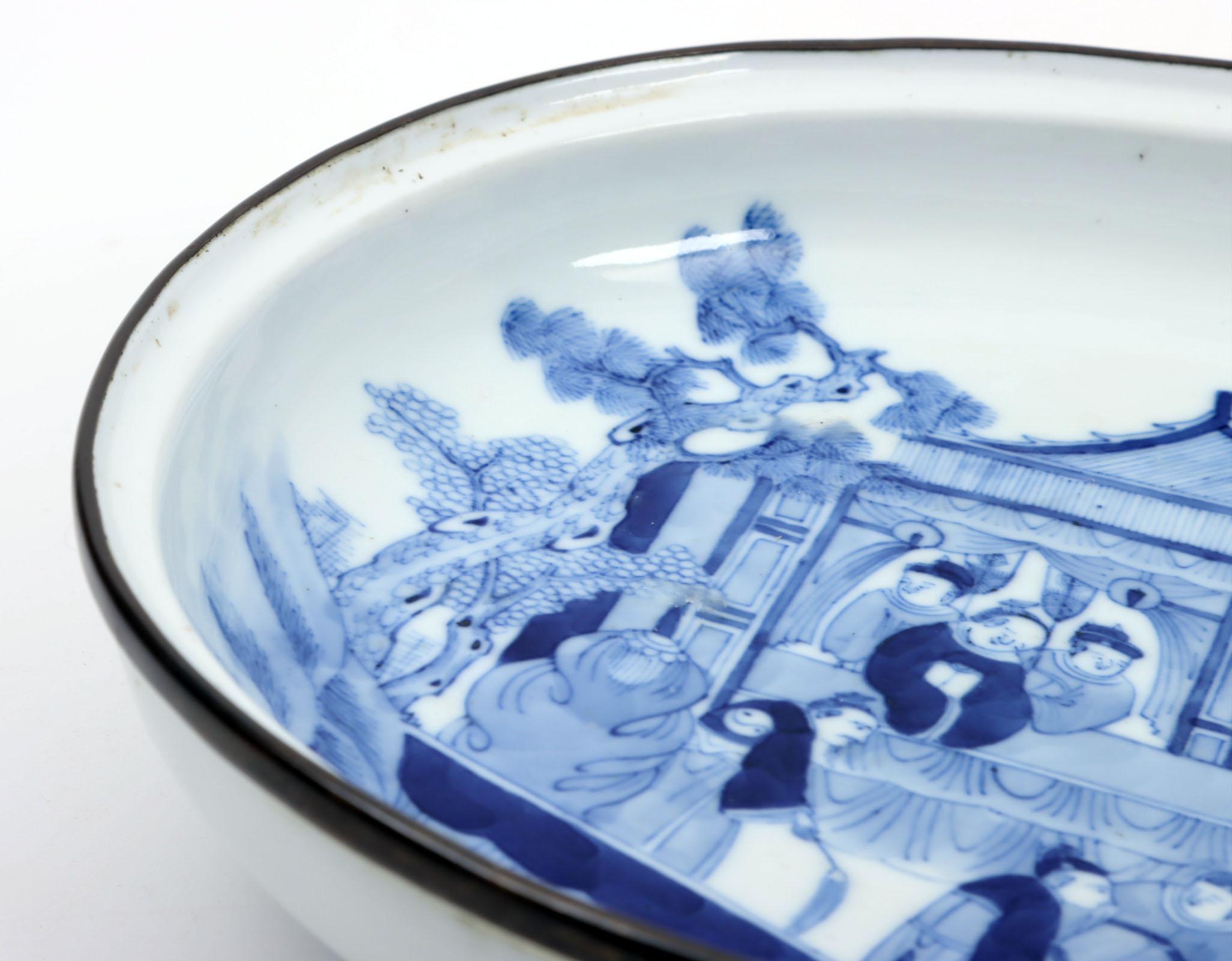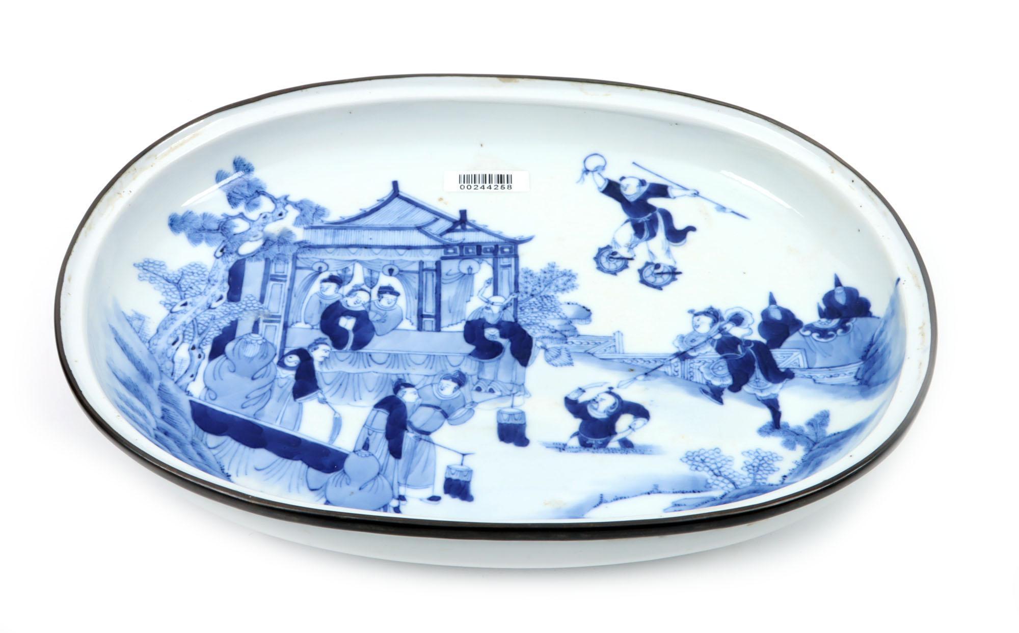 Blauw/wit Chinees porseleinen schotel op pootjes met figuratieve voorstelling, 28,5 x 20 x 5,5 cm.
