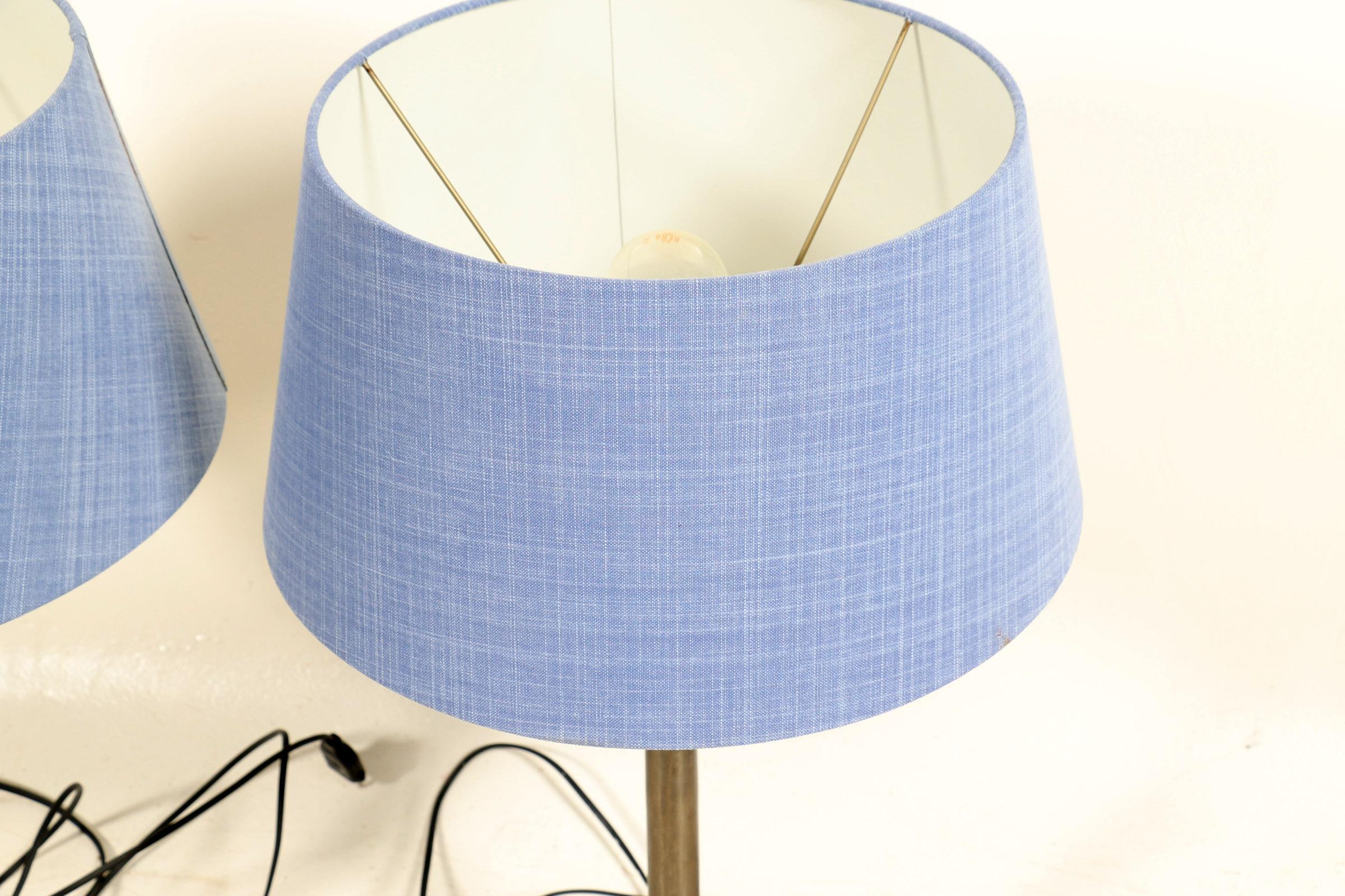 2 Pleet lampvoeten met blauwe kappen, h.70 cm.