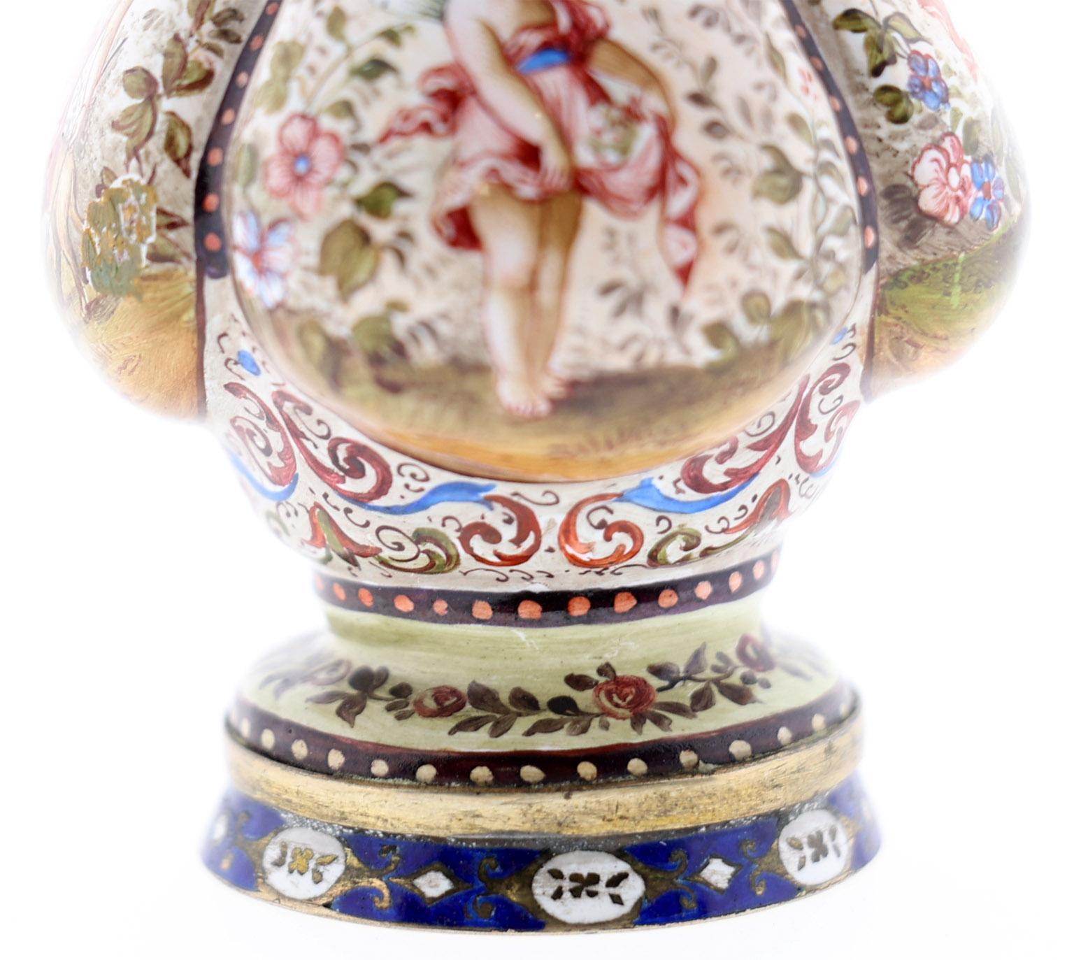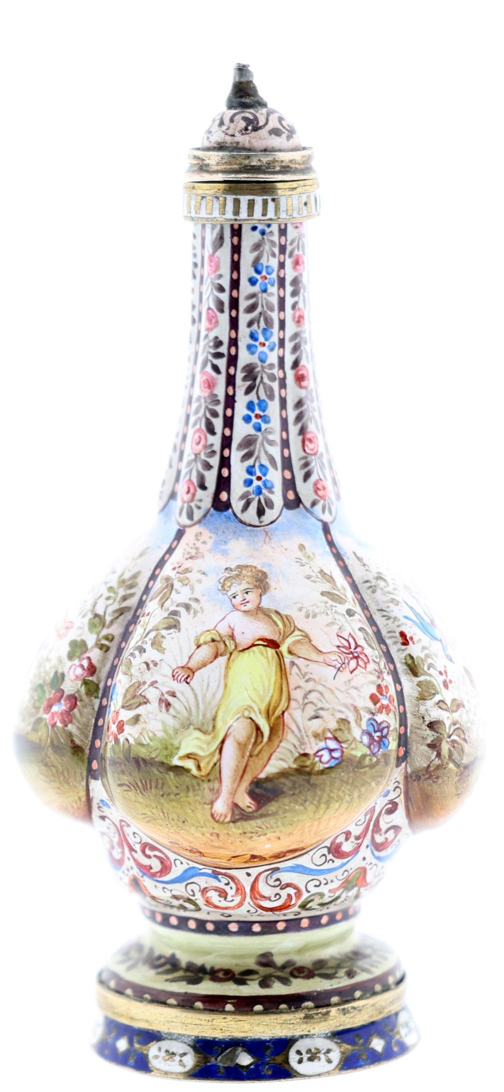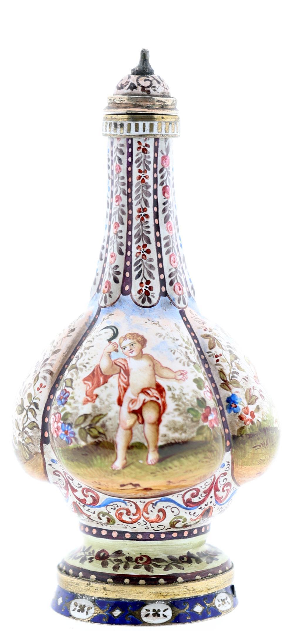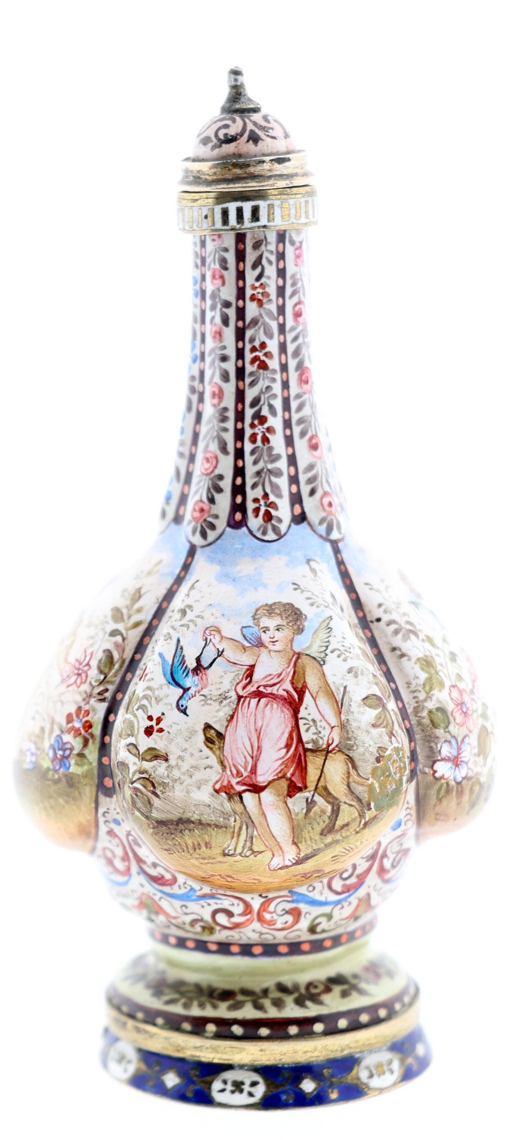 Antieke Weens emaille odeurflacon in puntvormfles vorm met op de 4 uitstulpingen decoraties van kindjes in tuin, 2e helft 19e eeuw, h.11 cm.
