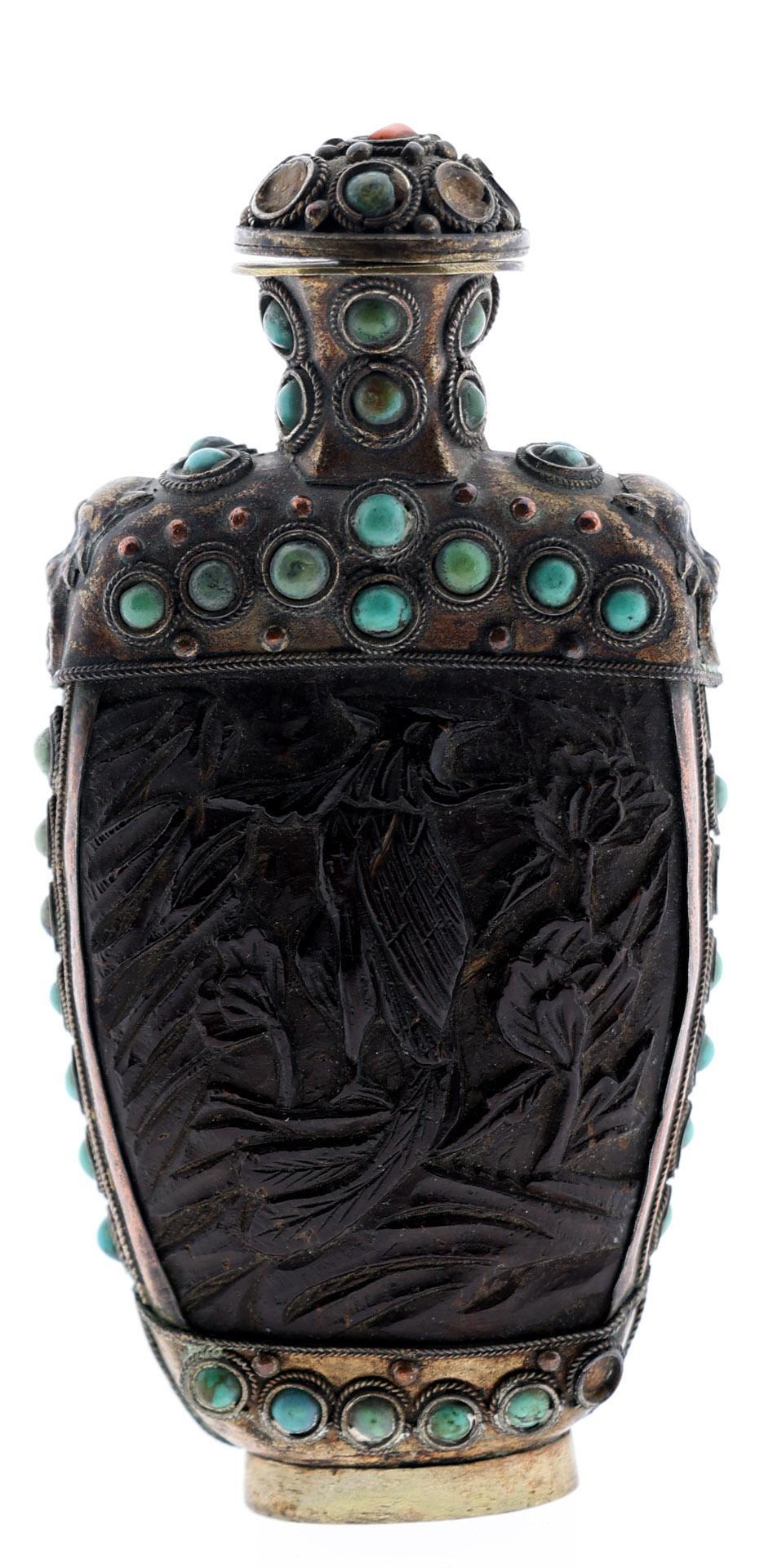 Nepalees houten gesneden odeurflacon afgewerkt met koper en turkooizen steentjes, h 11 cm