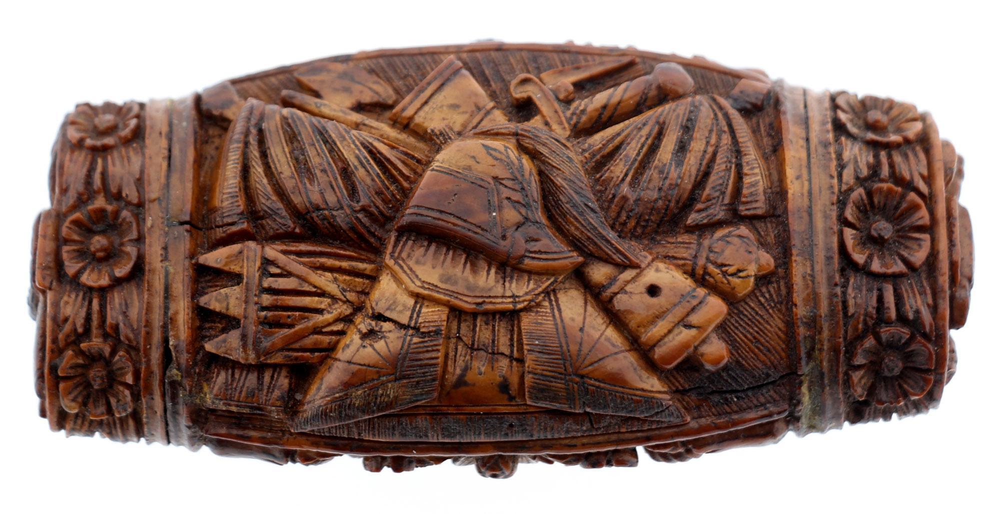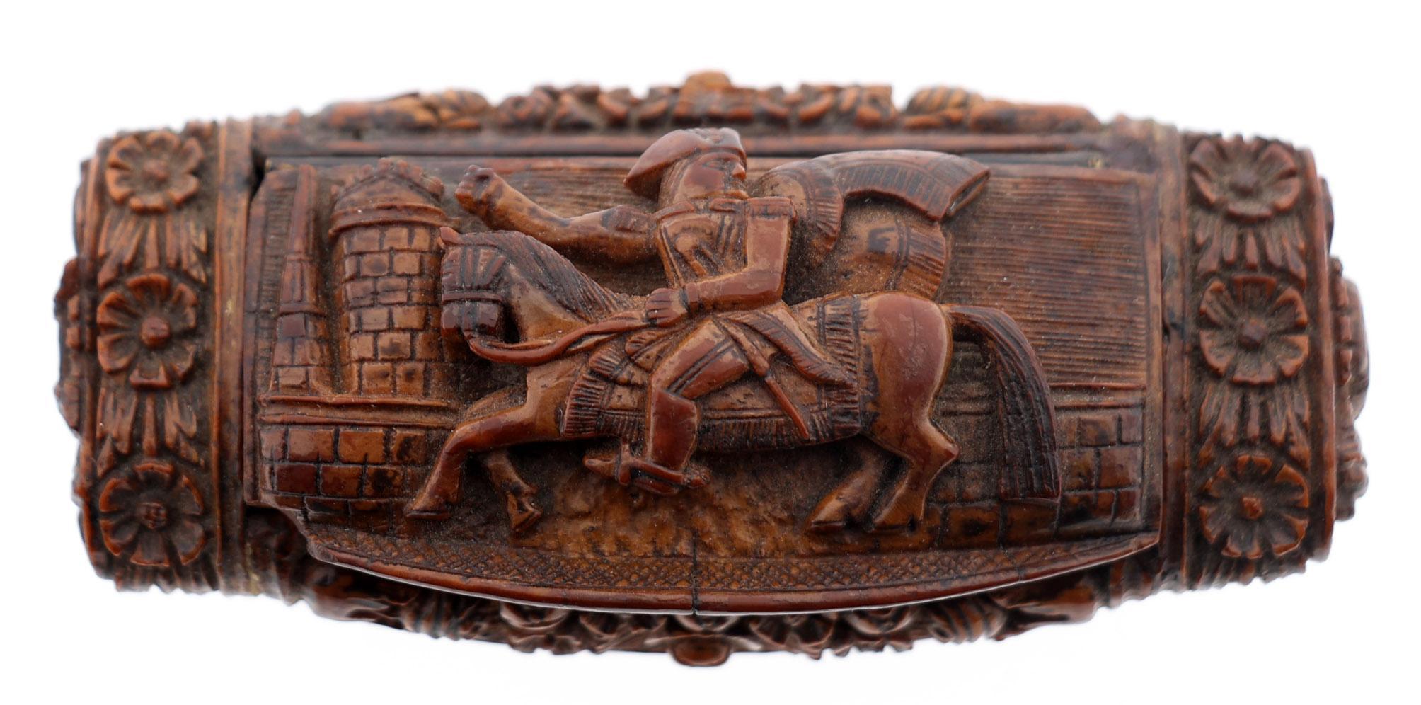 Buxushouten coquille snuifdoos met op de deksel afbeelding van man te paard, op achterzijde verzameling wapens en een helm, Frankrijk, ca.1800, L.9,5 x h.3 cm.
