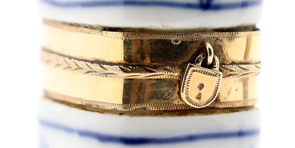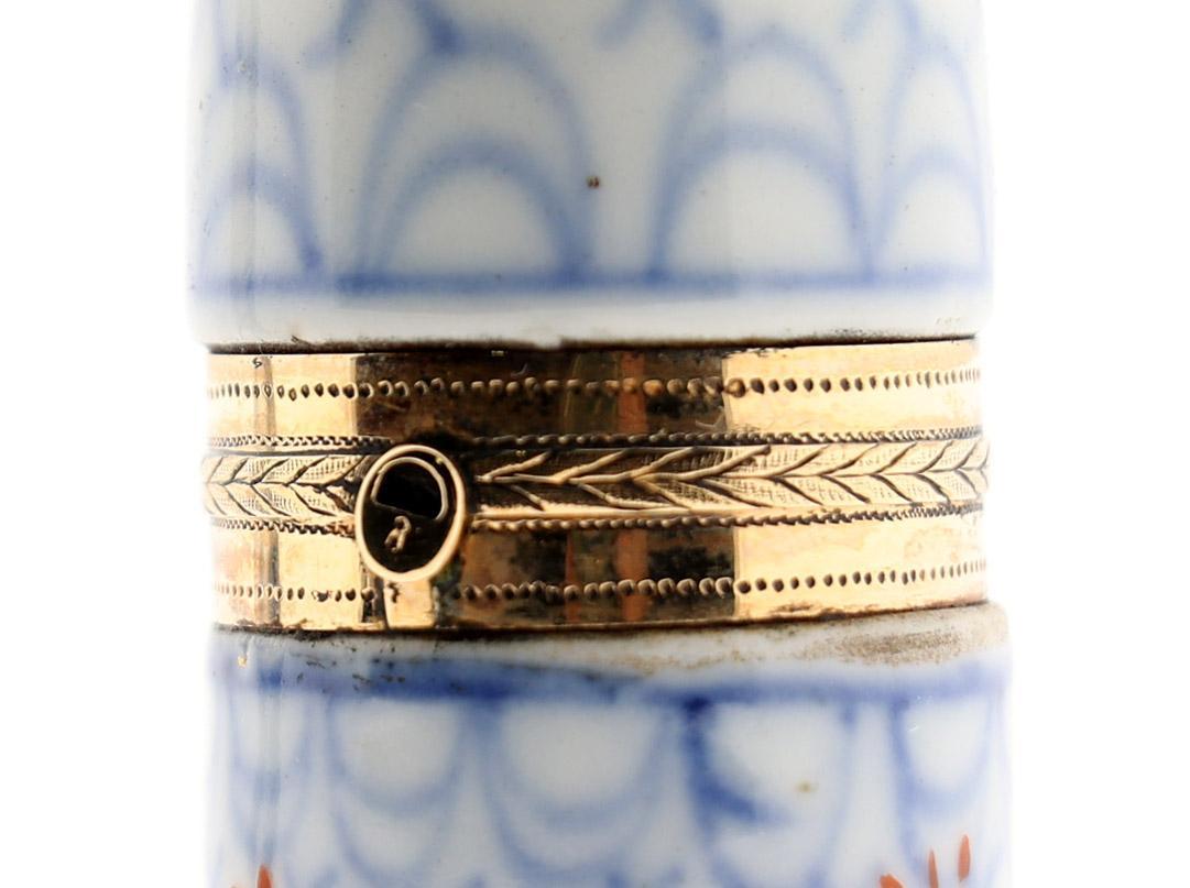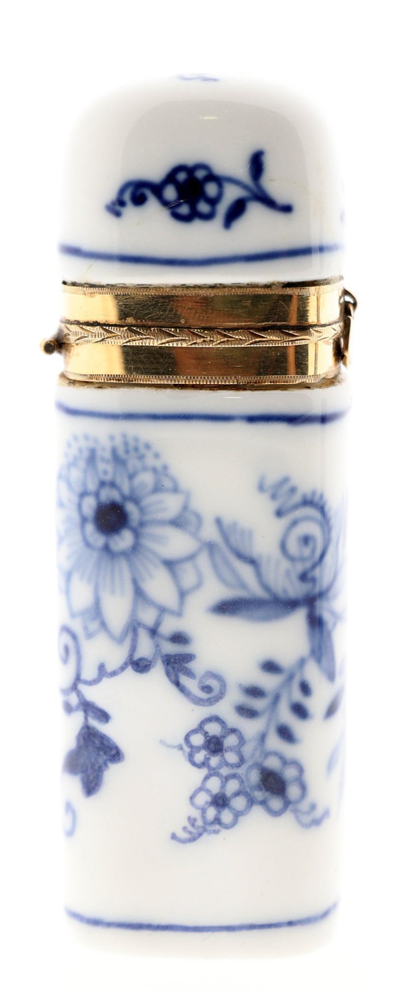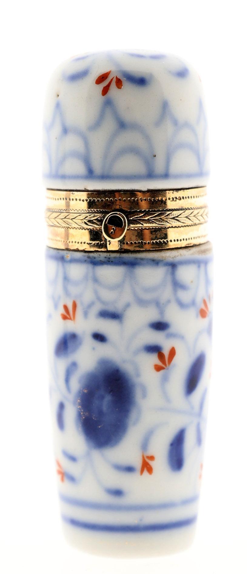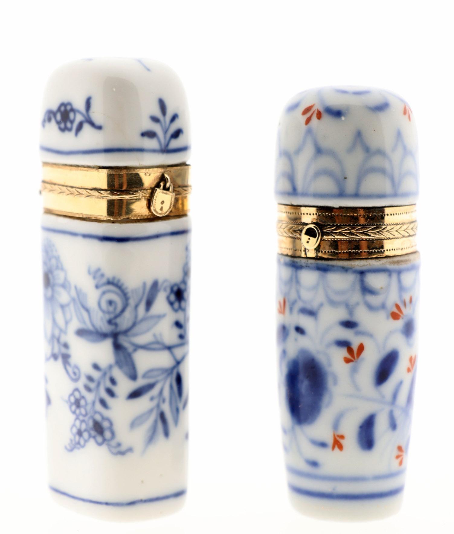 Blauw/witte en blauw/rode Europees porseleinen odeurflacons afgezet met gouden randen, h.7,5 en h.9,2 cm., eind 19e eeuw en ca.1900