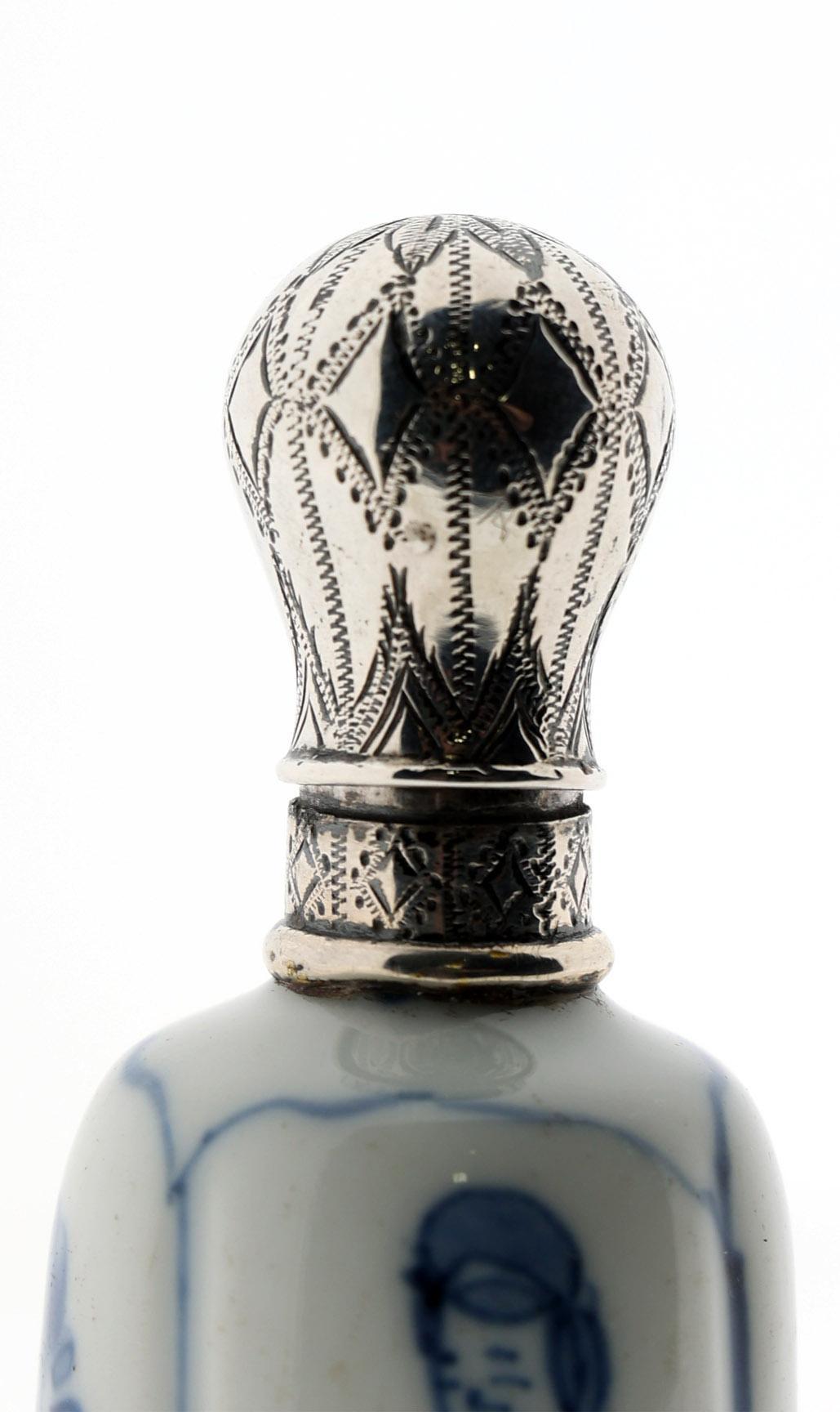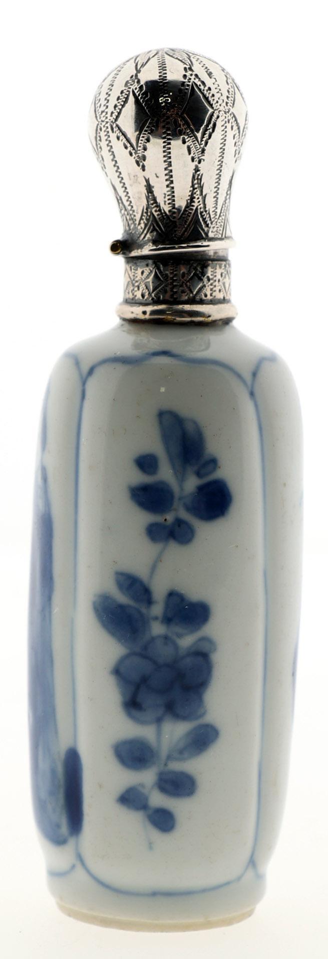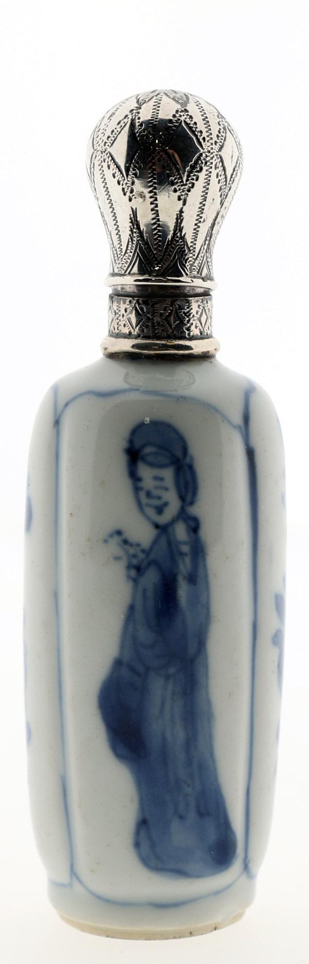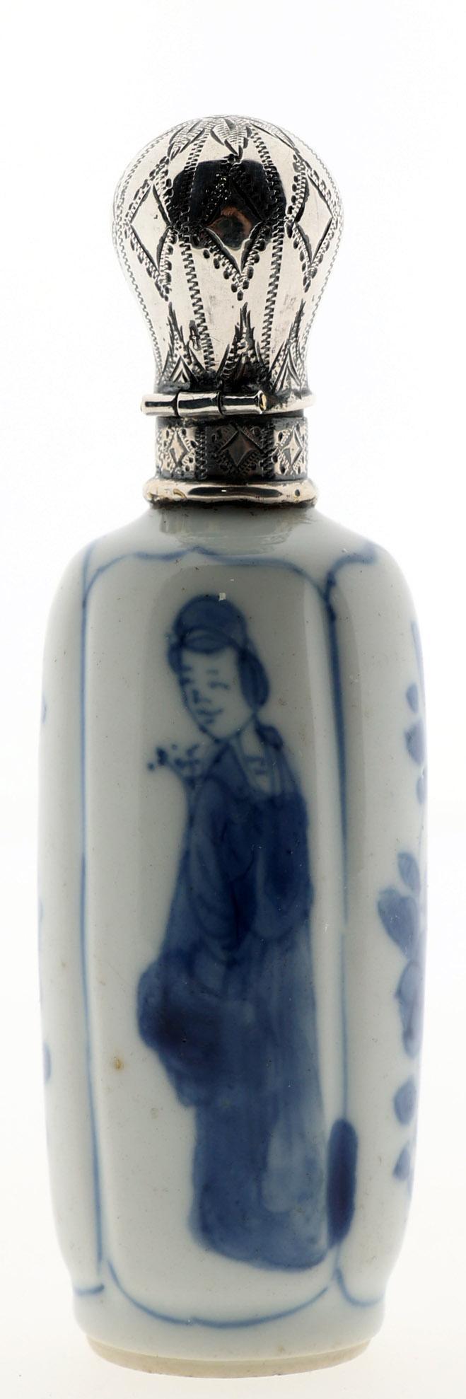 Blauw/wit met Lange Lijs personen gedecoreerde Chinees porseleinen odeurflacon met zilveren dop, China ca.18e eeuw (dop), Nederland 19e eeuw, h.10 cm.