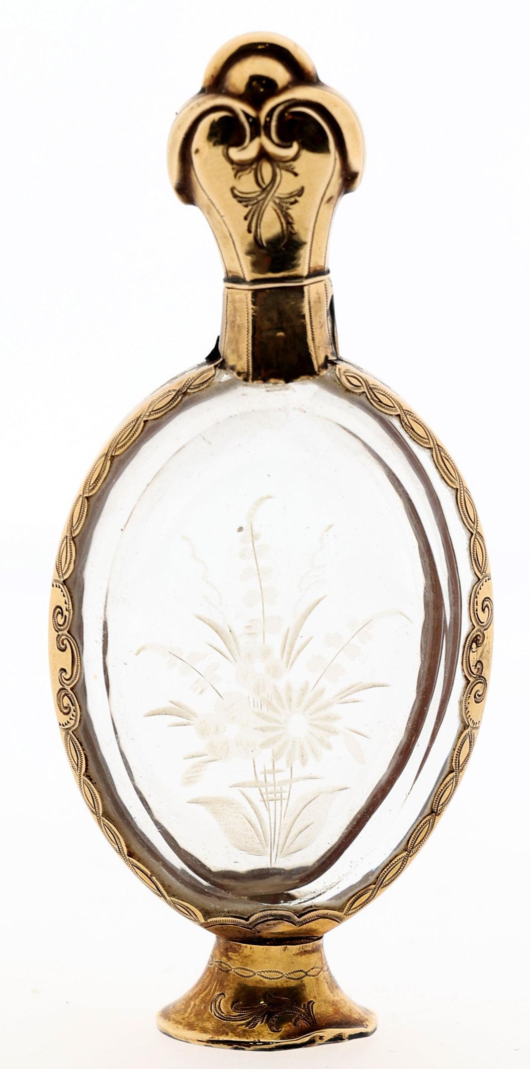 Antieke ovale met bloemen gegraveerde odeurflacon met gouden monturen en dop, Holland gekeurd, 2e helft 19e eeuw, h.10,2 cm.