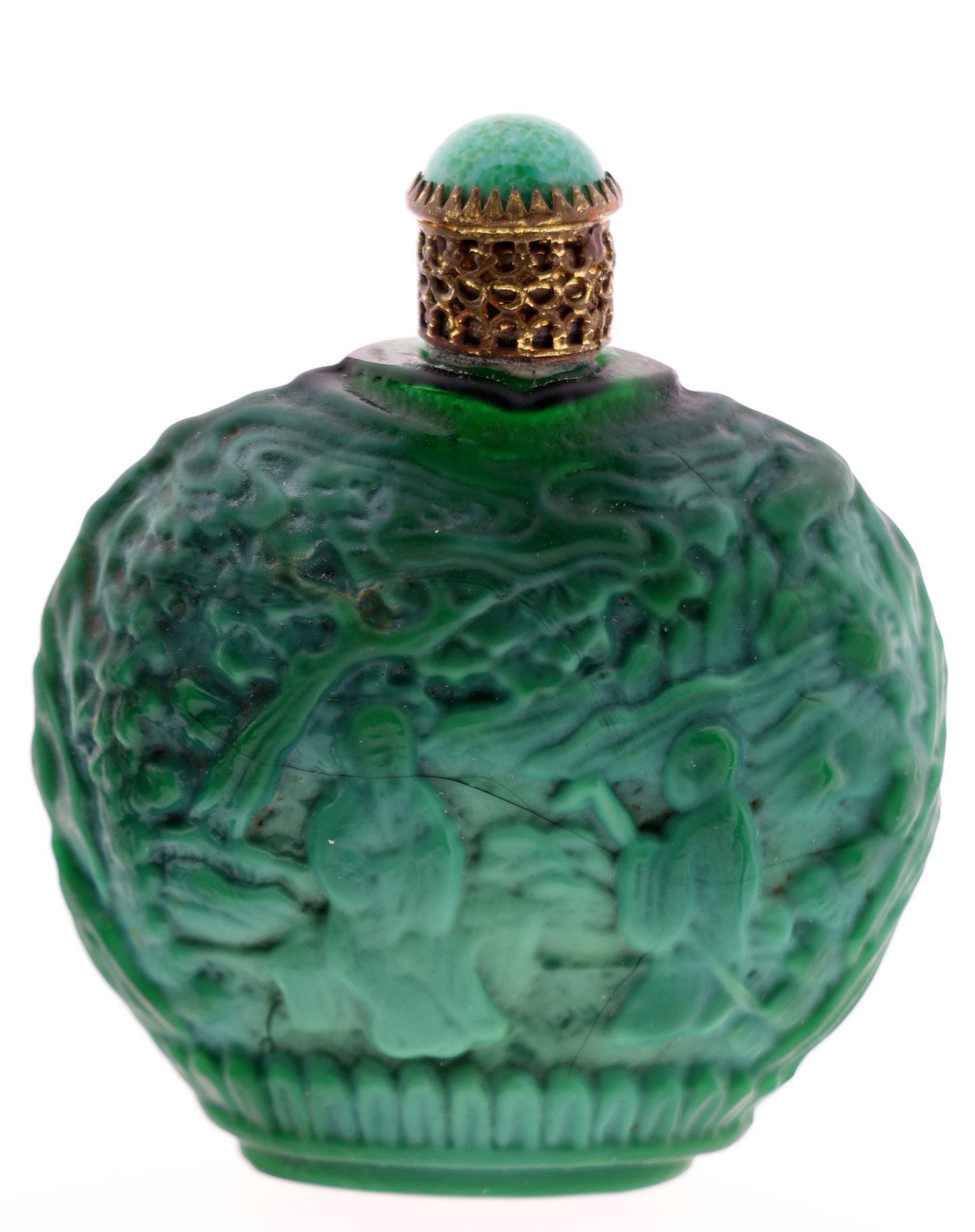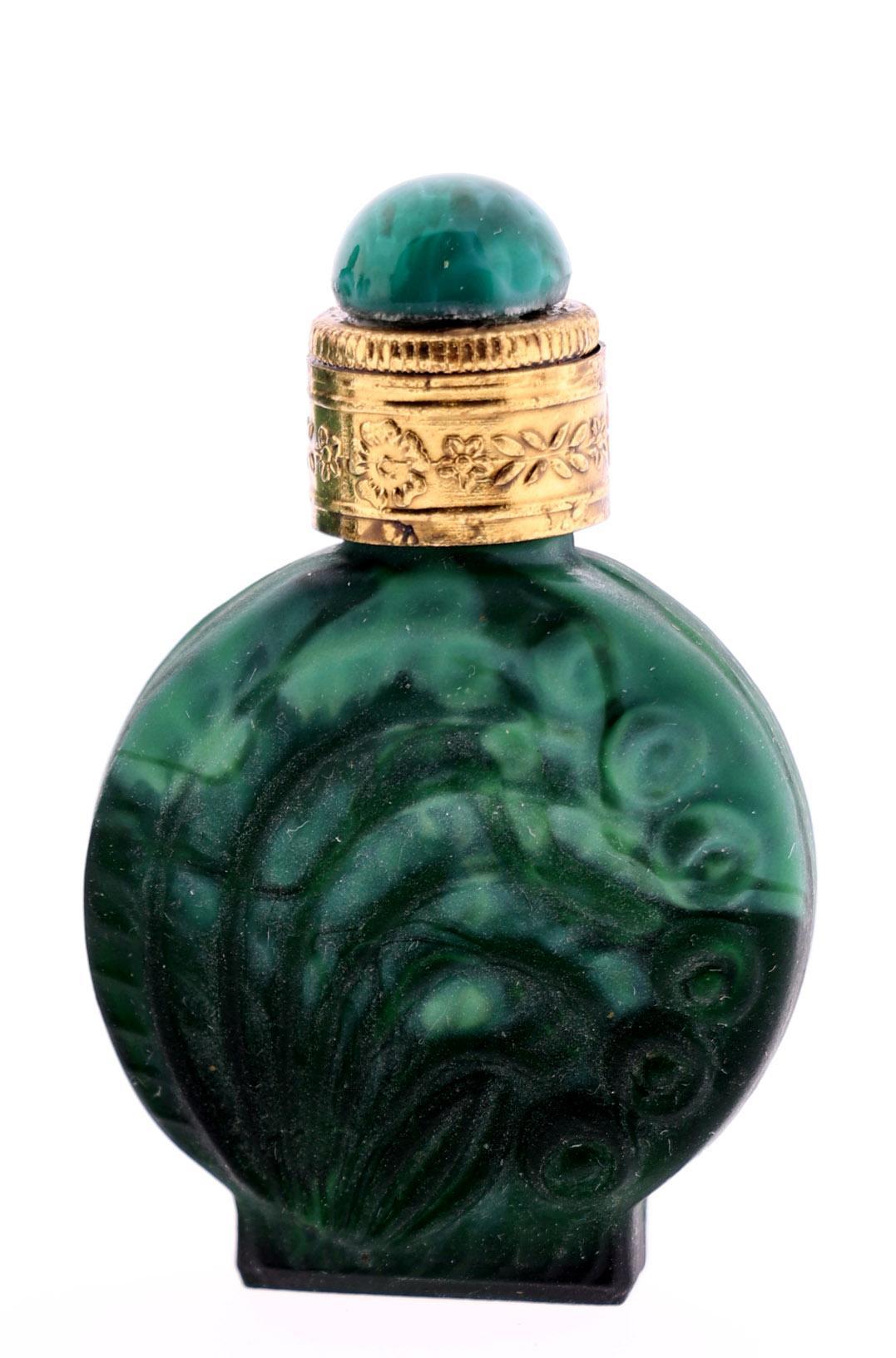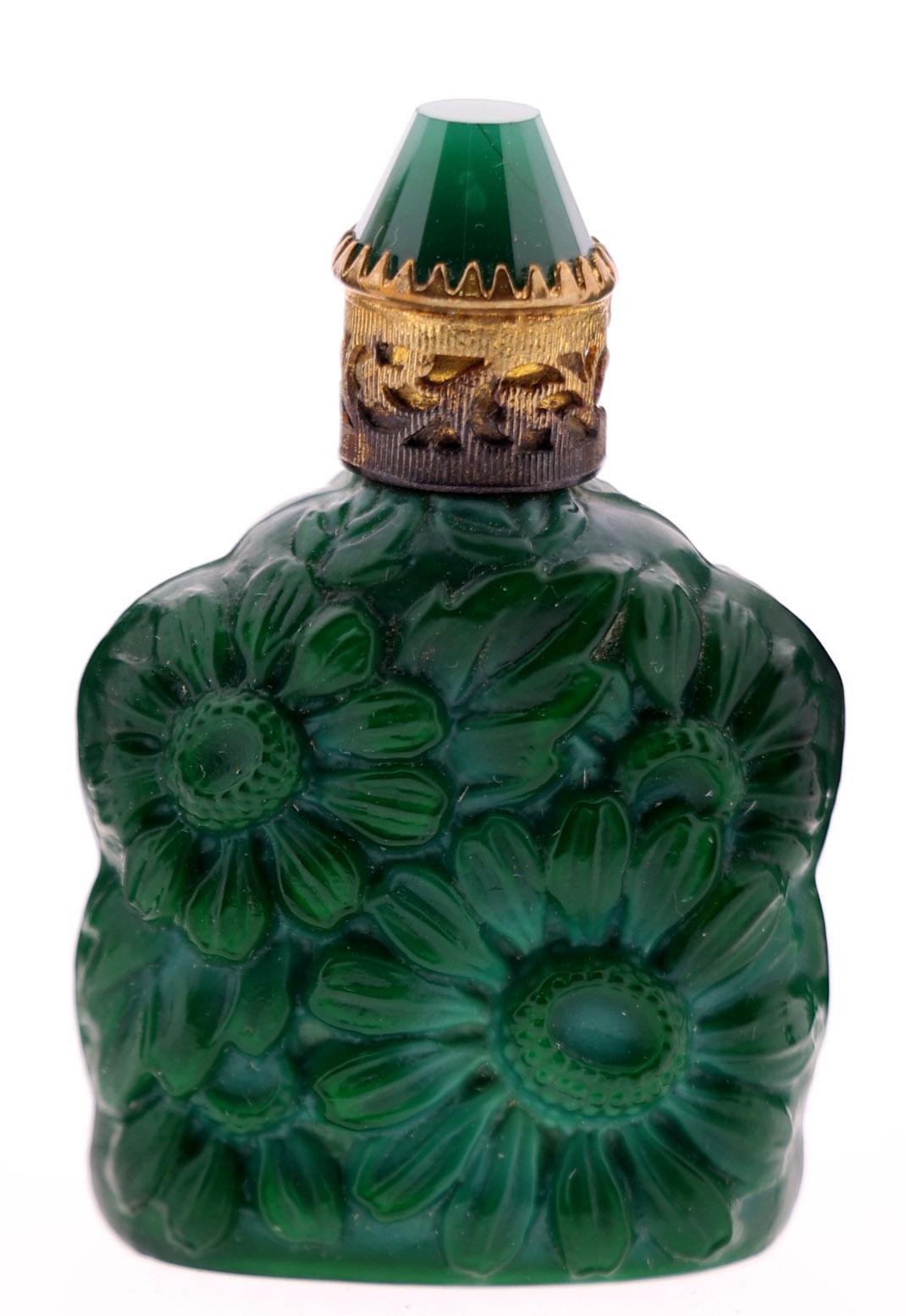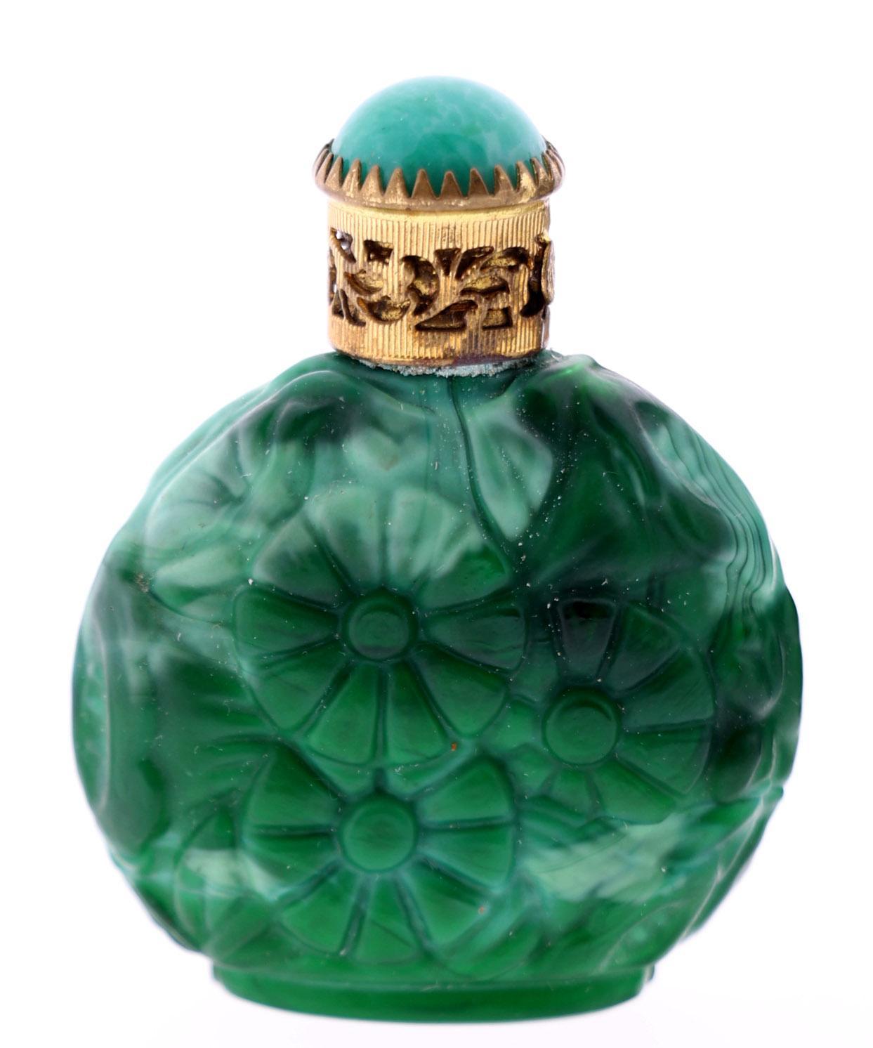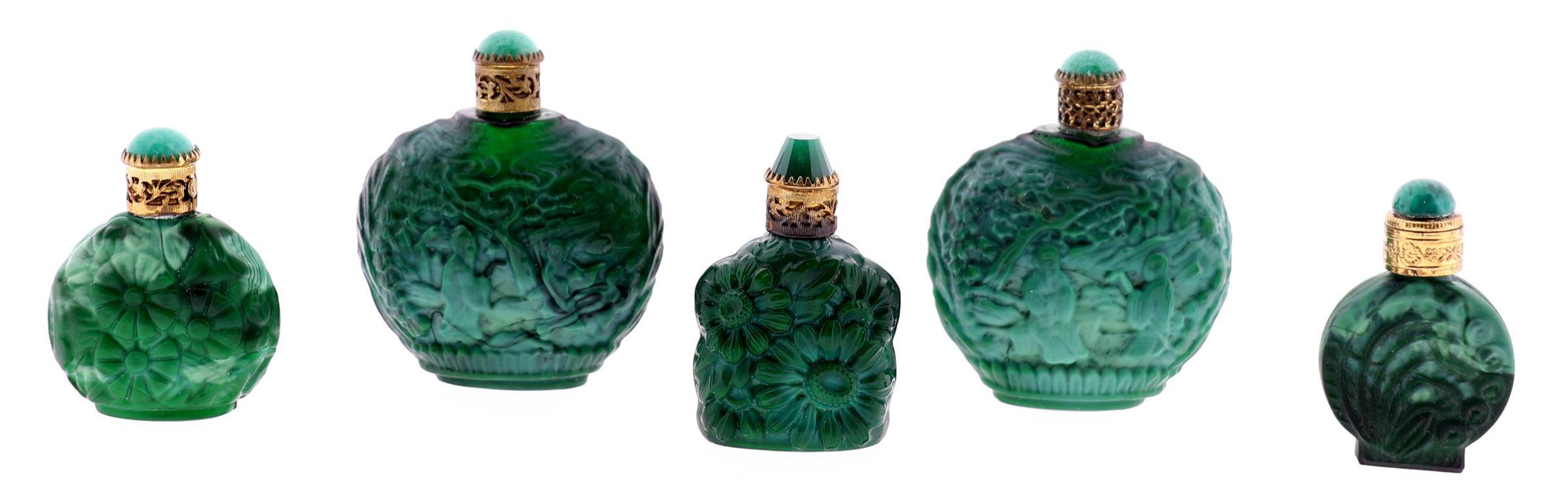 5 Rijk bewerkte Tjechisch groen glazen odeurflacons, variërend h.7 t/m 5,5 cm. met goudkleurige doppen