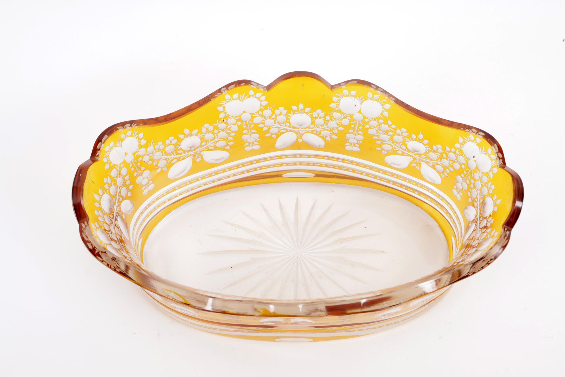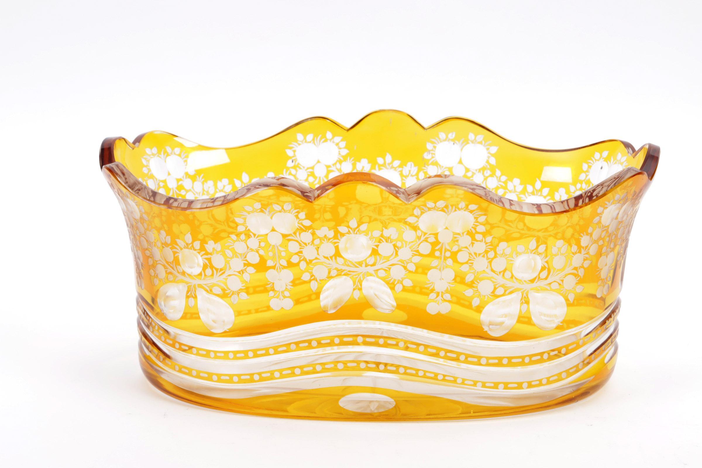 Geel Boheems kristallen schaal, h.15 x b.32 x d.19 cm.