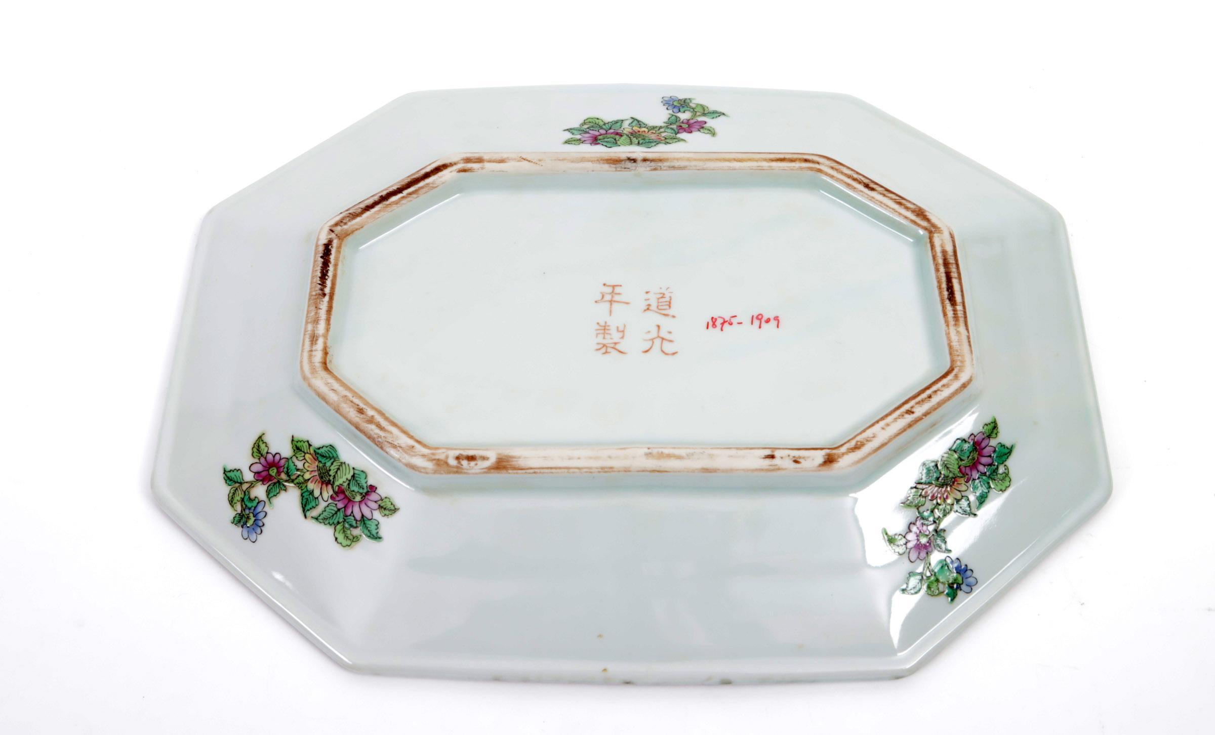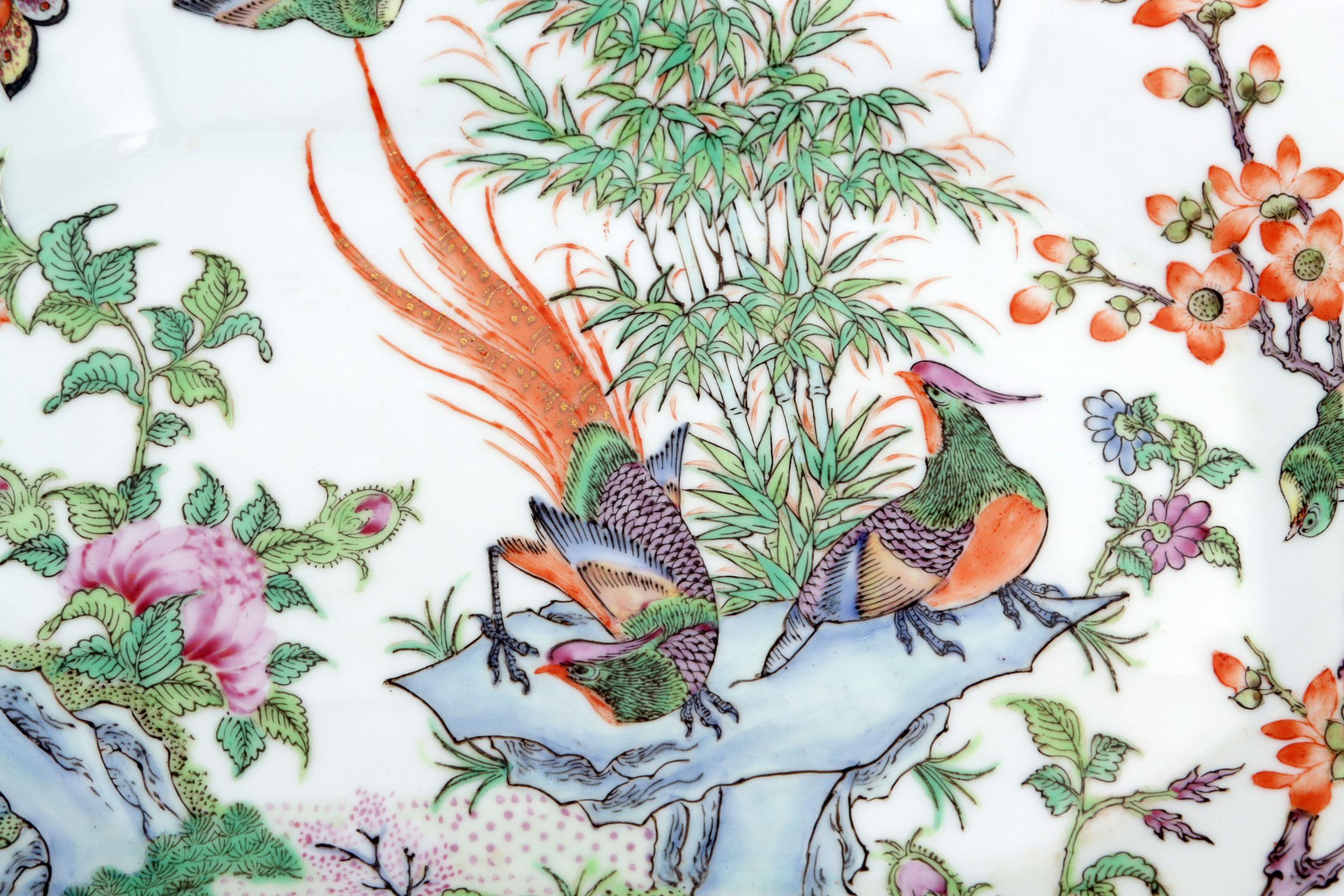 Met bloemen, vogels en vlinders gedecoreerde Chinees porseleinen schaal, h.4 x b.36 x d.26 cm.