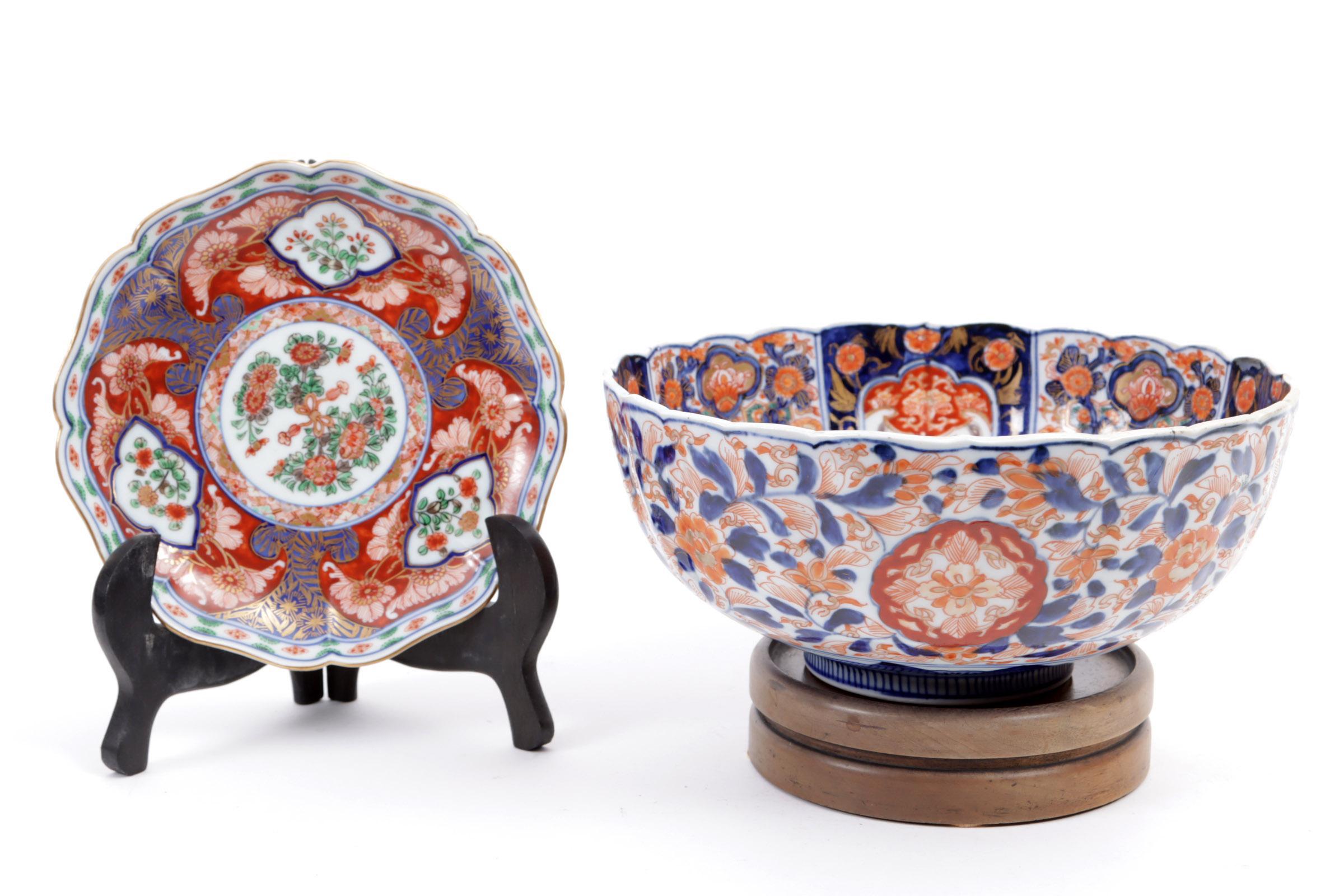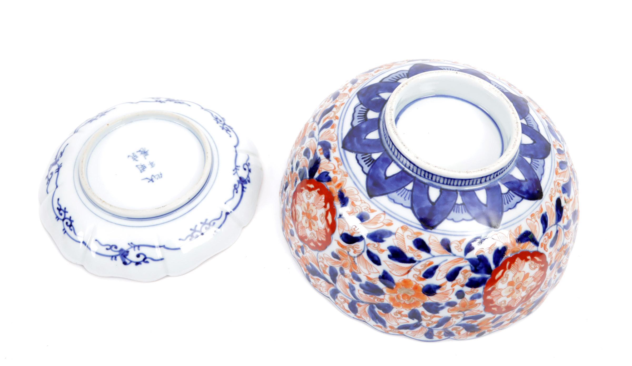 Imari kom, h.15 x diam.25 cm. en Imari bordje, diam.18 cm.