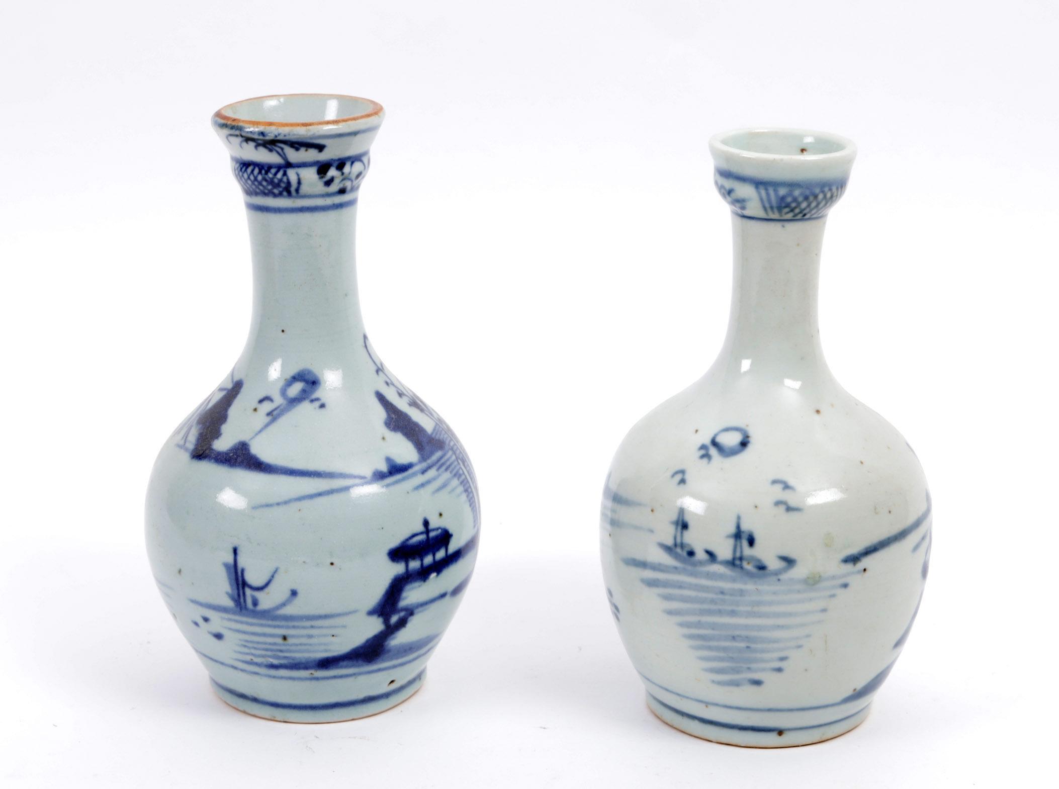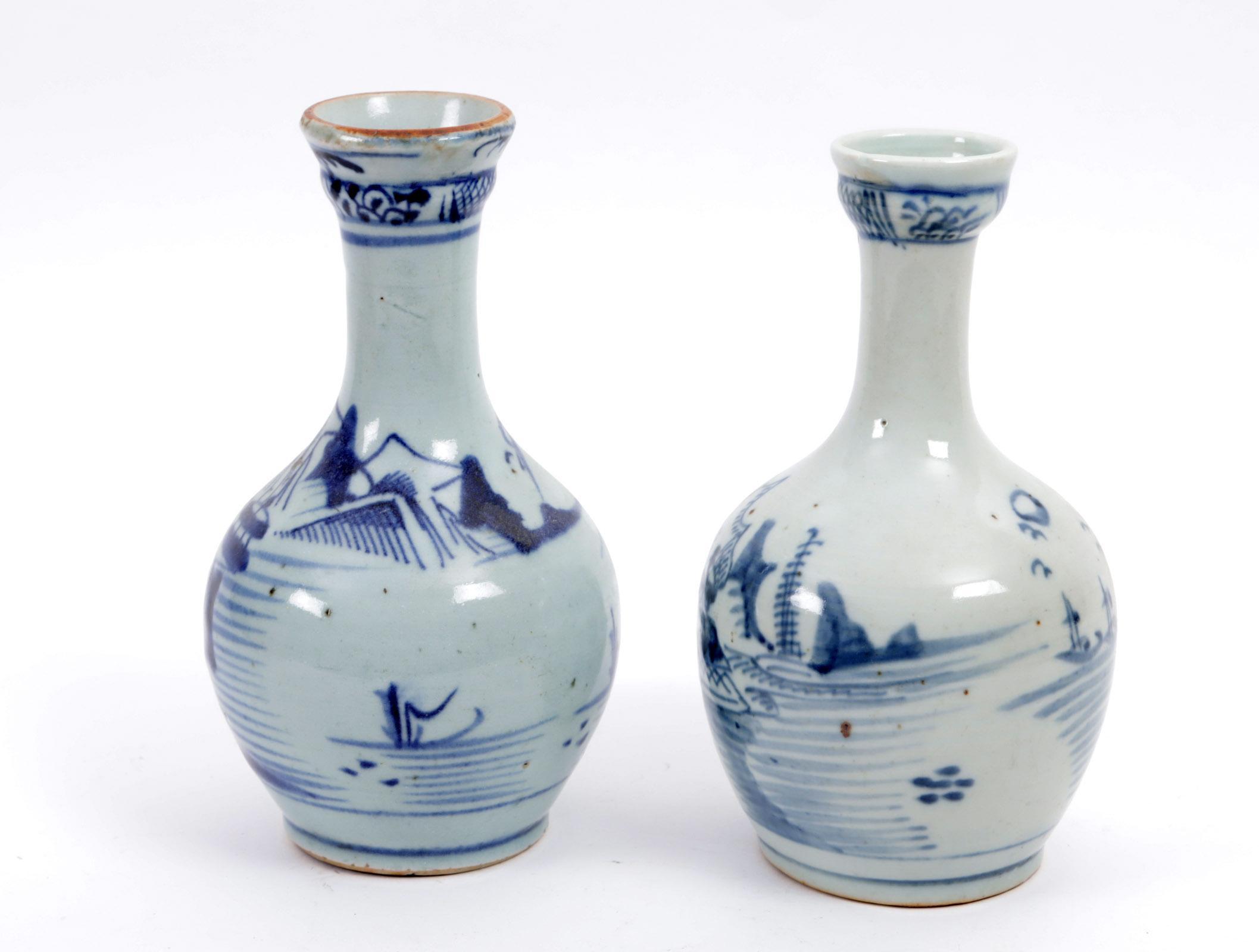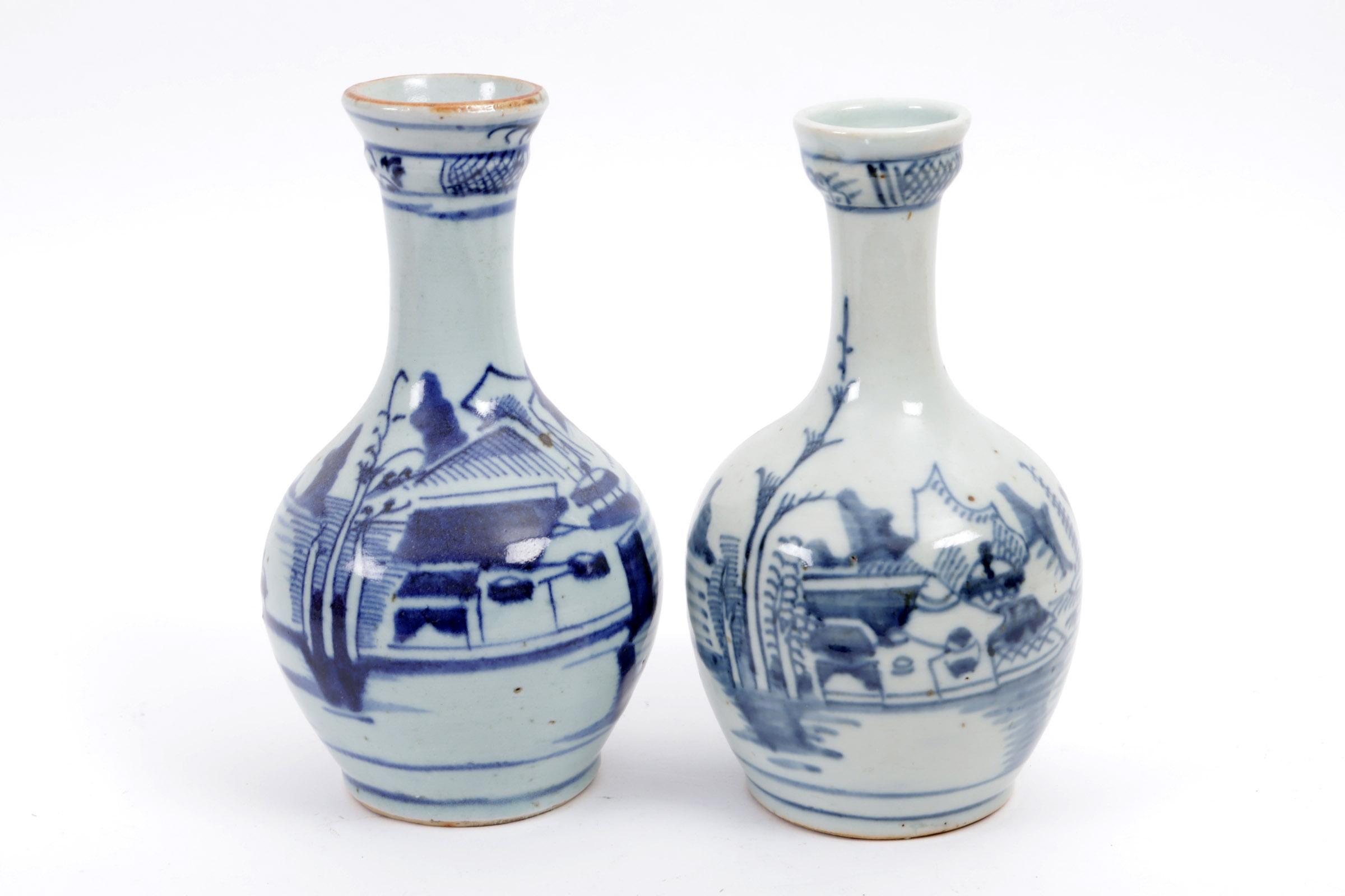 Koop van 2 blauw/wit gedecoreerde Chinees porseleinen kraagvazen, h.21 cm.