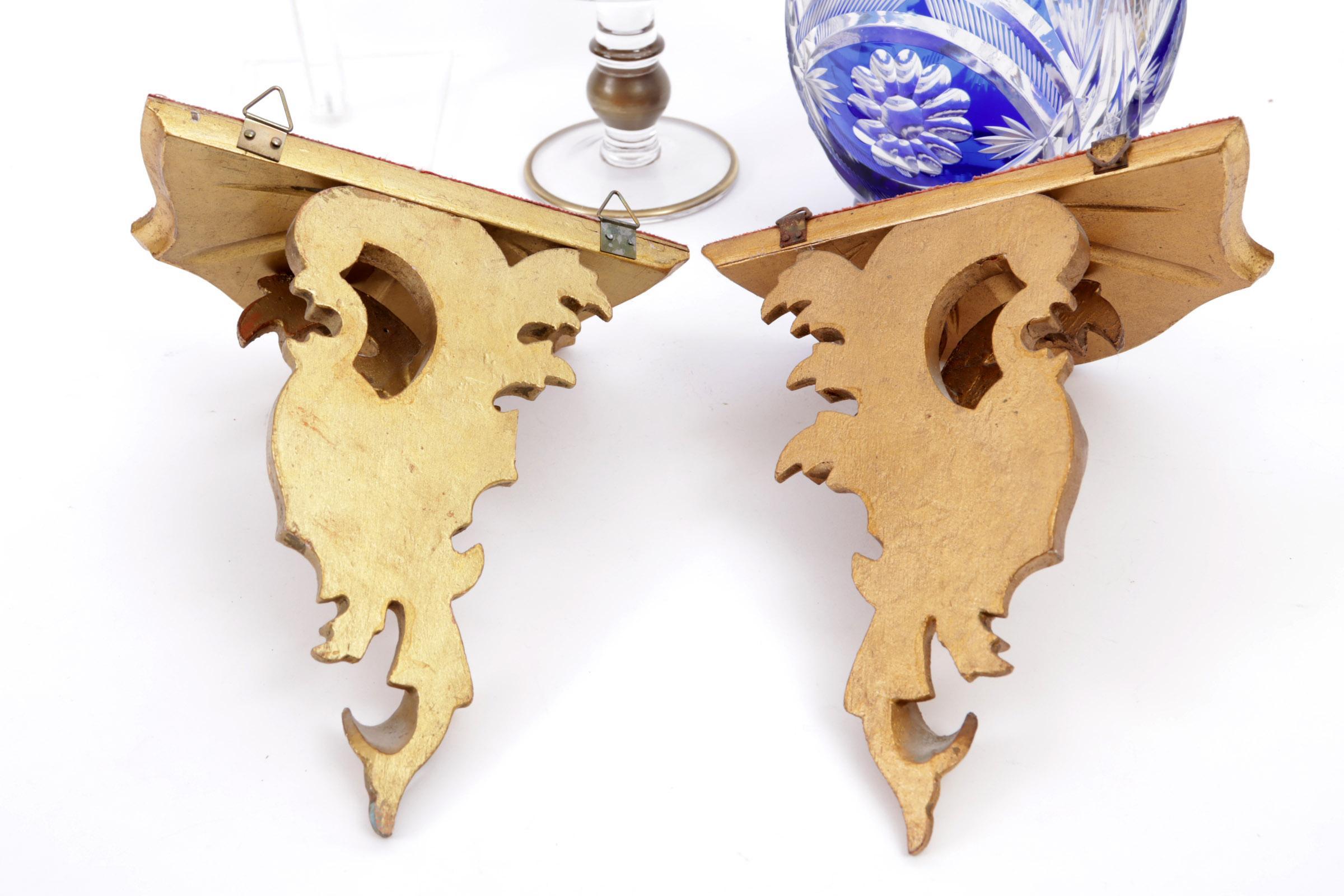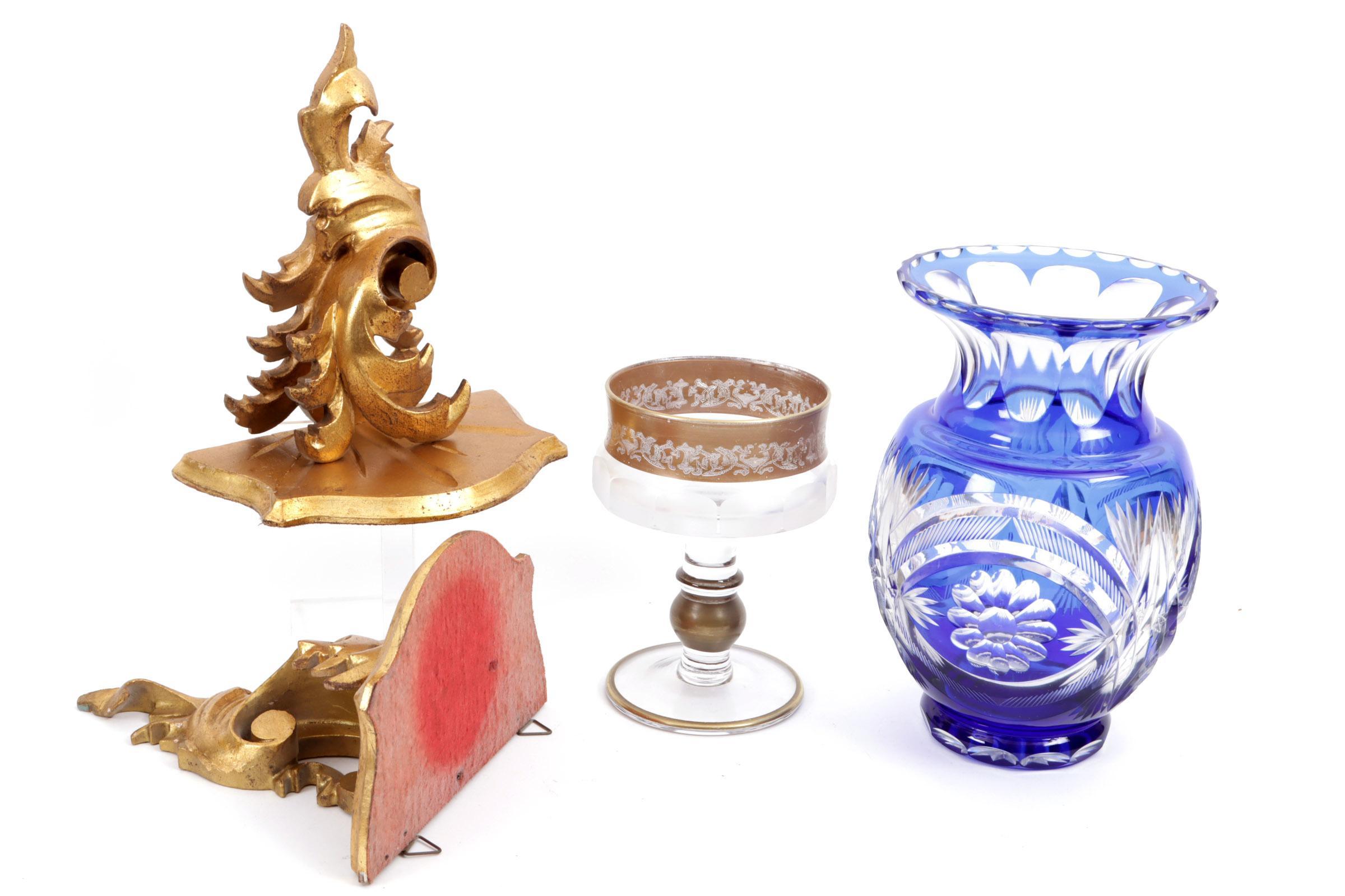 Koopje van blauw Boheems kristallen vaas, goudgedecoreerde kristallen beker en 2 goudkleurige wandconsoles
