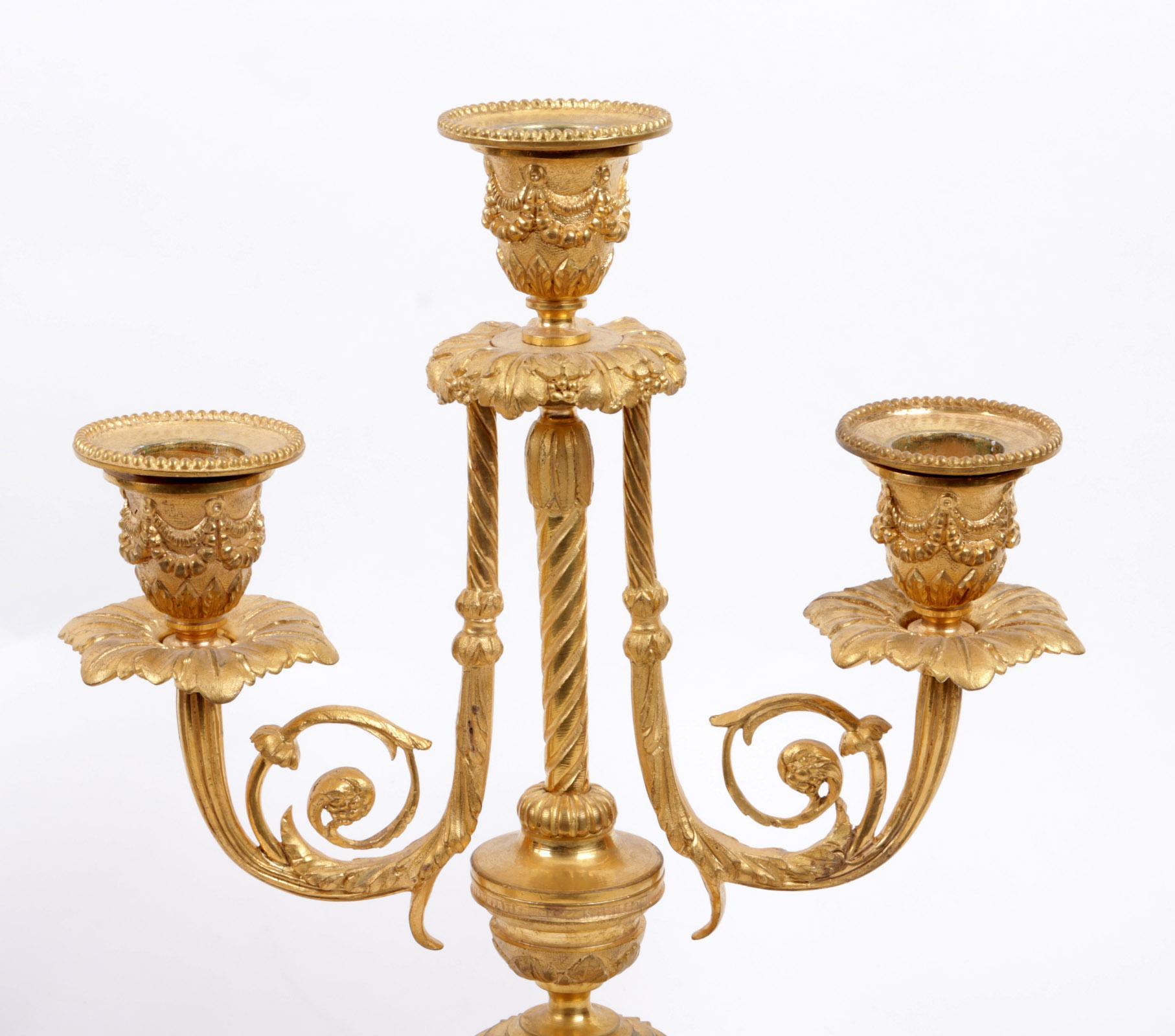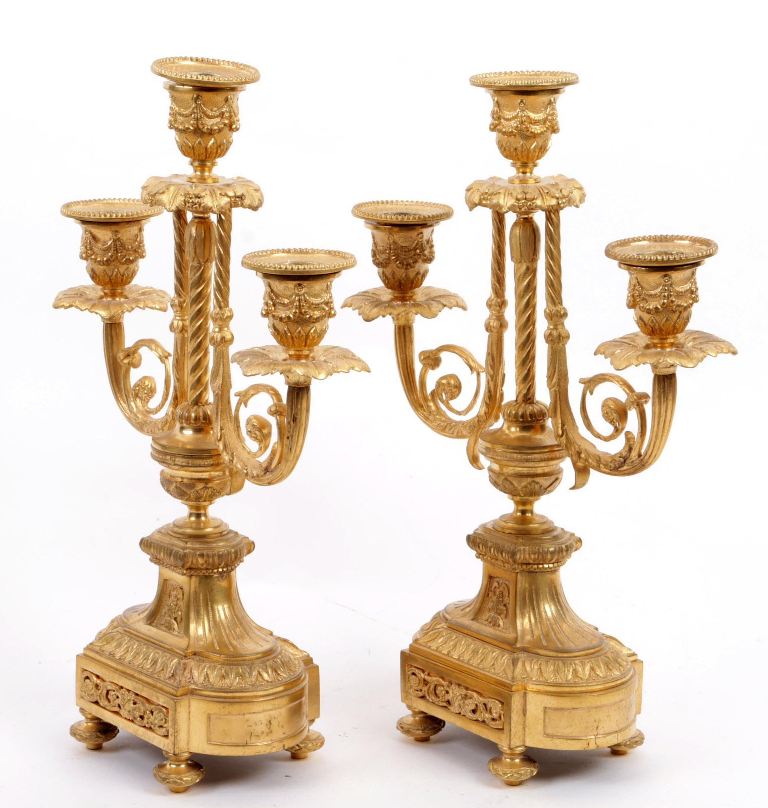 Stel antieke verguld bronzen 3-lichts kandelaars, Louis Seize stijl, h.31 cm.