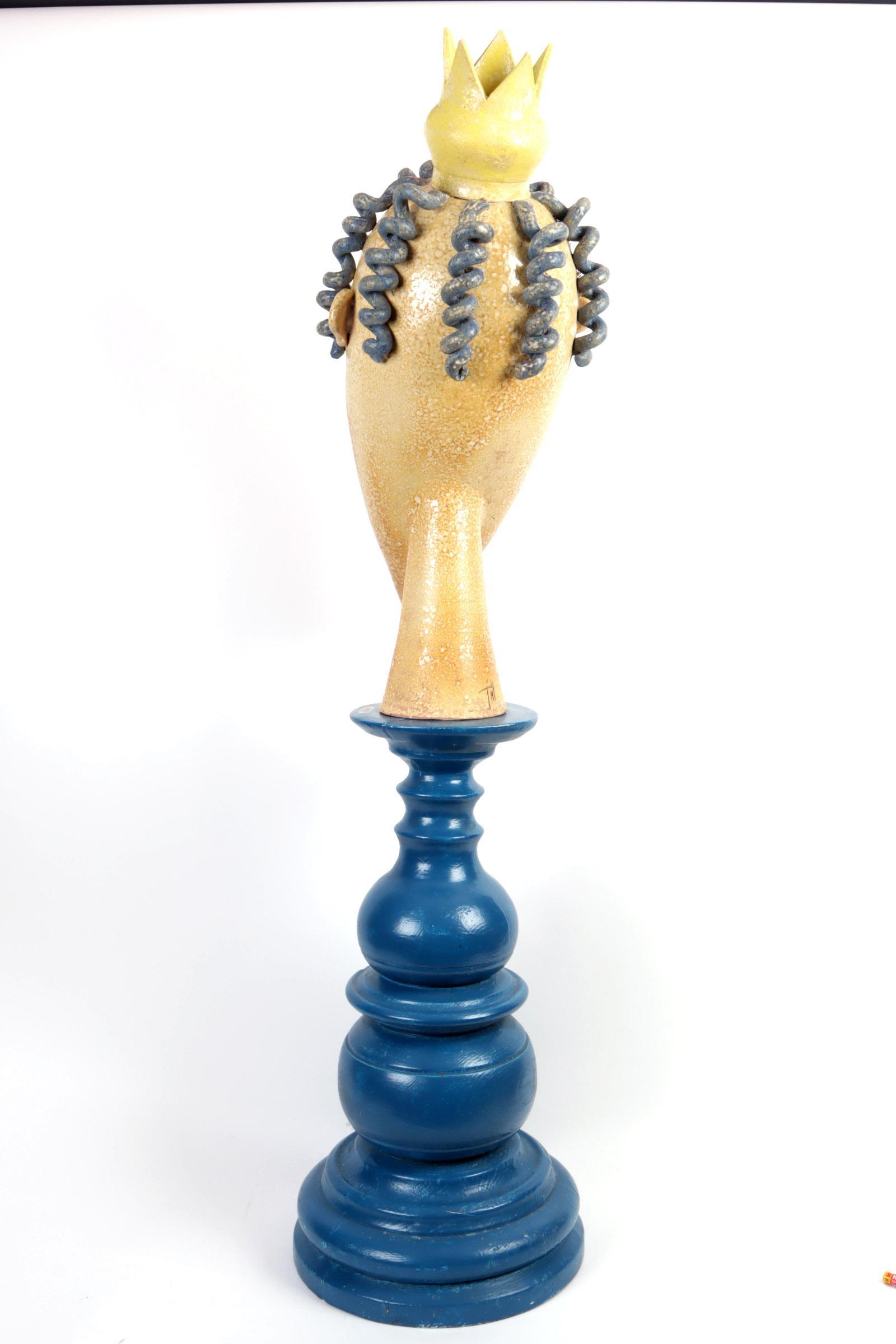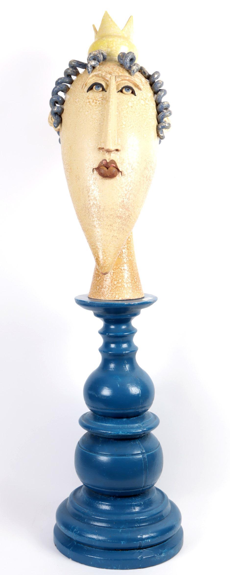 Till Donner (1947), 'De Schaakkoningin', keramieken sculptuur op houten voetstuk, h.108 cm., provenance: particuliere collectie/Galerie la Lanka, Friesland