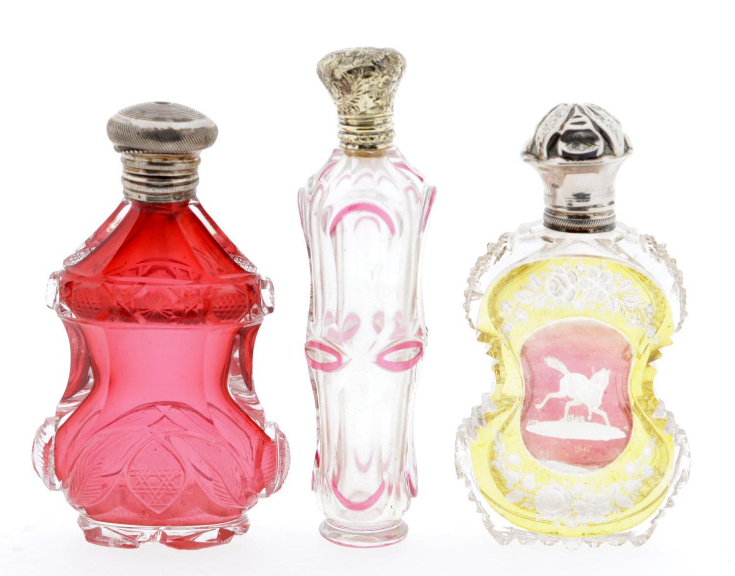 Antieke rood met roze overlay kristallen odeurflacons, Frankrijk 19e eeuw, h.10,7 cm., rode deurflacon met zilveren dop, Nederlands, 19e eeuw en een gele met paard gegraveerde odeurflacon met zilveren dop, Nederland, 19e eeuw