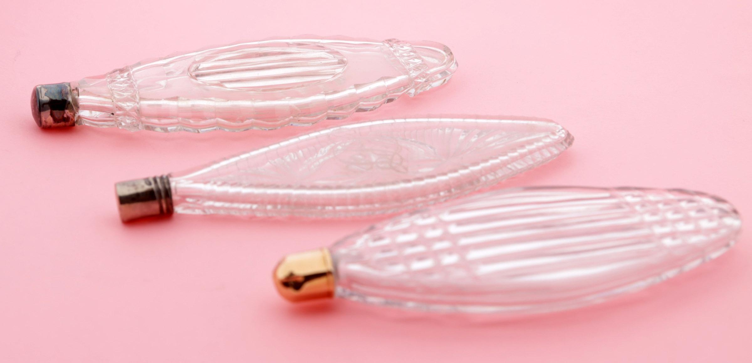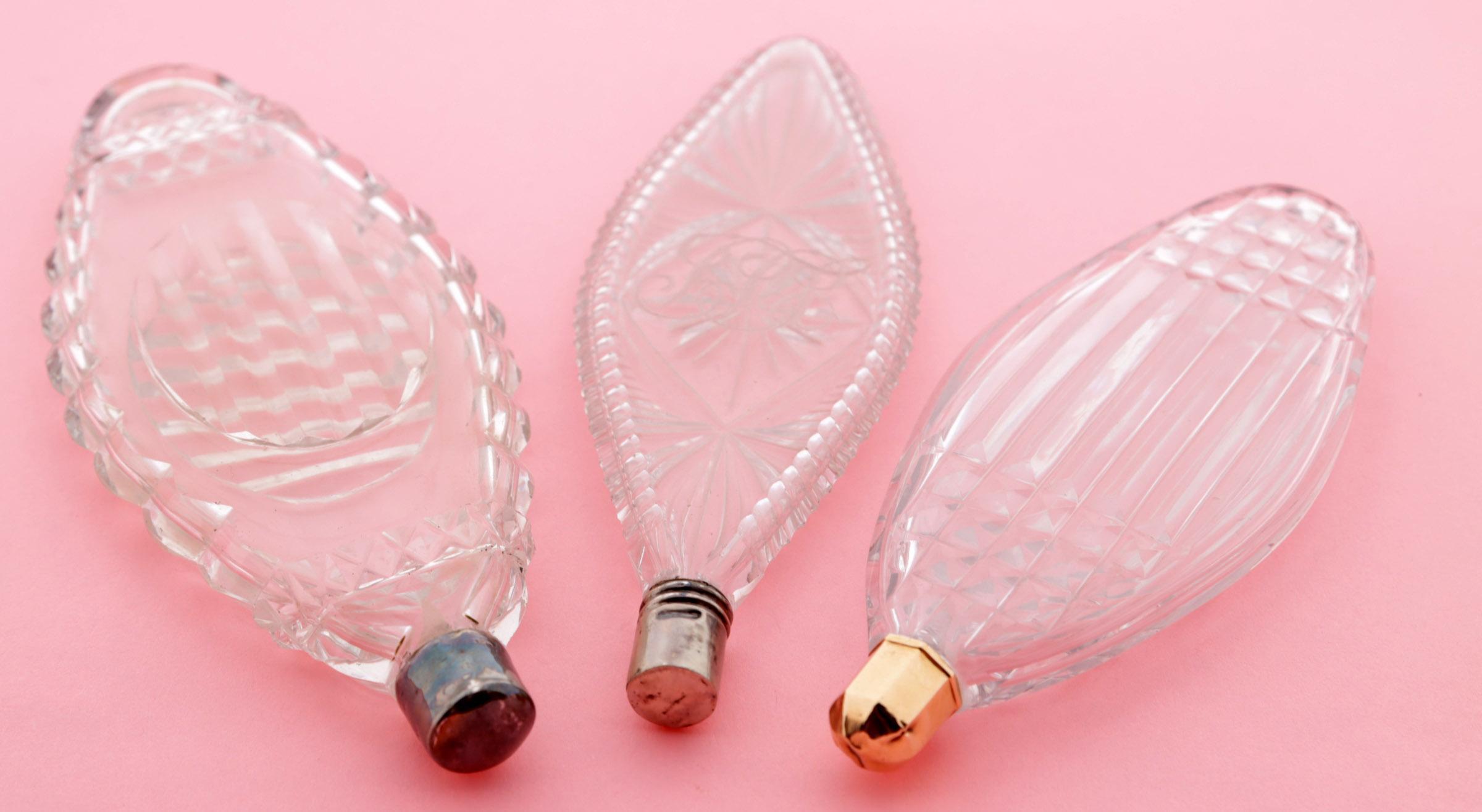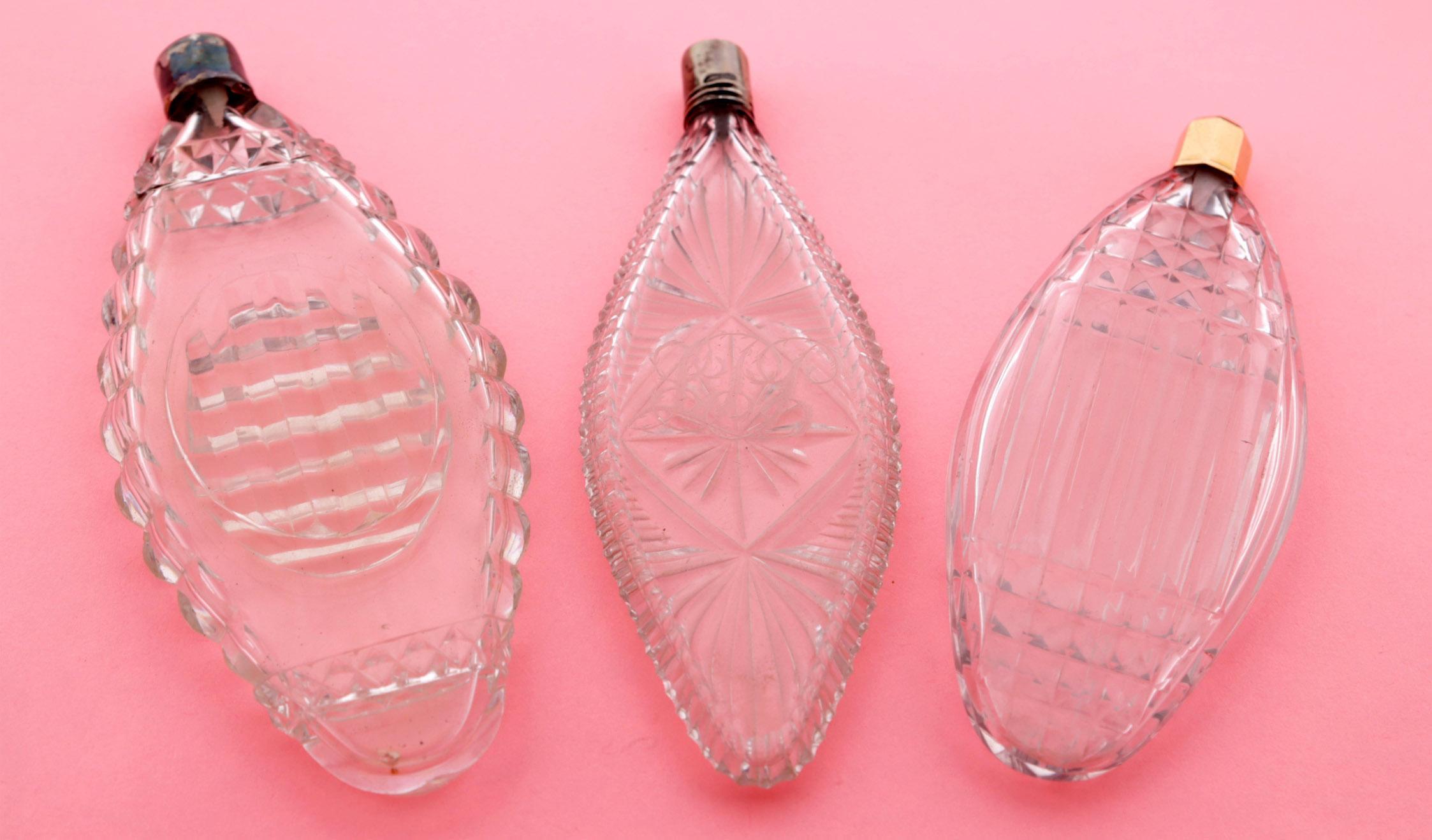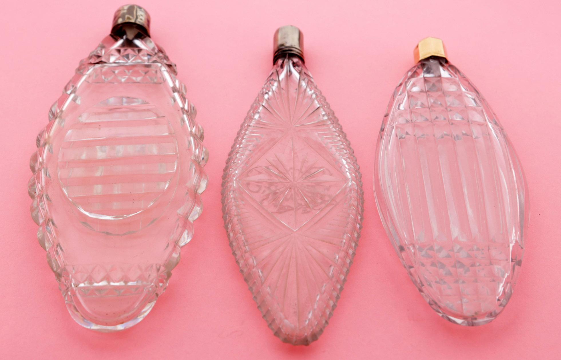 3 Platte Engelse odeurflacons met zilveren en gouden doppen, w.o. 18e eeuw (2x) en 19e eeuw (1x), L.15, 13, 14 cm.