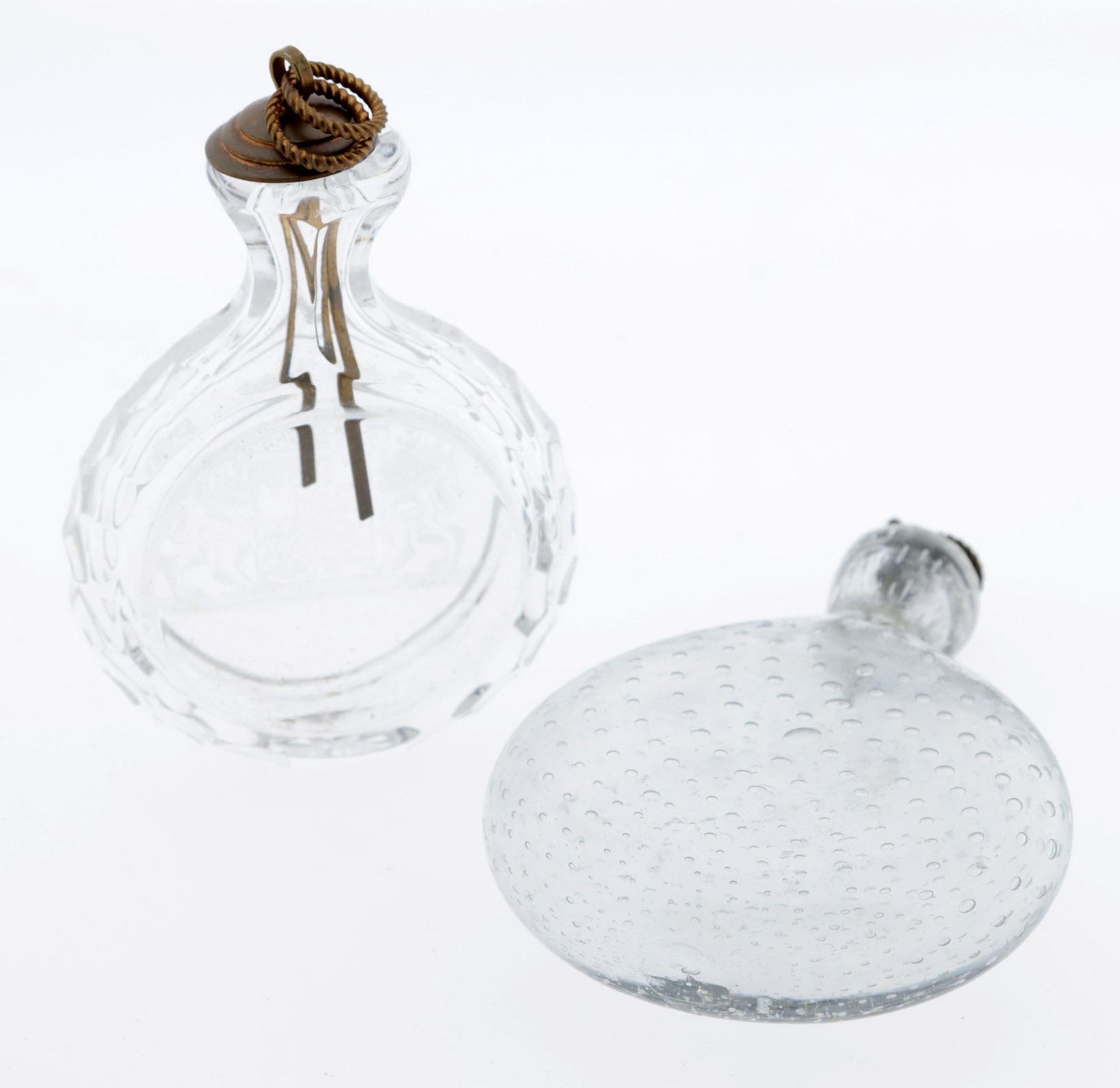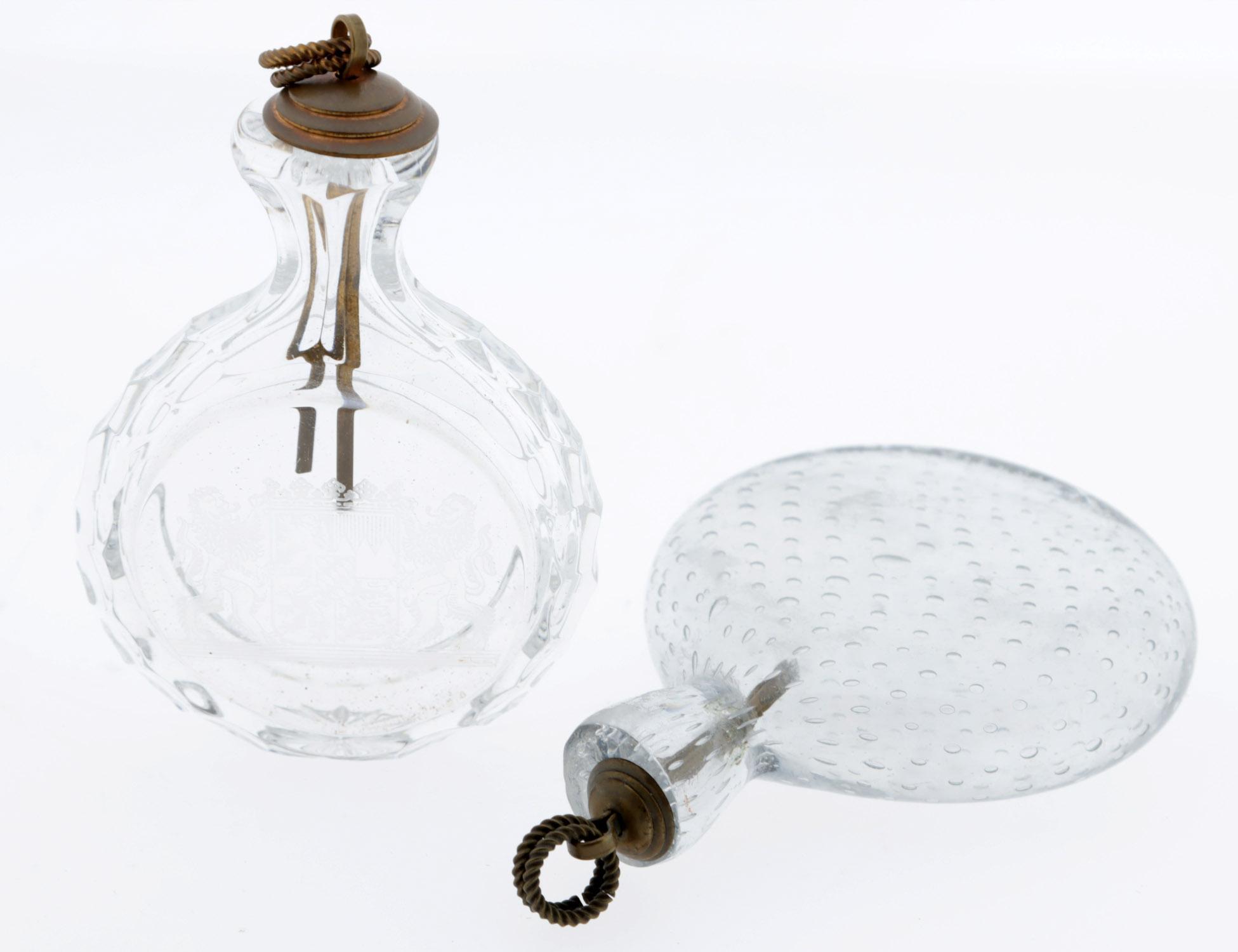 2 Grote met deels gegraveerde kristallen snuif/tabaksflessen, 19e eeuw, h.10 cm.