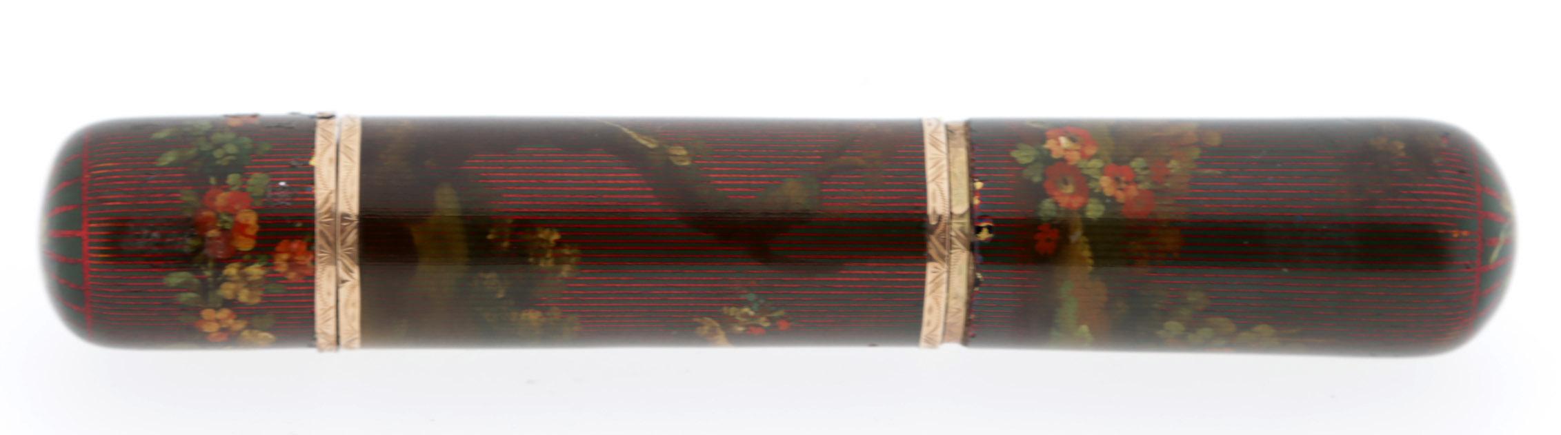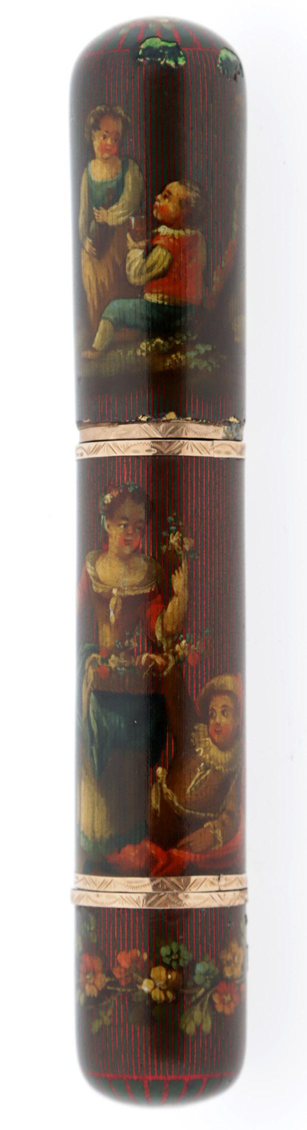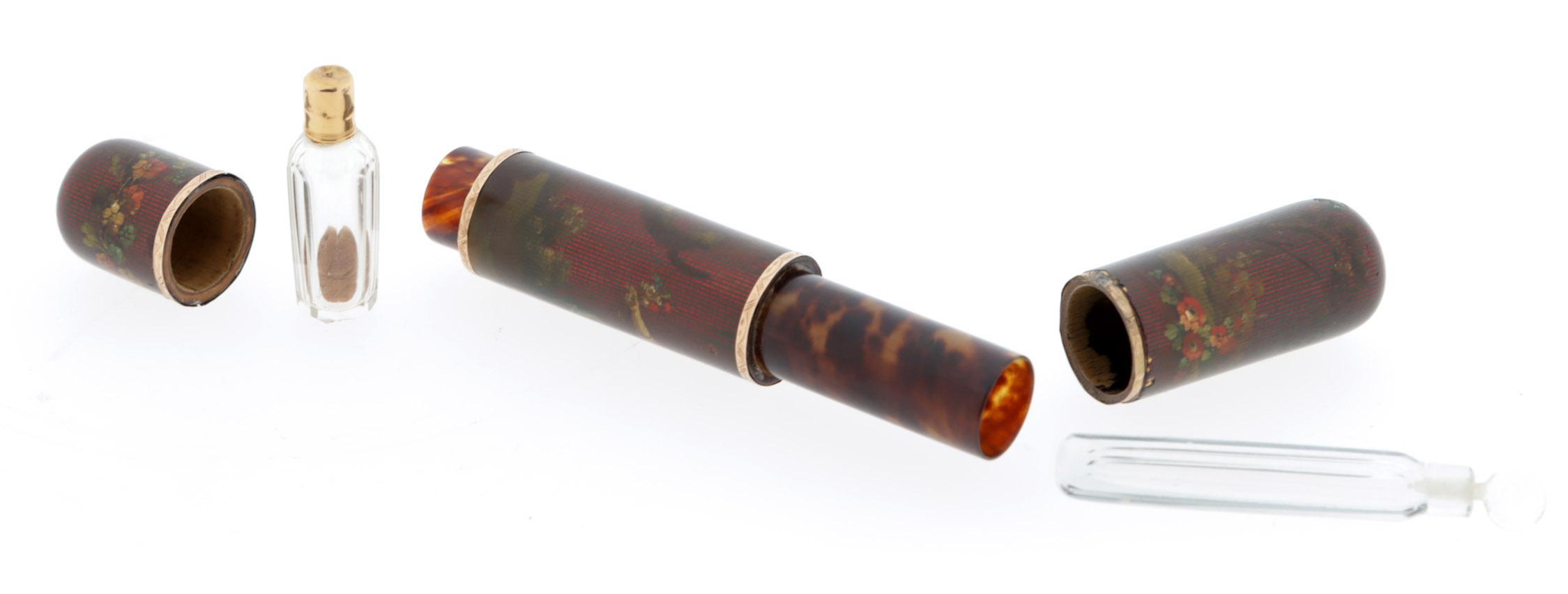 Antiek met goud en schildpad afgewerkte Vernis Martin dubbele odeurflaconhouder, ca.1760, h.14,5 cm.