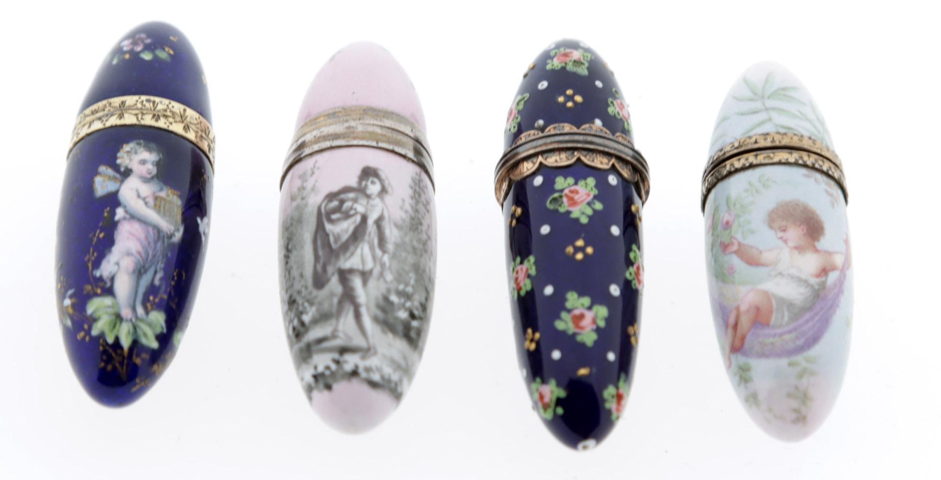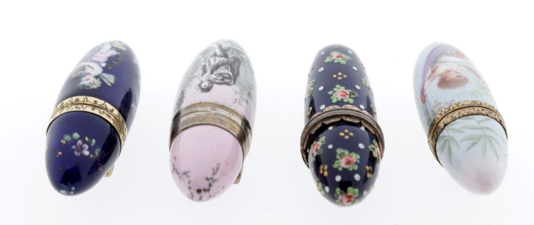 4 Fraai beschilderde emaille odeurflacons met zilveren monturen, h.5 cm.
