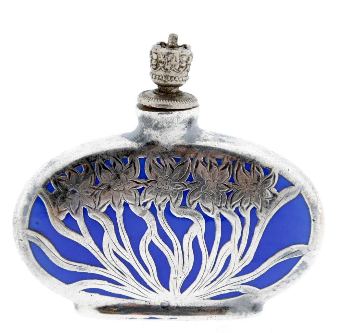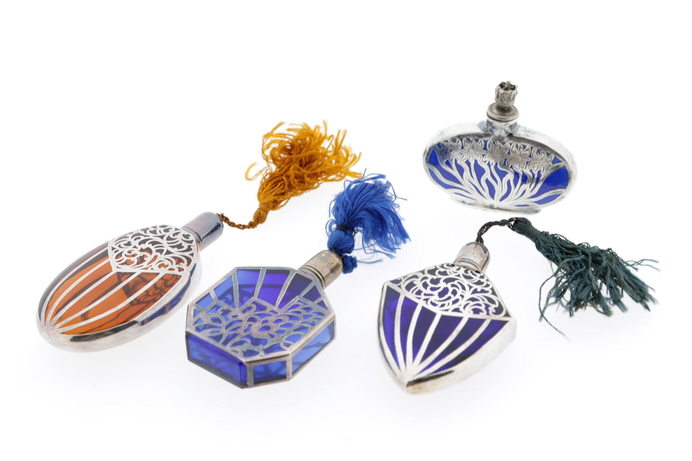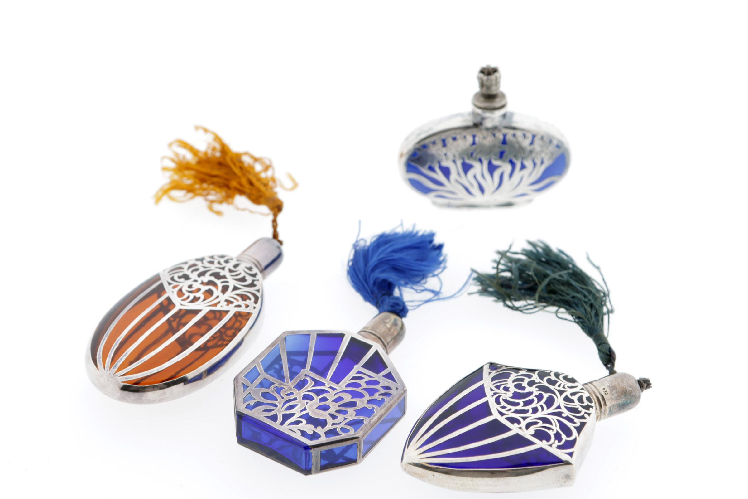 4 Kristallen met zilver afgewerkte Art Deco odeurflacons, h.9, h.8, h.7 en h.6 cm.