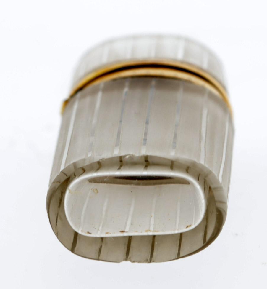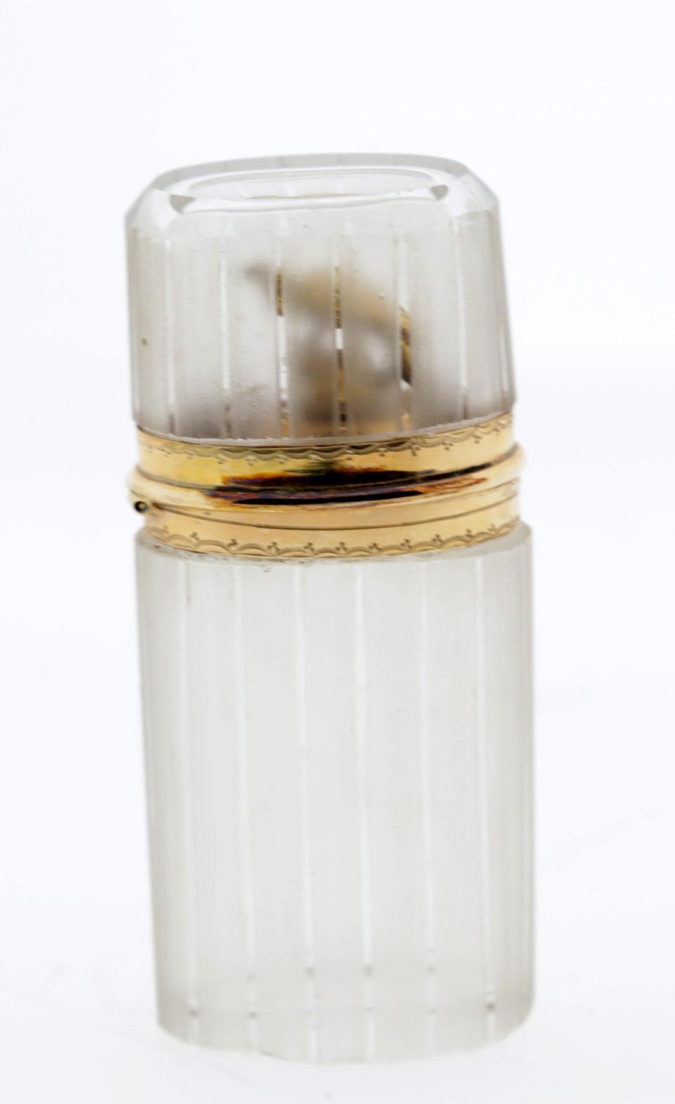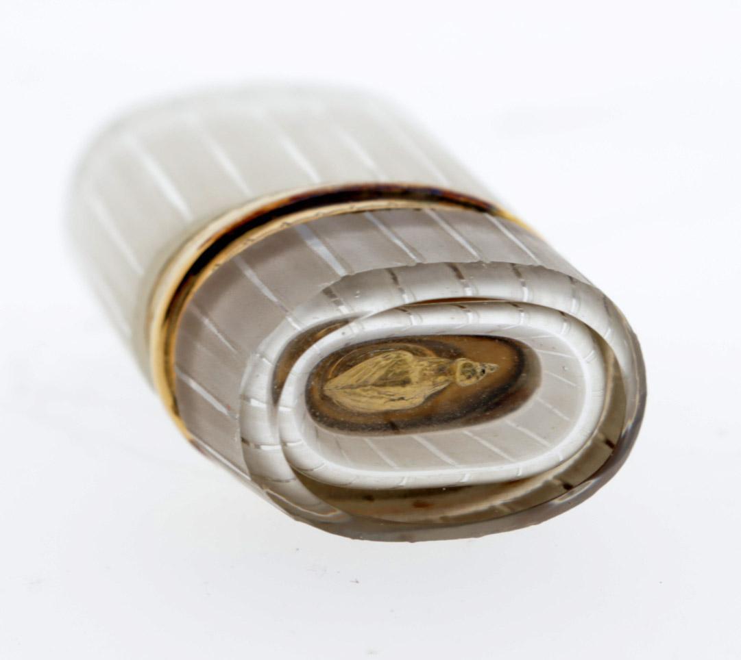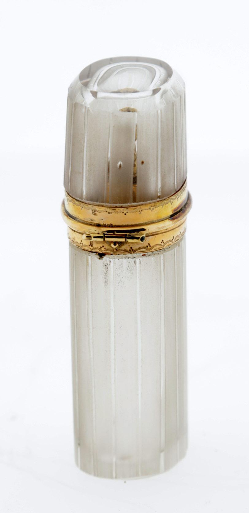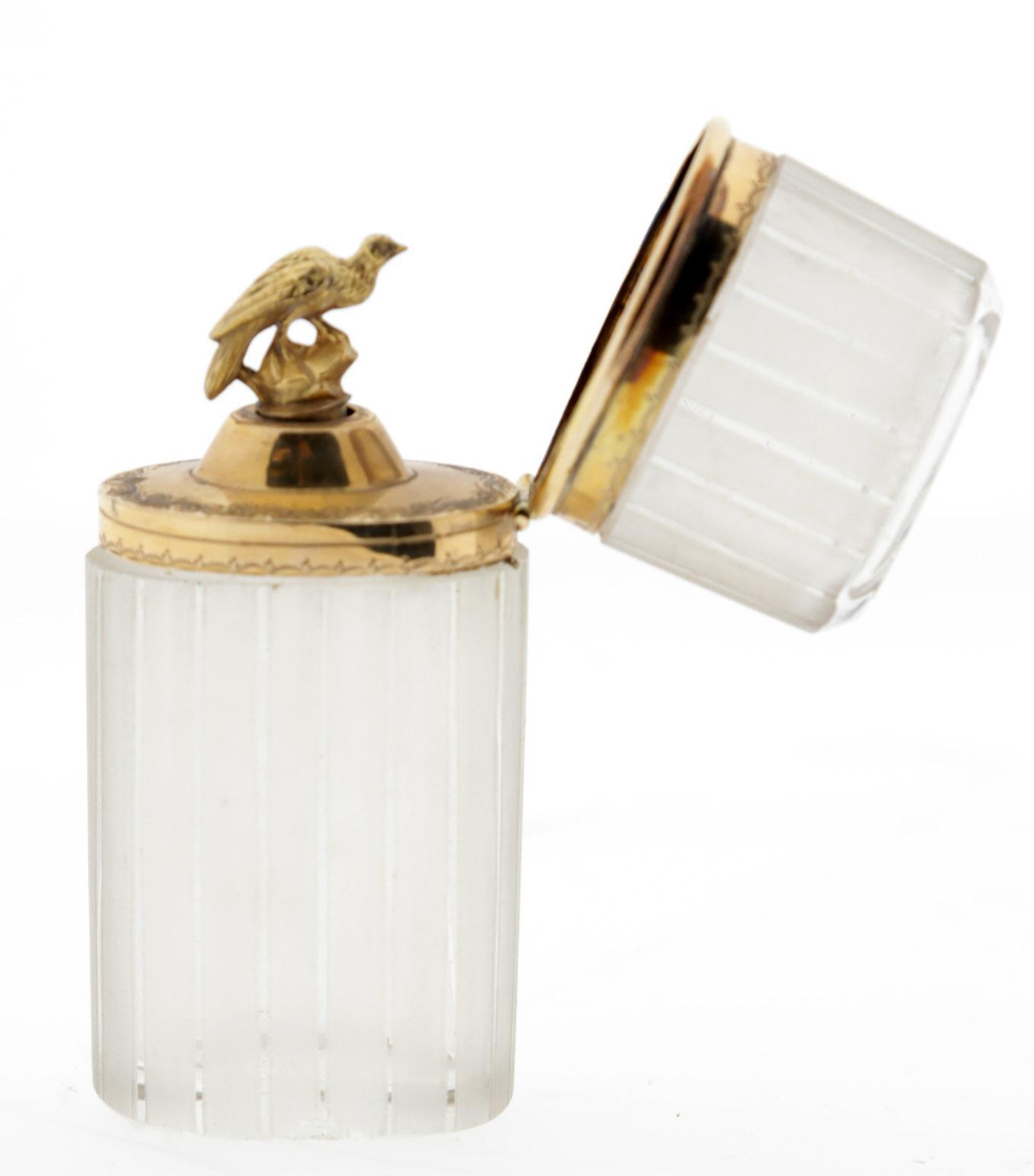 Antieke mat kristallen odeurflaocn met gouden monturen en stop i.v.v. een vogel, 7,5 cm.