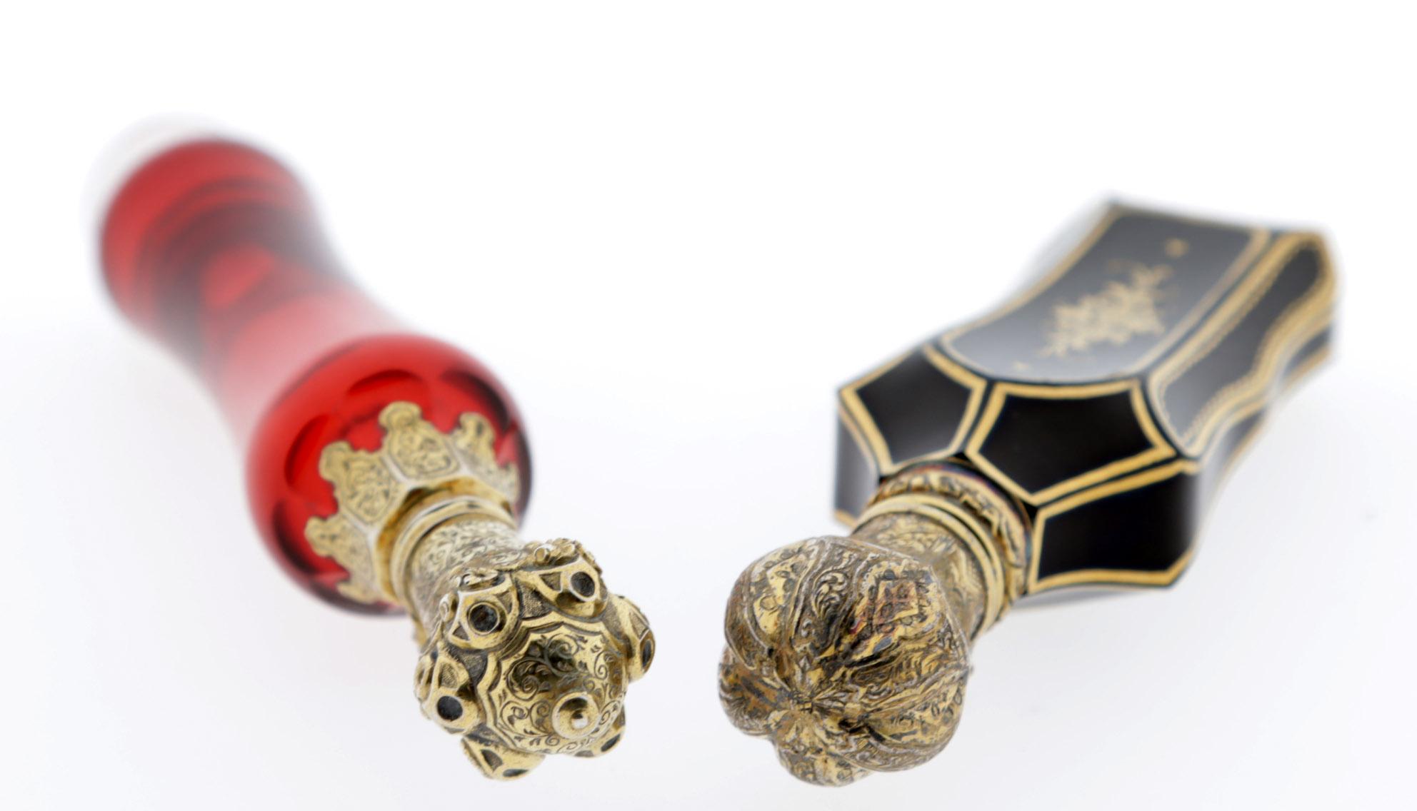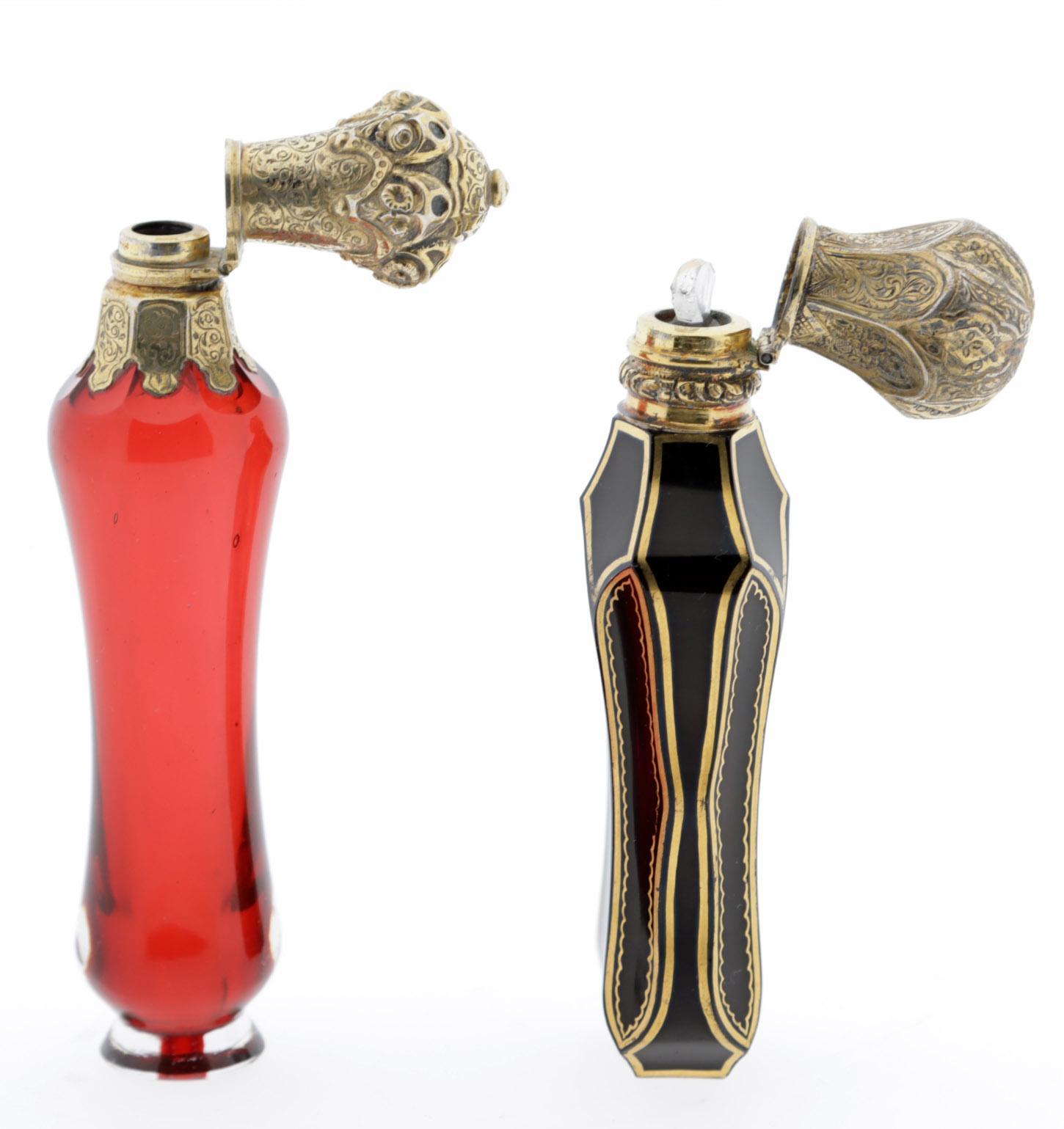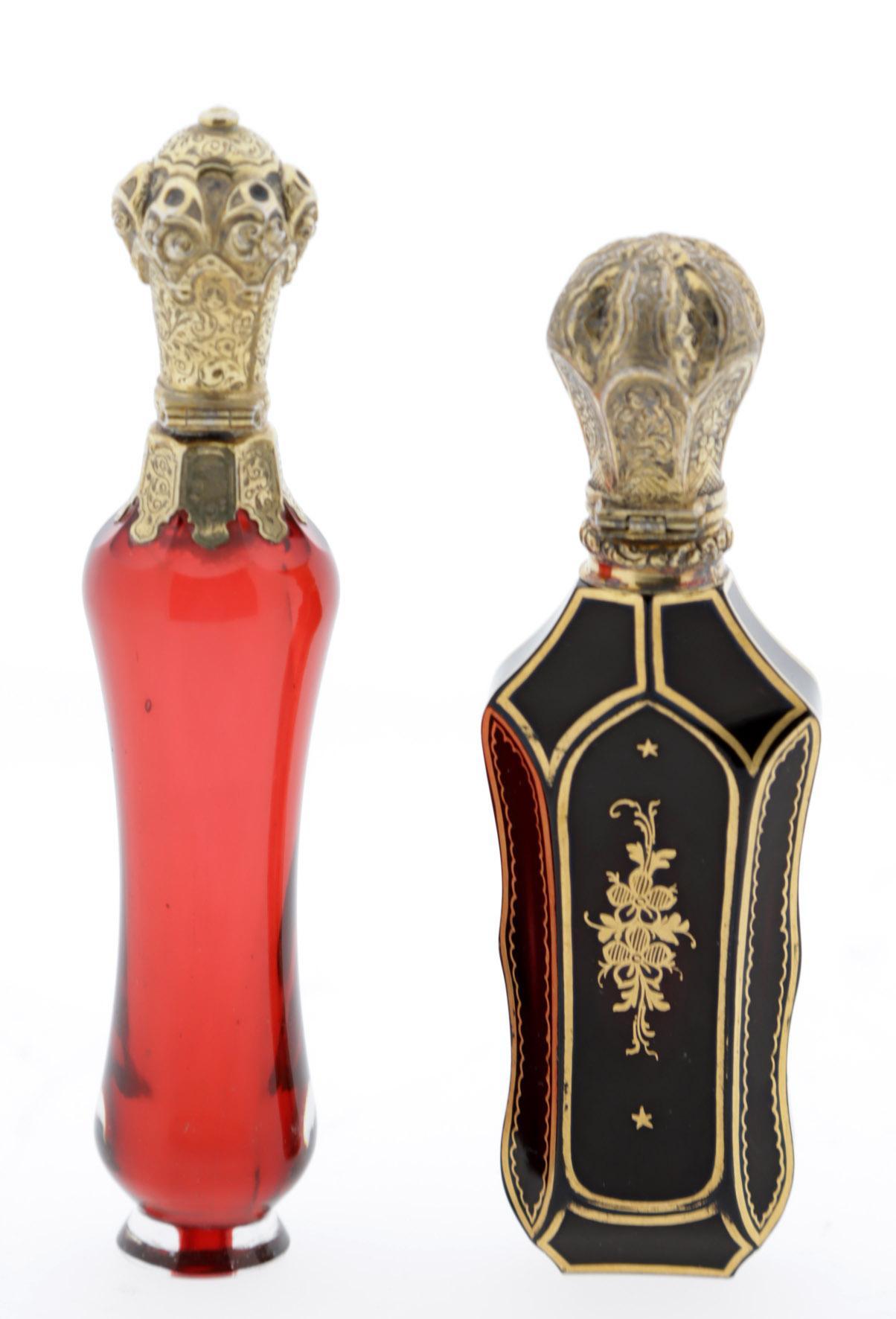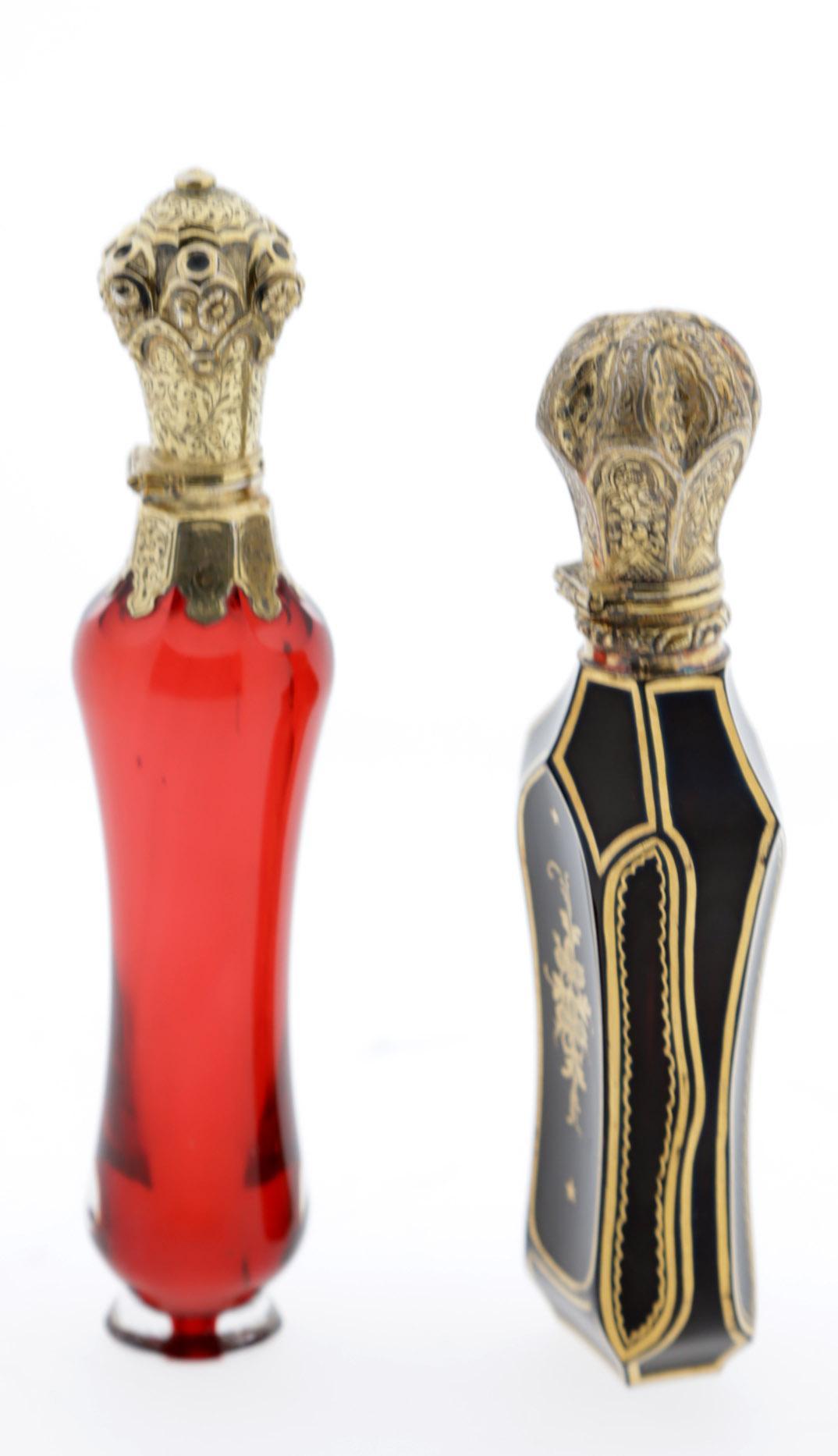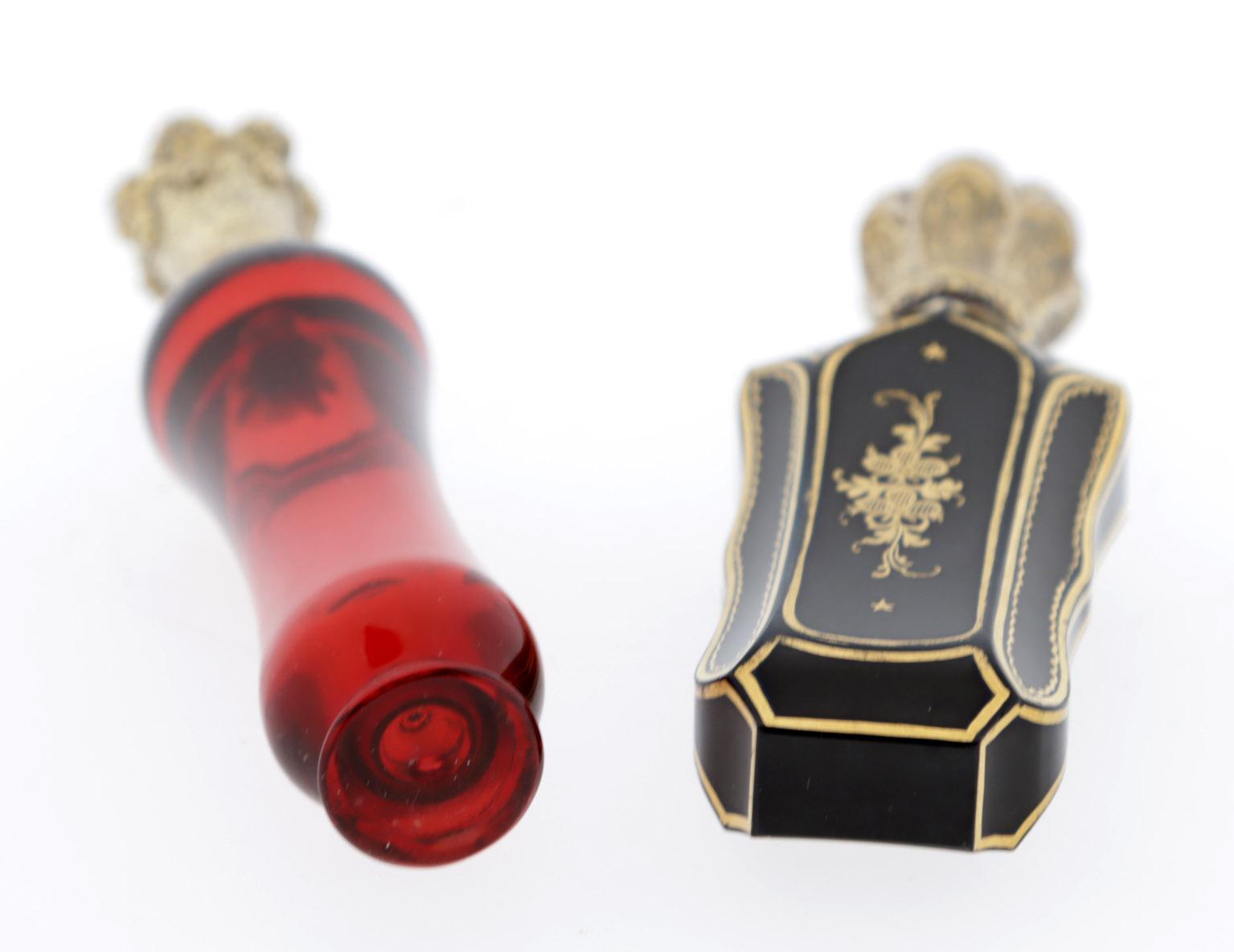 Antieke getailleerd zwart paarse odeurflacon met verguld zilver dop, Frankrijk ca.1850 en rood kristal met verguld zilveren dop, Frankrijk ca. 1860, h.11,5 en h.12,5 cm.
