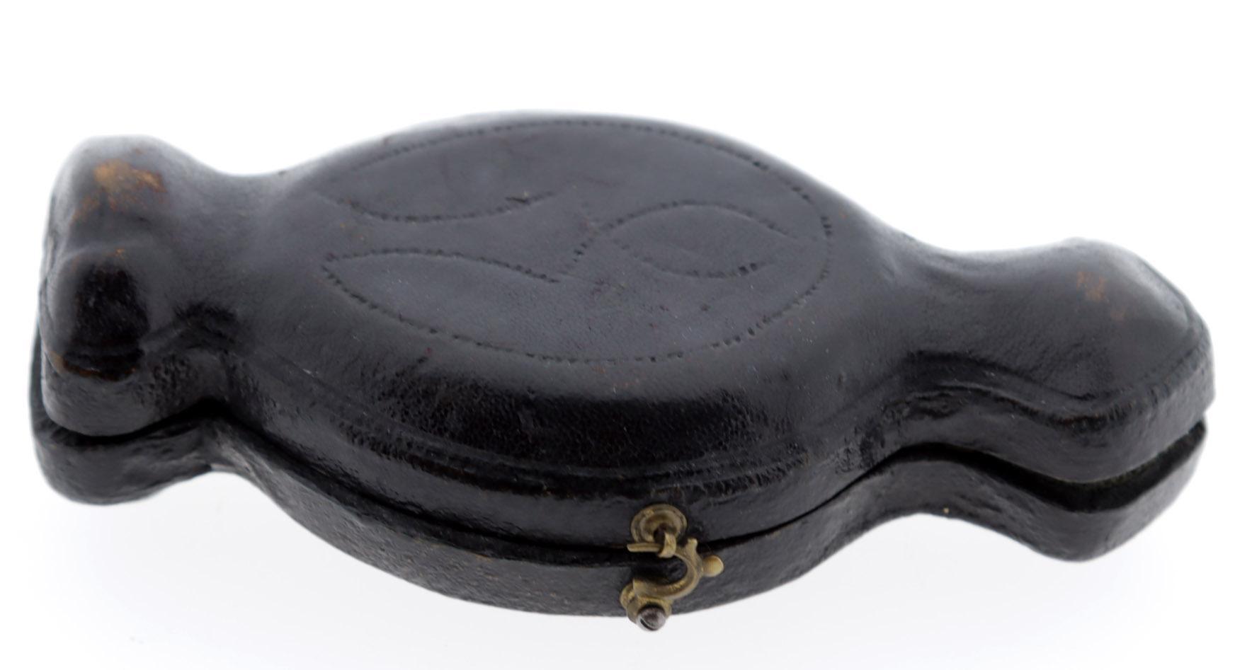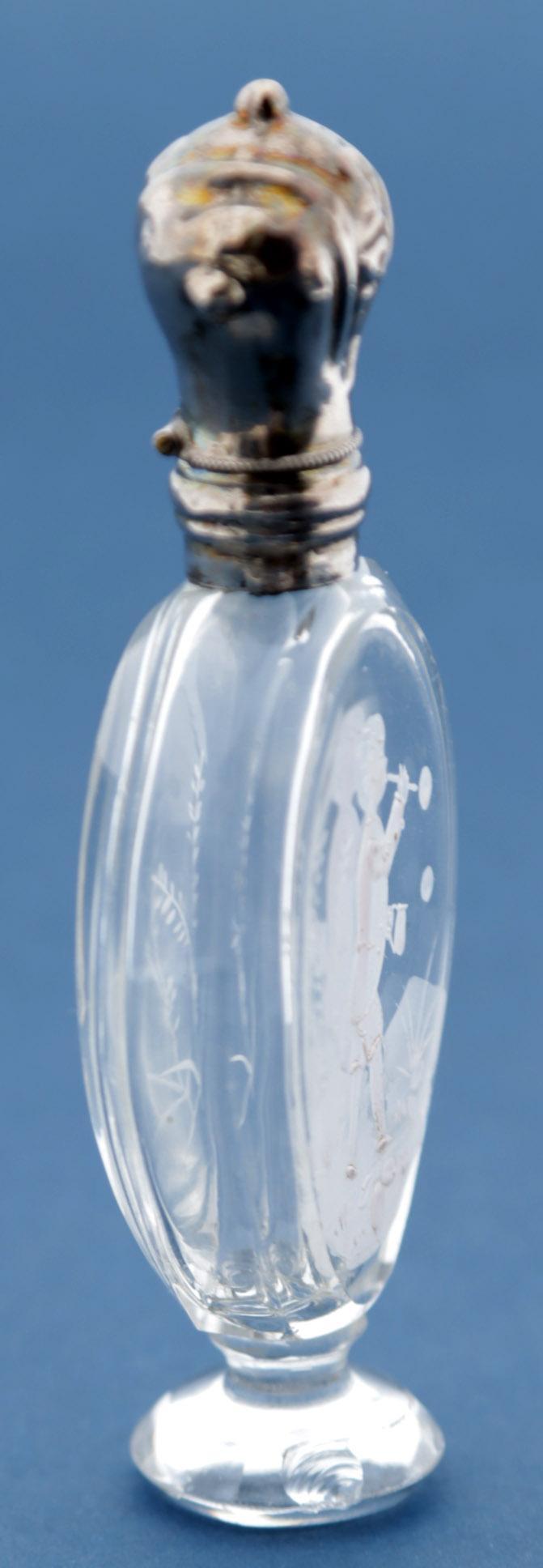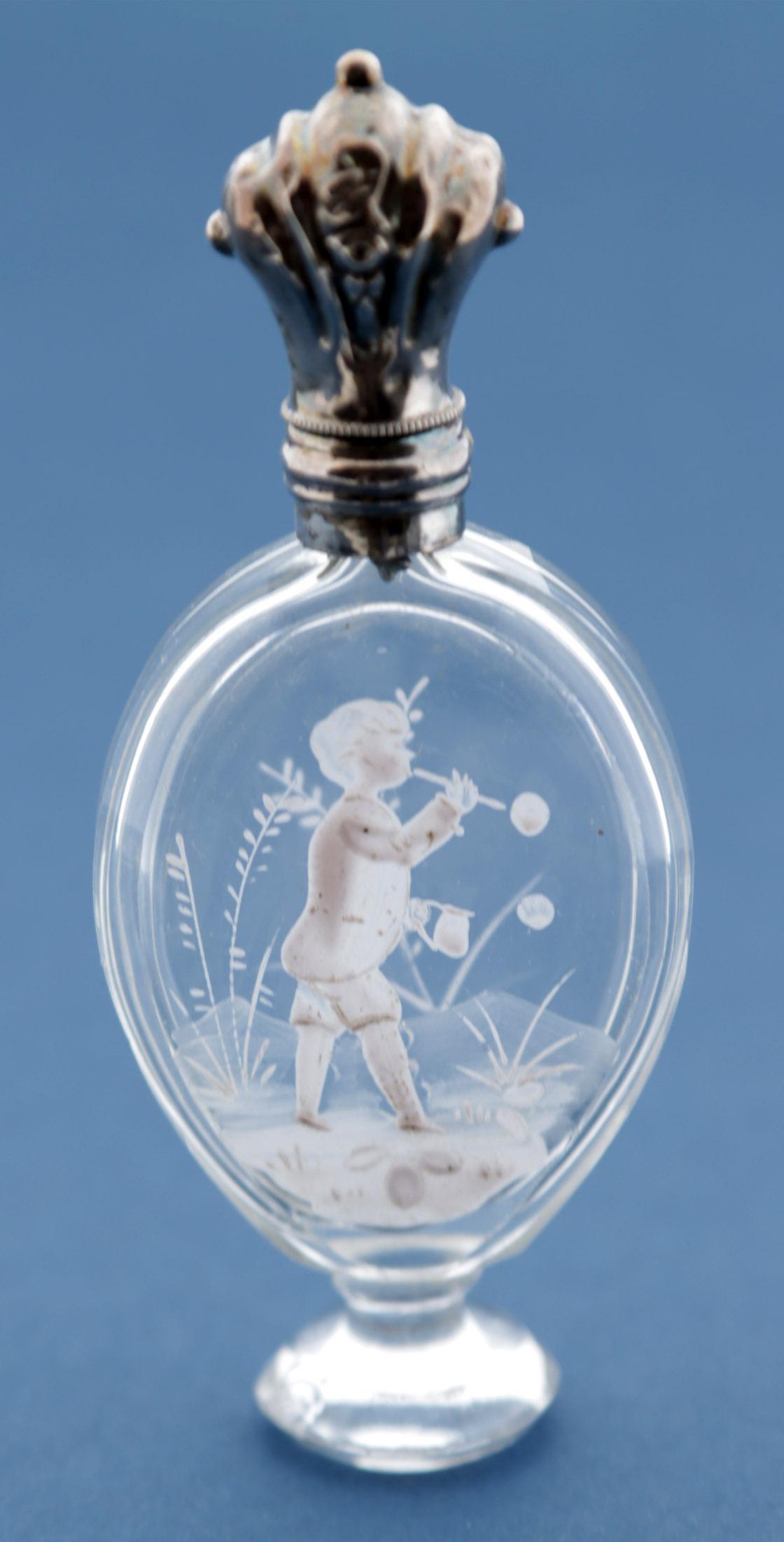 Met bellenblazend jongetje beschilderde kristallen odeurflacon, zgn. Mary Gregory, met zilveren dop, ca.1850 in origineel lederen foudraal