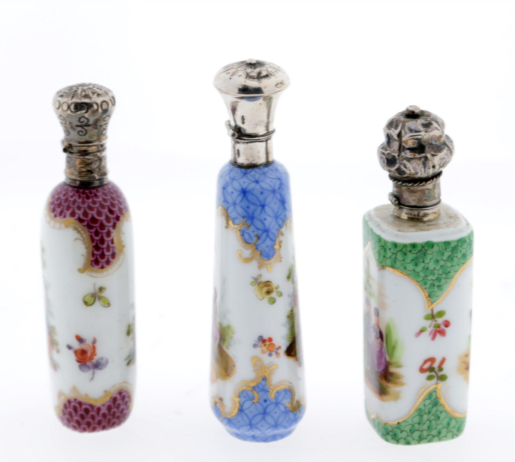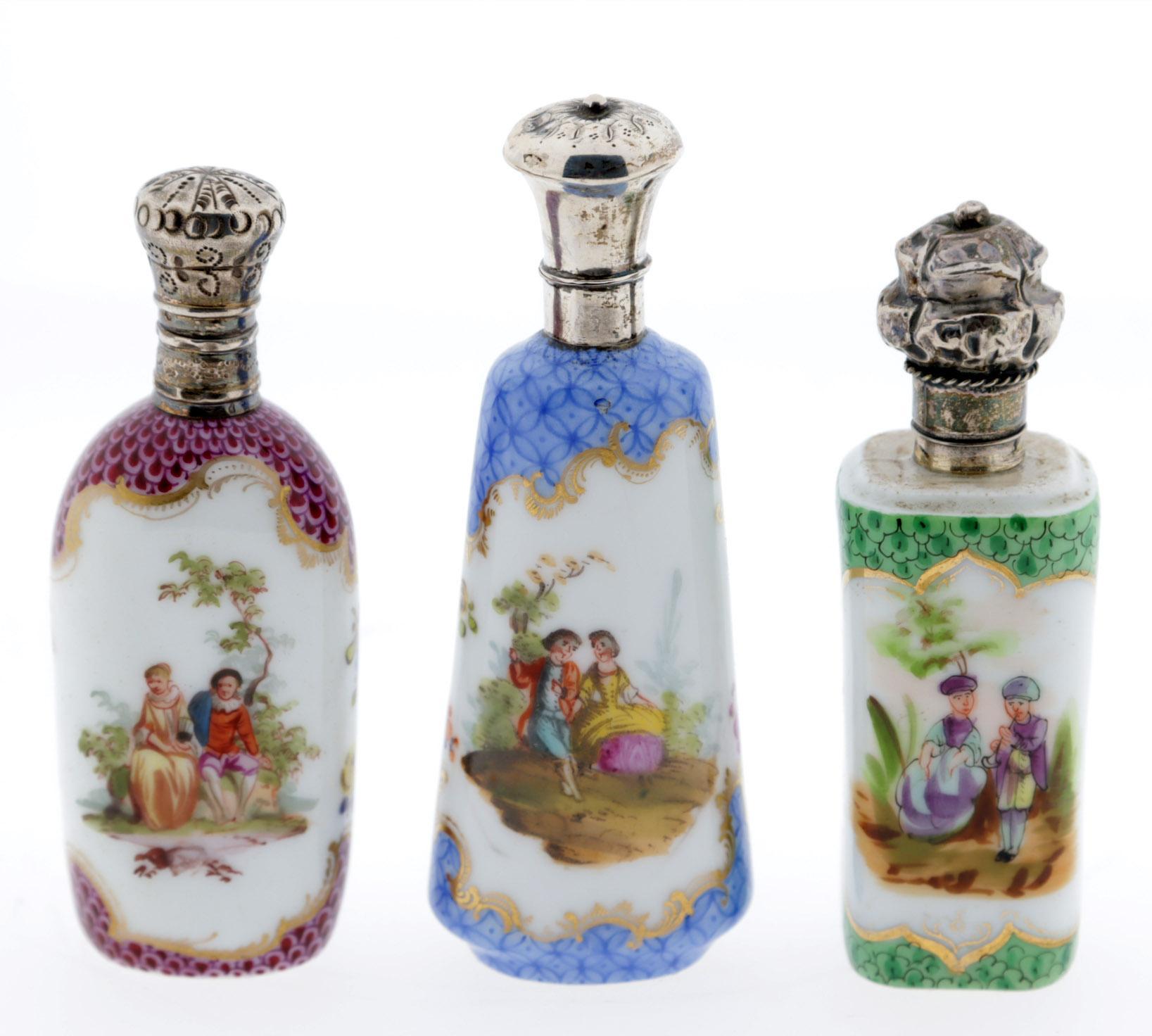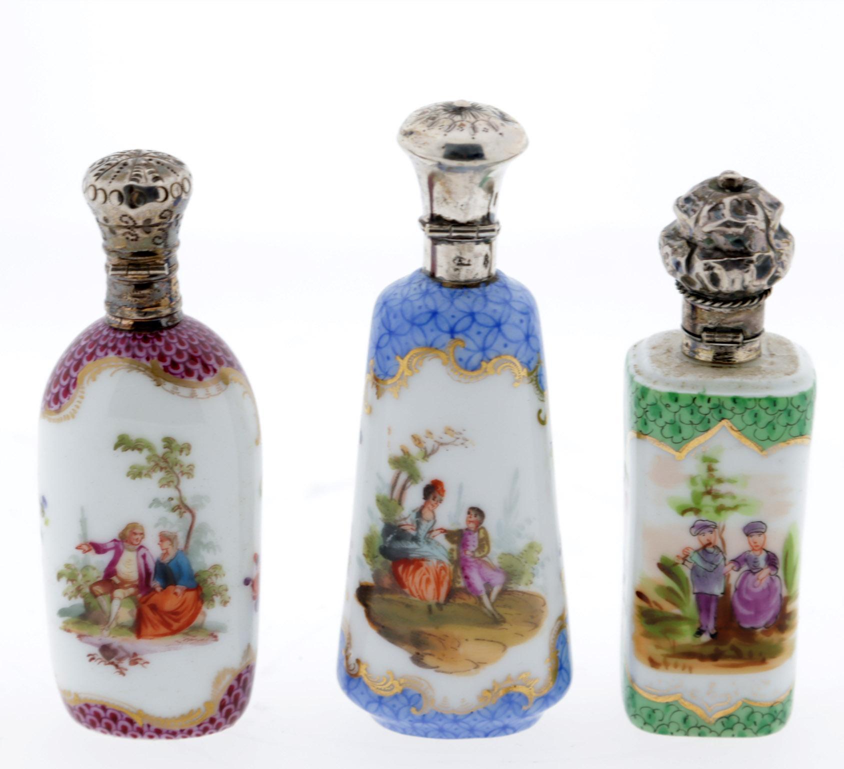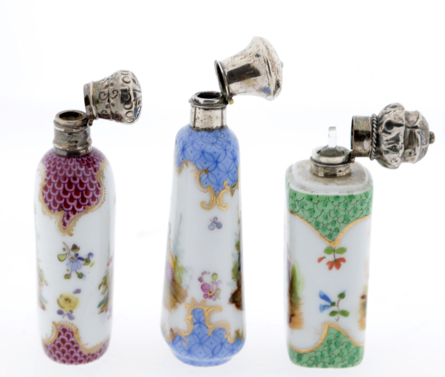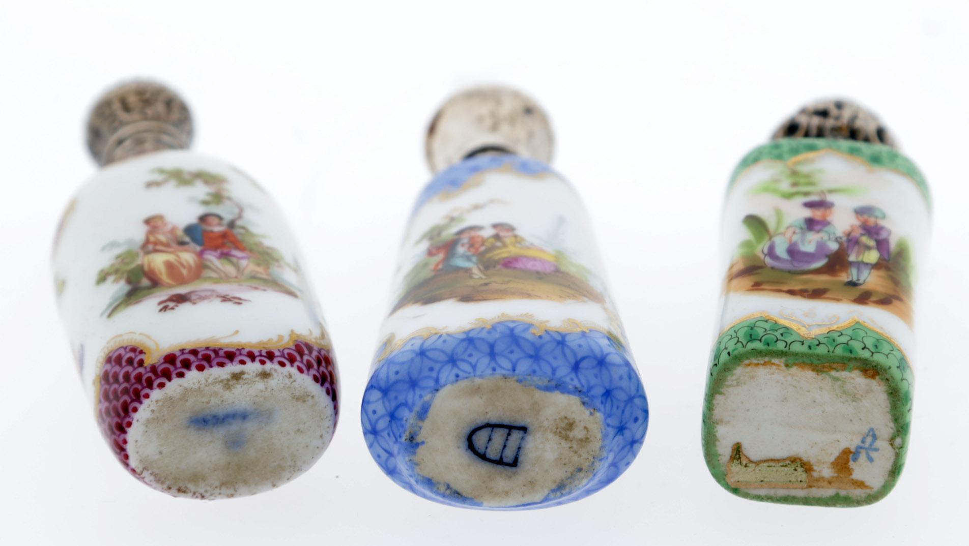 3 Met romantische taferelen beschilderde Duits porseleinen odeurflacons met zilveren doppen, h.10, h.9 en h.9 cm.