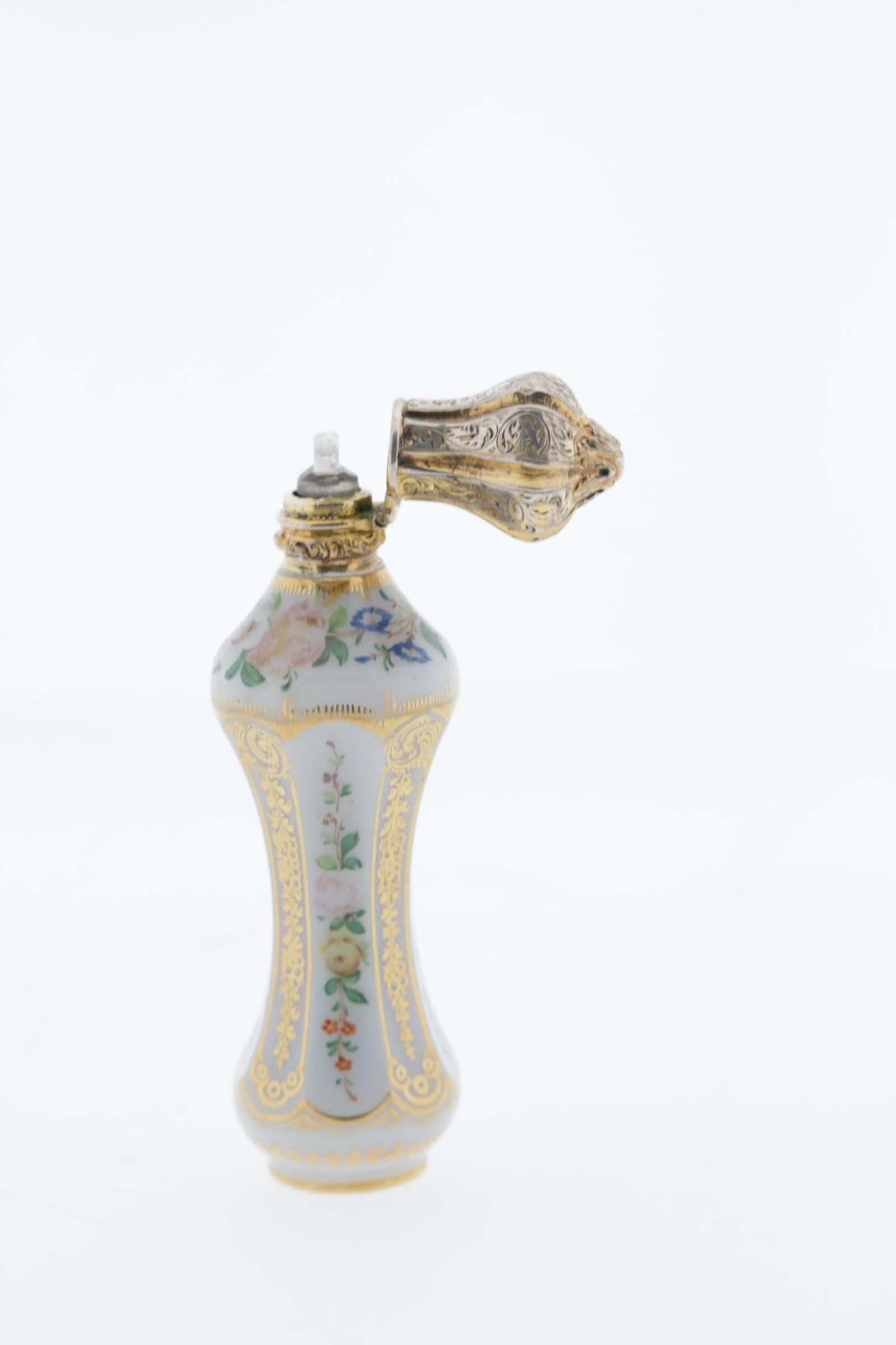 Antieke met bloemen gedecoreerde Frans porseleinen odeurflacon met verguld zilveren dop, 19e eeuw, h.11 cm.