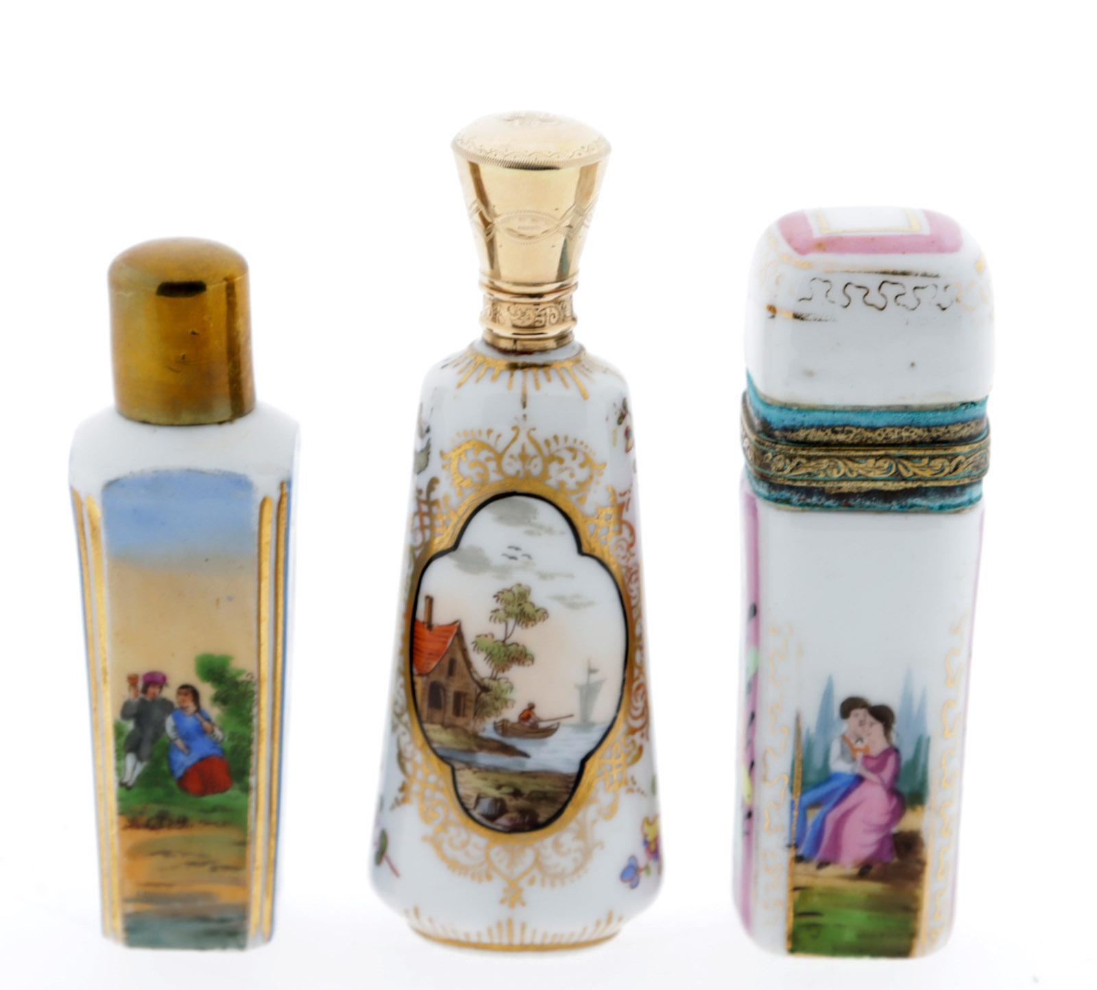3 Beschilderde porseleinen odeurflacons w.o. met gouden dop, h.10, h.8,5 en h.9 cm., 19e eeuw