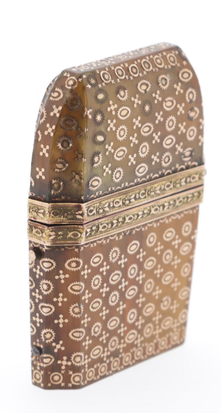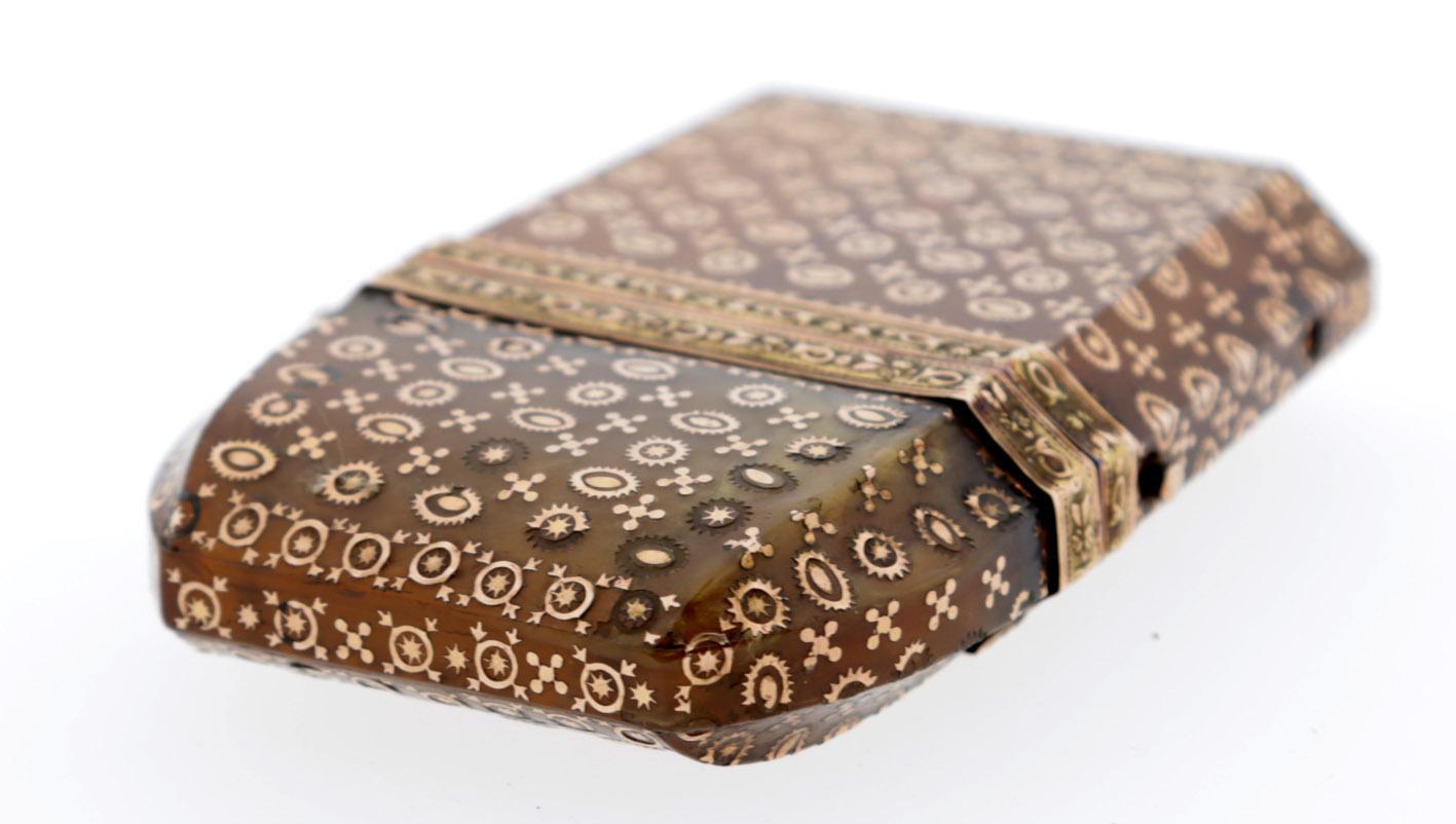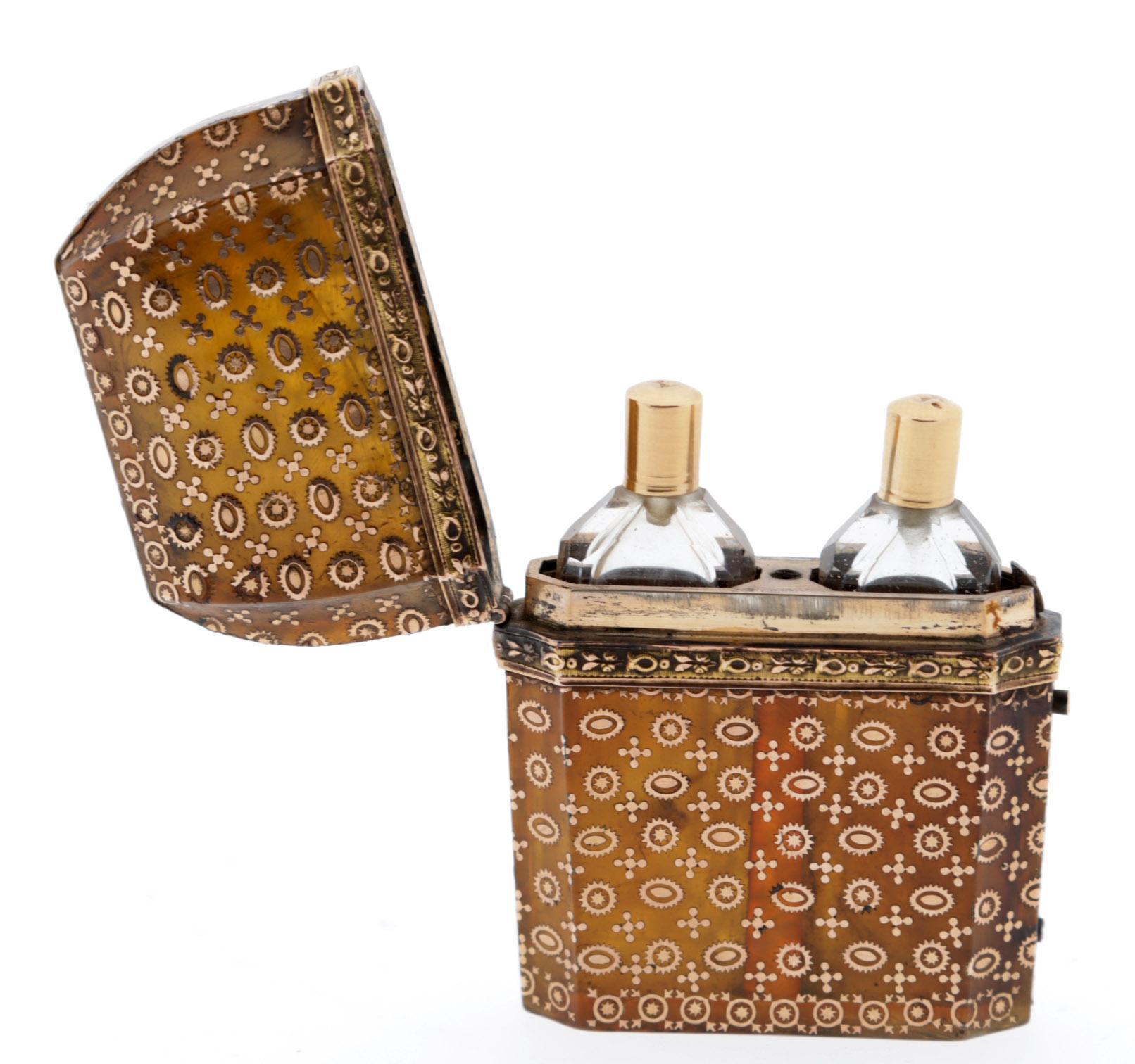 Antieke schildpad piqué doos met goud afgezet met inhoud van 2 kristallen flacons, Frankrijk, 18e eeuw, h.8 cm.