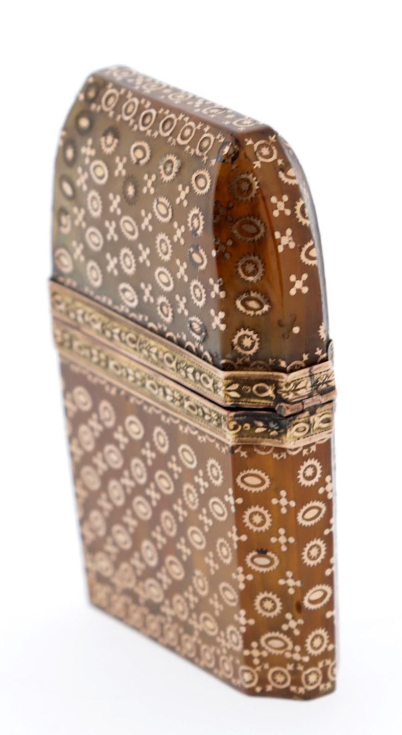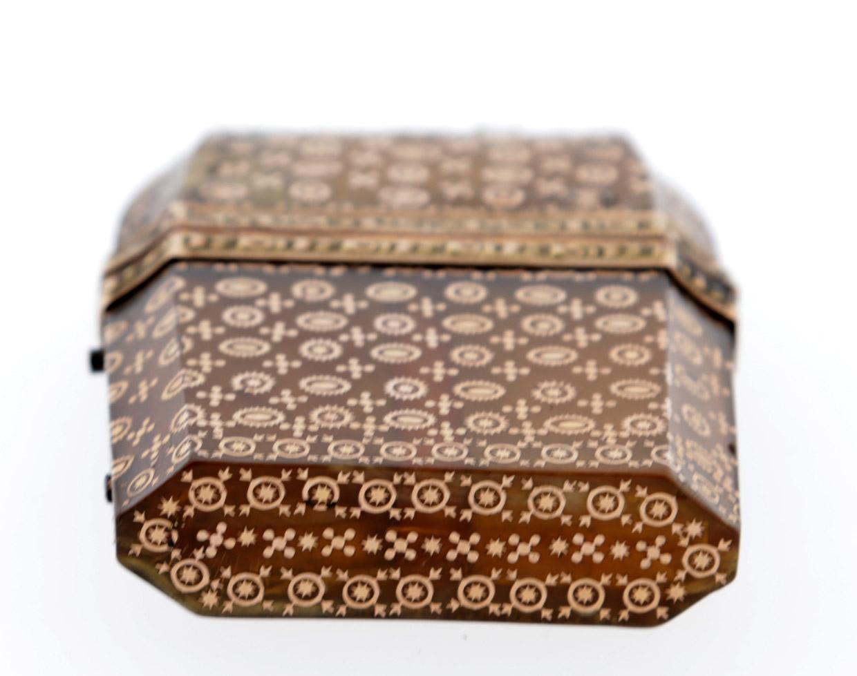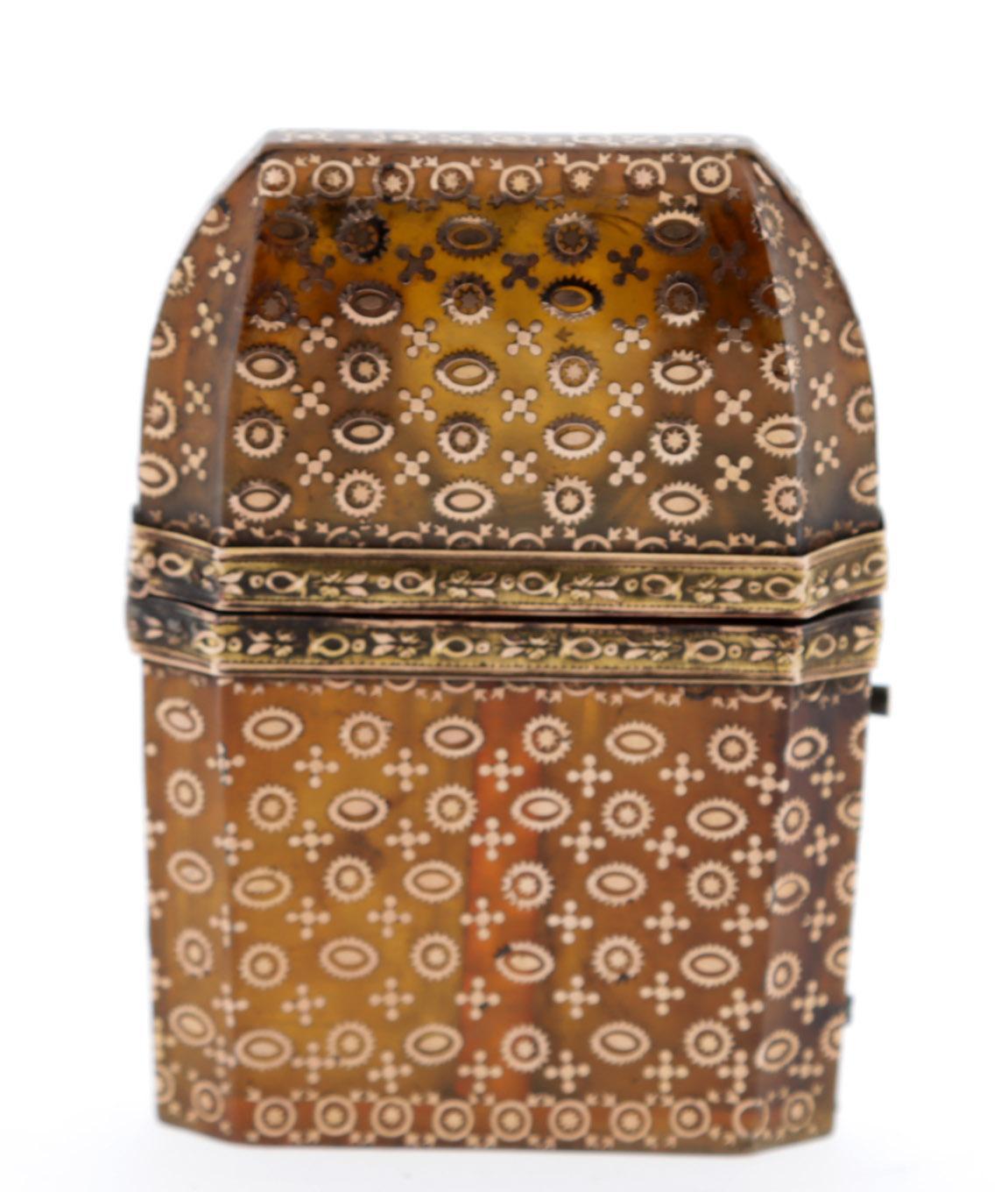 Antieke schildpad piqué doos met goud afgezet met inhoud van 2 kristallen flacons, Frankrijk, 18e eeuw, h.8 cm.