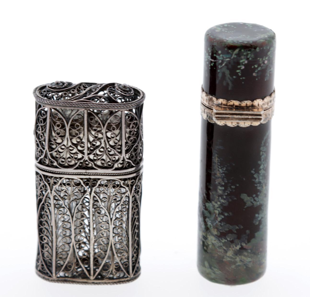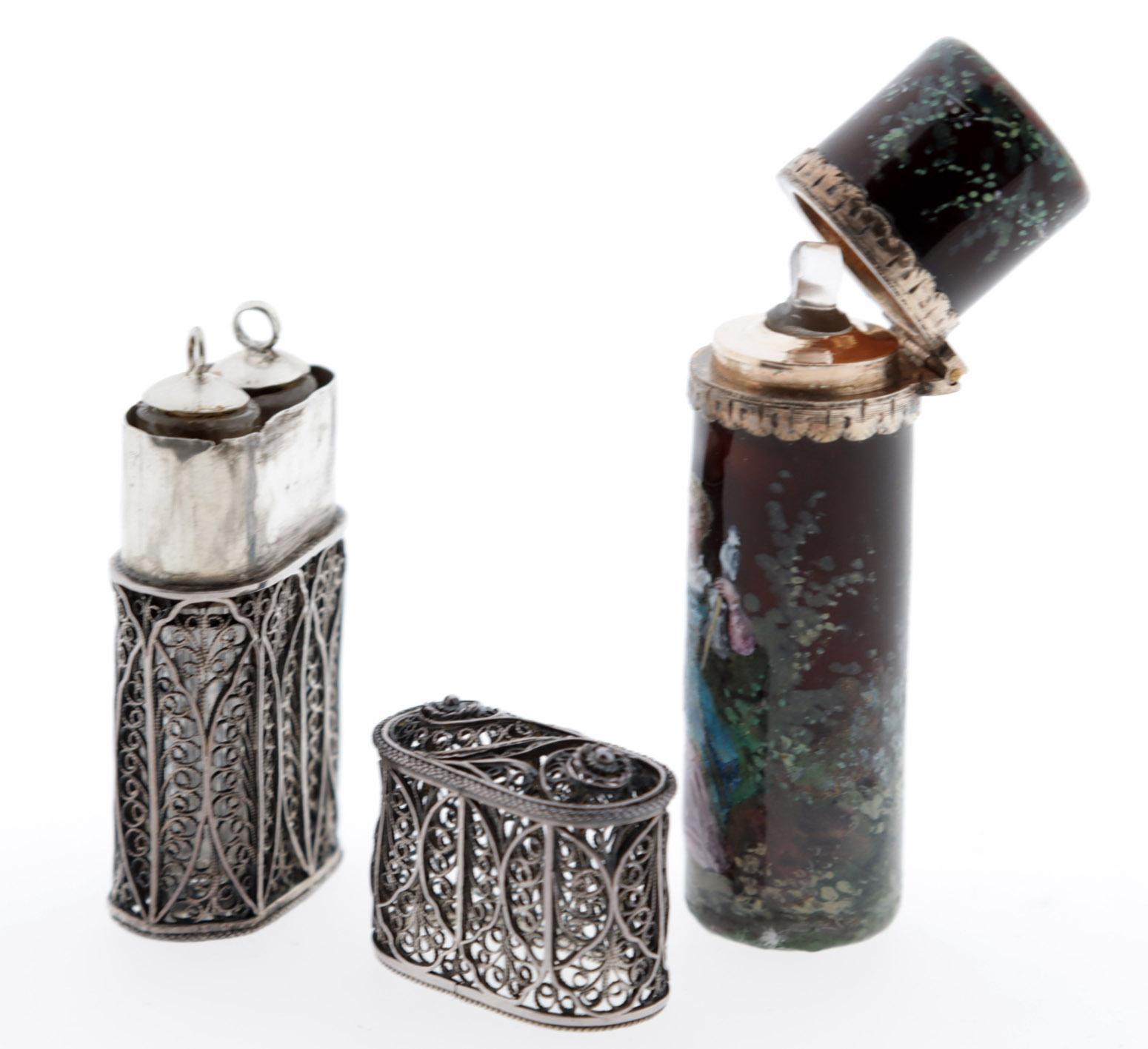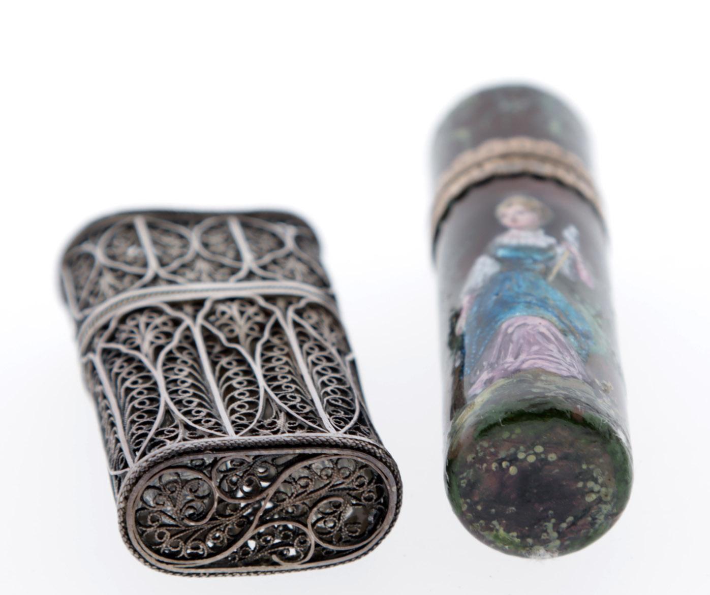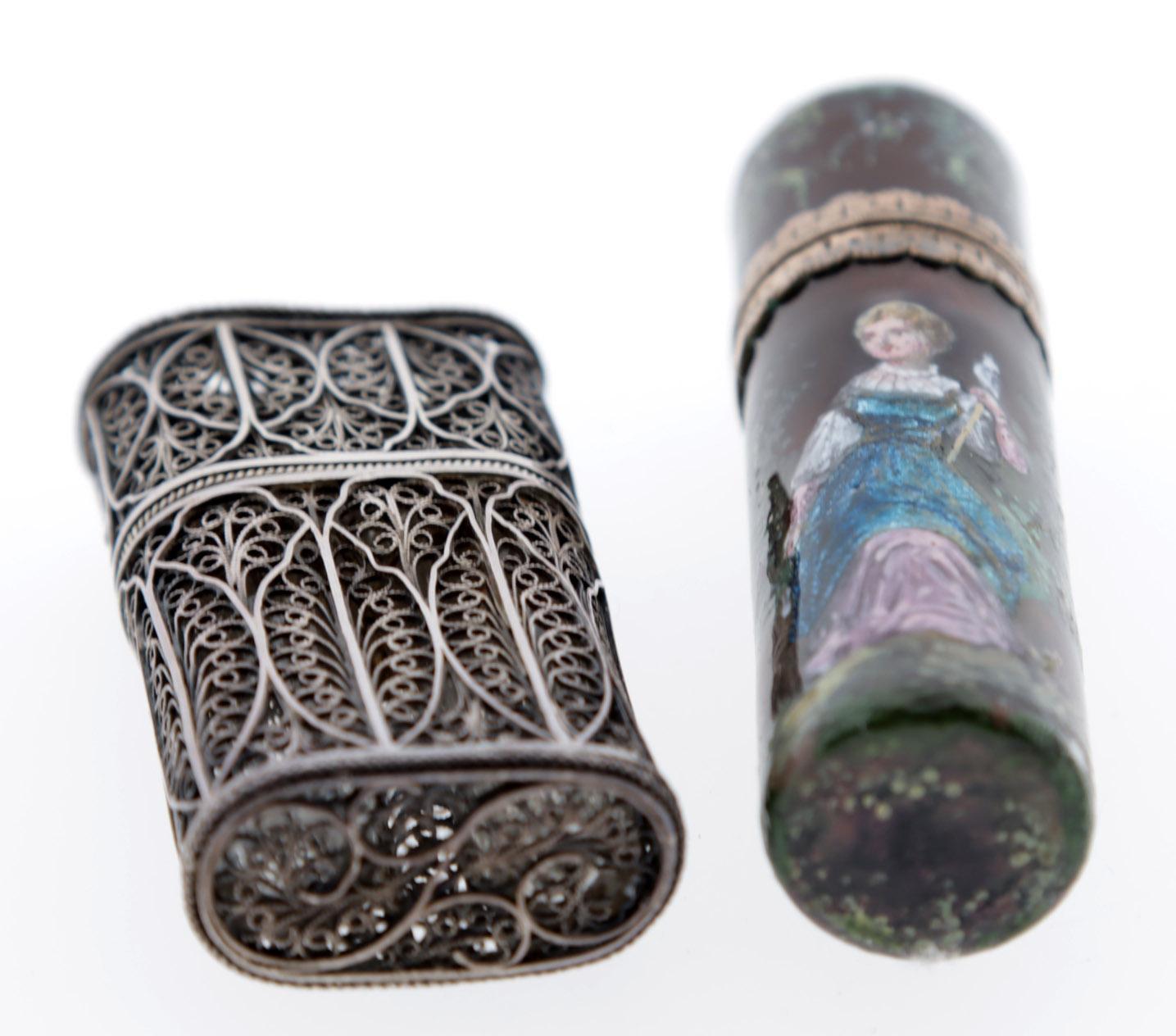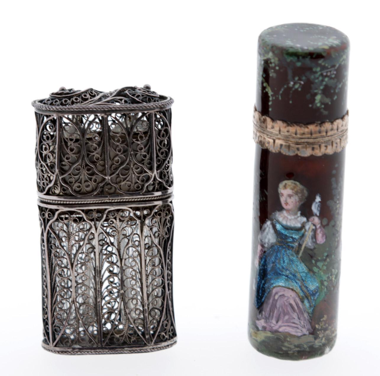 Filigrain zilveren odeurfleshouder, Frankrijk, 19e eeuw, h.5,5 cm en met dame beschilderde emaille deurflacon met verguld zilveren montuur, Frankrijk, 19e eeuw, h.6.5 cm.