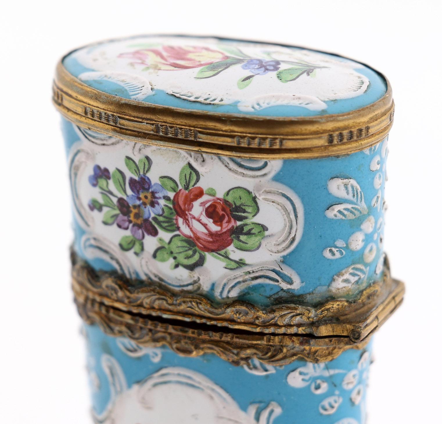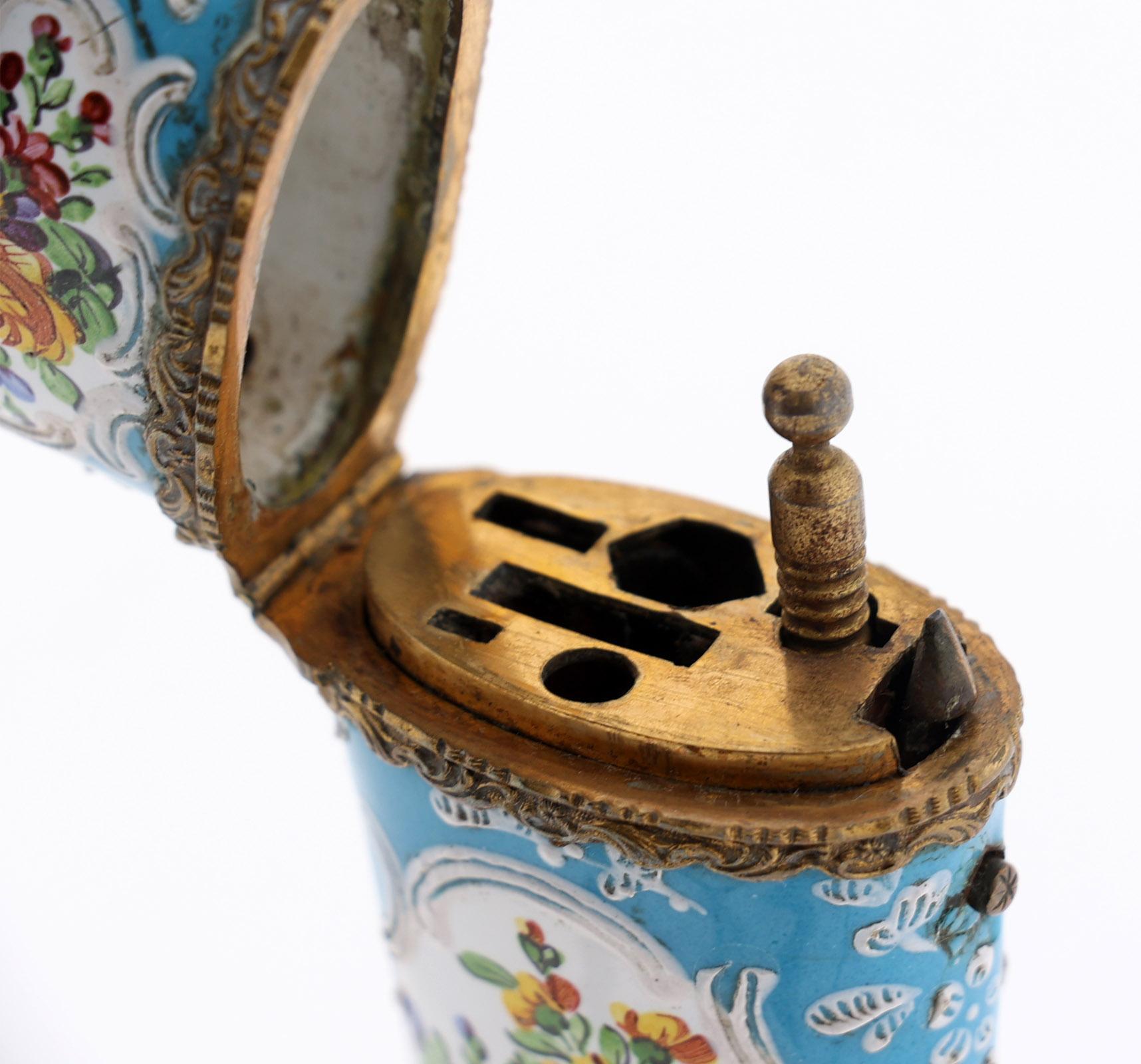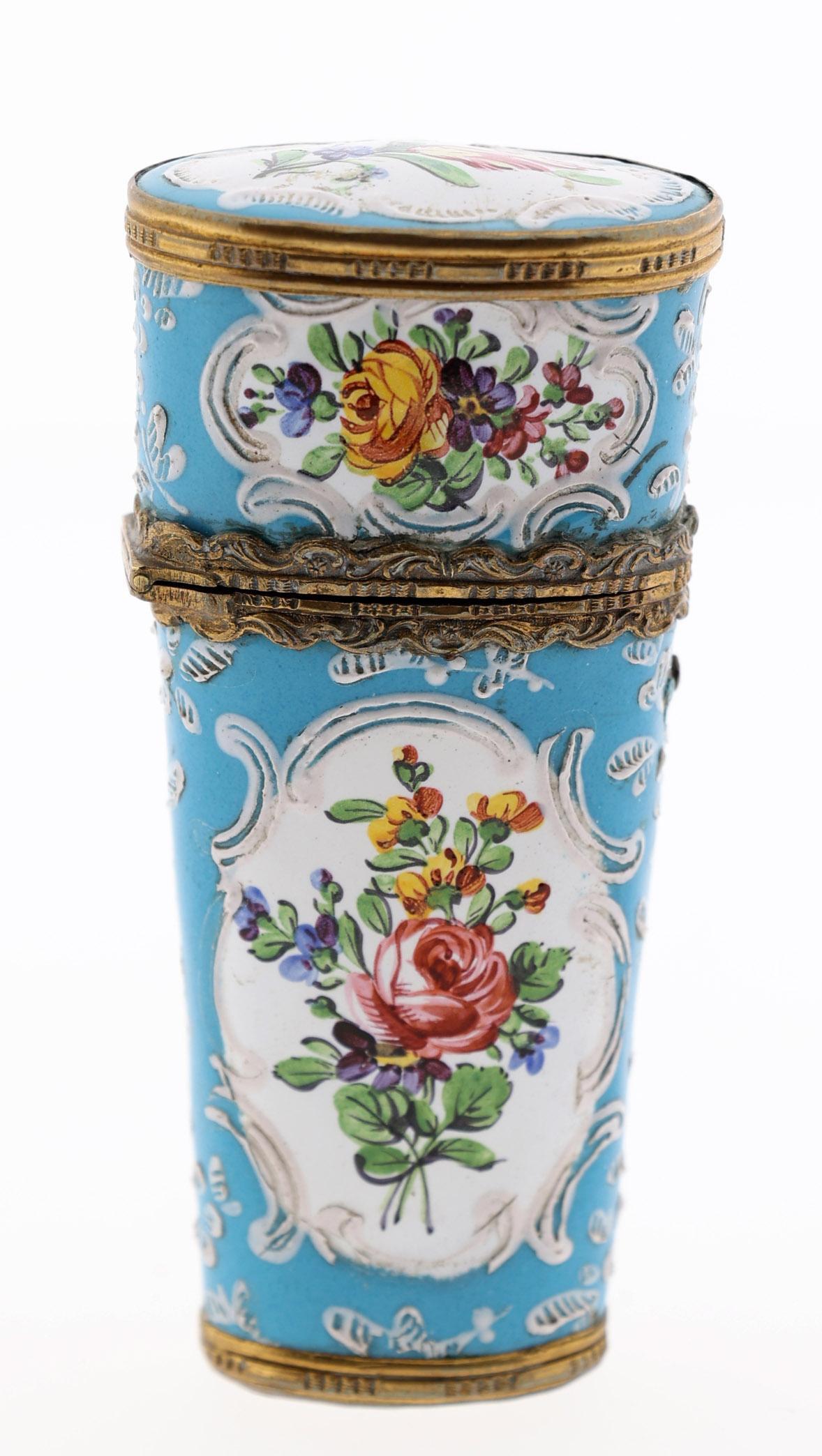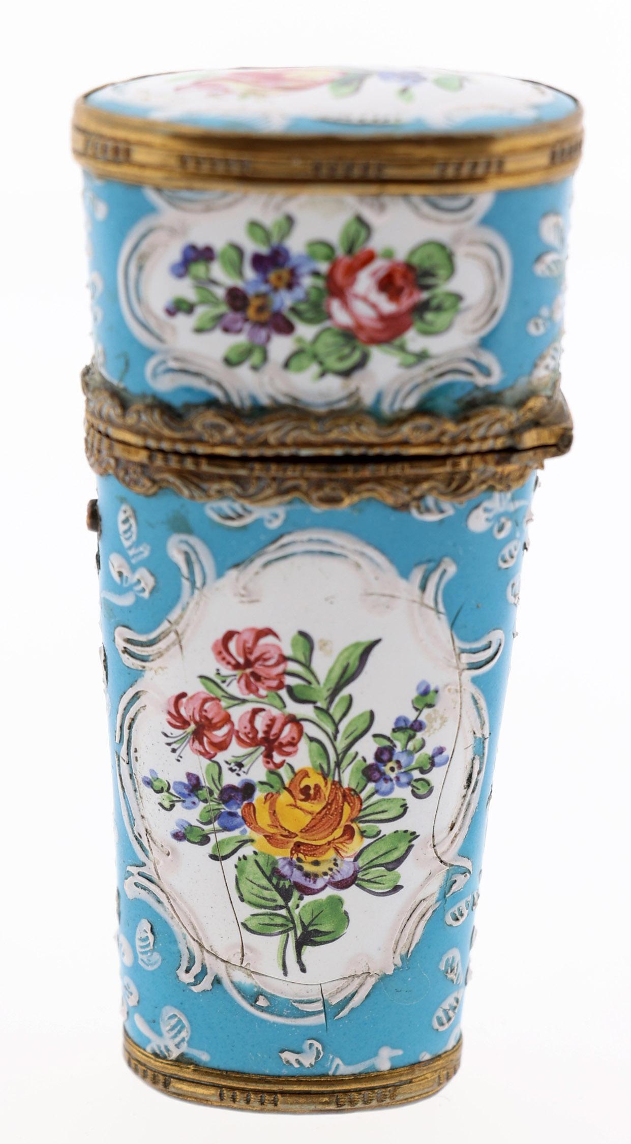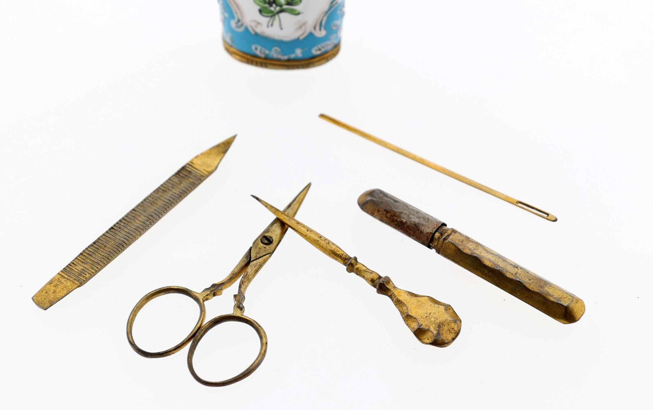 Antieke emaille met bloemen gedecoreerd verguld zilveren naaigarnituur, ca. 1780